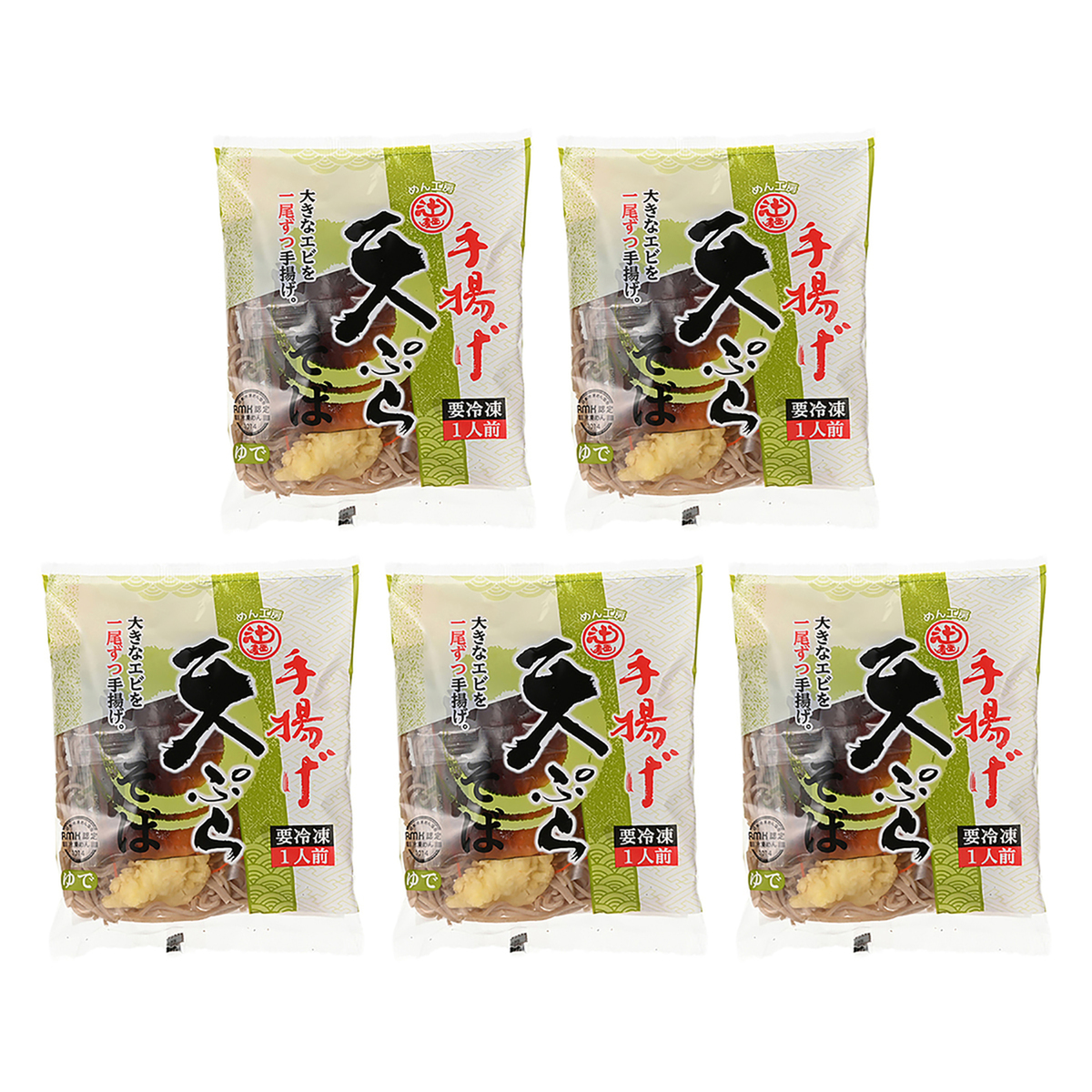 [アレルギー物質特定原材料8品目] 小麦、そば、えび [内容量] 287g(めん180g、つゆ70g、具材37g)×5食 [賞味期限] 出荷時点で賞味期限まで90日以上ある商品をお届けします [保存方法] 開封前:冷凍(-18℃以下)で保存してください 開封後:お早めにお召し上がりください [お召し上がり方] 1.濃縮スープを250ccの水又はお湯でうすめて、強火で沸騰させ、めんと具材(エビ天以外)を入れてください 2.エビ天は、500Wの電子レンジで約45秒温めてください。電子レンジを使わない場合は、エビ天を鍋の中に一緒に入れてください 3.めんがほぐれてきたら、箸で軽くほぐして下さい 4.約1分位で解凍し、自然にほぐれて再沸騰すれば出来上がりです 5.器に盛り付けて、お好みでゆず粉末をかけてお召し上がり下さい ※自然解凍は、絶対にしないでください ※シートは調理前に必ず取り除いてください [注意事項] ※自然解凍は、絶対にしないでください ※シートは調理前に必ず取り除いてください ※解凍時の熱湯によるヤケドにご注意ください ※一旦解凍したものを再び冷凍しますと品質、味が落ちますのでお避けください [原料原産地] 小麦粉(国内製造) [原産国] 日本 [原材料] めん(小麦粉(国内製造)、そば粉、やまいも/加工でん紛)、つゆ(混合だし(削りぶし(さば、かつお)、昆布)、和風調味料(たん白加水分解物、発酵調味料、砂糖、食塩、しょうゆ、削りぶし(かつお、さば、そうだかつお)、昆布エキス、にぼし、酵母エキス、醸造酢、かつおぶしエキス)、和風調味料(しょうゆ、砂糖、みりん、削りぶし(かつお、そうだかつお、 さばかれぶし、さば)、食塩、発酵調味料、酵母エキス、醸造酢))、具材(えび天ぷら、ねぎ、かまぼこ/膨張剤、加工でん粉、pH調整剤、調味料(アミノ酸等)、グリシン、着色料(クチナシ、カロチン、コチニール))、(一部に小麦・そば・えび・やまいも・大豆・さば・ゼラチンを含む)