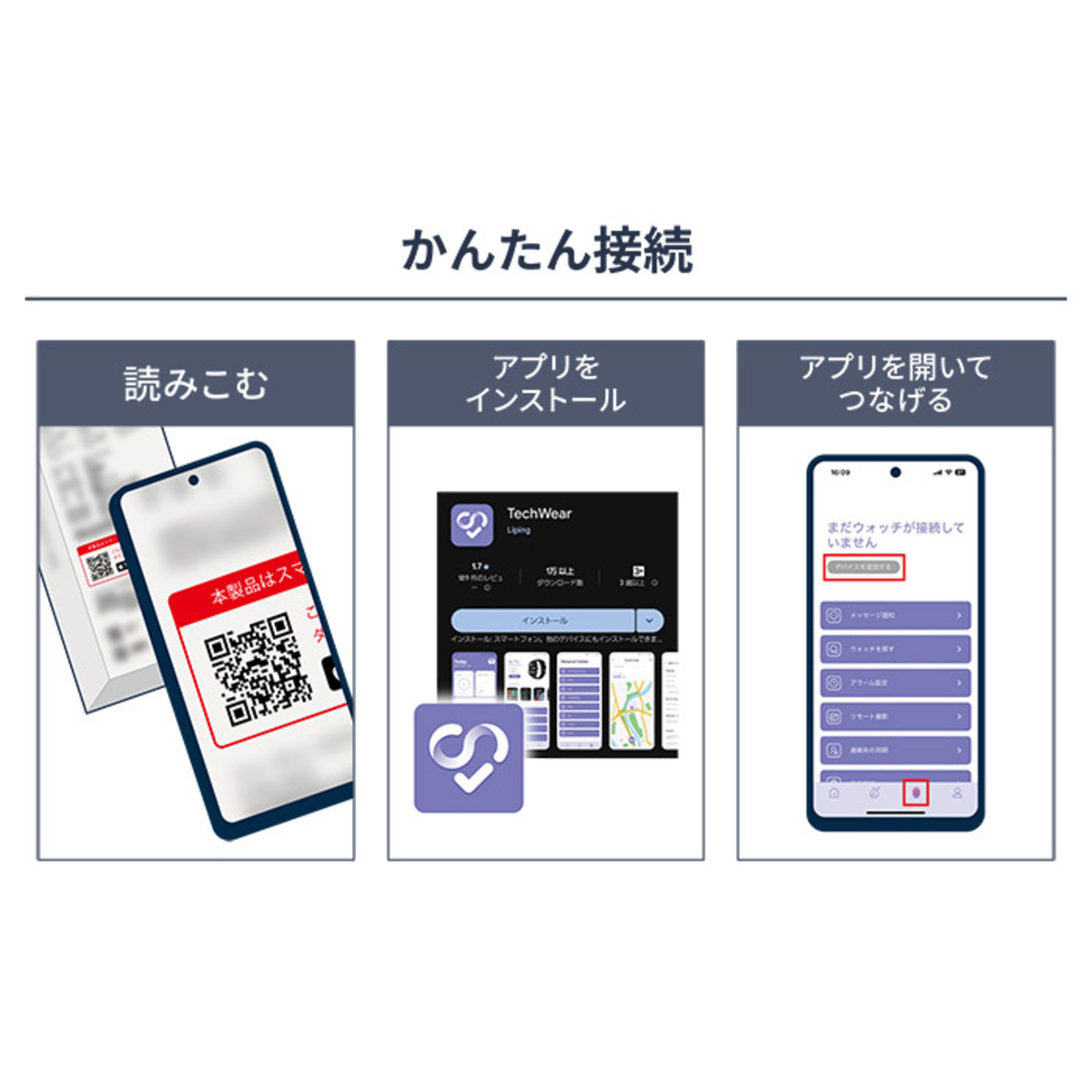 [サイズ] 約25.2×3.6×1.1cm [重量] 約40g [充電時間] 約2.5時間充電で3〜5日間(スマホ接続時)使用可能 [対応スマートフォンのOS] iOS9.0以上、Android5.0以上 [使用方法] ※操作手順は、同封のスタートアップガイドとホームページの取扱説明書を参考に行って下さい [お手入れ] ・充電端子および磁力部を定期的に清掃して下さい(充電端子部には磁石が使用されているため、鉄紛などが付着した場合に接触不良となる可能性があります) ・高温・低温の環境での使用や放置を避けて下さい ・長期間使用しない場合は、内蔵バッテリーの劣化を防ぐために定期的に充電して下さい ・本製品は精密機器です。過度な衝撃や強い圧力をかけないで下さい ・皮膚に異常を感じた場合は、すぐに使用を中止して下さい ・乳幼児の手の届かない場所に保管して下さい ・化学薬品や洗剤が付着しないよう注意して下さい ■取り扱い説明を充分にご確認の上、ご使用下さい 【中国製】 [注意事項] ※本製品はスマートフォンとの連携が必要です。Google PlayまたはApp Storeより専用アプリ「Tech Wear」をダウンロードして下さい ※スマートフォンが「スマートウォッチ01」の対応機種ではない場合、スマートウォッチの利用ができません ※ACアダプターは付属しません ※対応スマートフォンのOSはiOS9.0以上、Android5.0以上となります ※本製品はリチウムイオン電池を含んでいます ※本製品に衝撃を与えないで下さい ※本製品は、IP68 の防水性能、防塵性能に準拠するよう設計さていますが、完全な防水または防塵ではありません。防水および防塵性能は永久的には持続せず、時間の経過に伴って、通常の使用による摩耗、デバイスの修理、分解、損傷によって徐々に低下または消失します。水泳など水圧がかかる場合やお風呂などの熱湯では、使用しないことをお勧めします ※本製品を高温多湿となる場所に放置しないで下さい。故障やリチウムイオン電池の膨張、発熱、発火など思わぬ事故が発生する可能性があります ※充電には付属の専用充電ケーブルを使用し、1A以上の出力のPSE適合充電器をご利用下さい ※リチウムイオン電池は消耗品のため劣化は保証対象外です。リチウムイオン電池の急激な劣化を防ぐために、こまめに充電して下さい ※電池が消耗した状態で長時間放置しない ※充電状態のまま放置しない ※本製品を分解しないで下さい。分解すると保証対象外となるだけでなく、分解中に思わぬ事故が発生する可能性があります ※本製品を廃棄する場合には、お住いの自治体のルールに従って廃棄して下さい ※装着時にいつもとは異なる異常(発熱、異音、臭いなど)を感じた場合には直ちに使用を中止して下さい