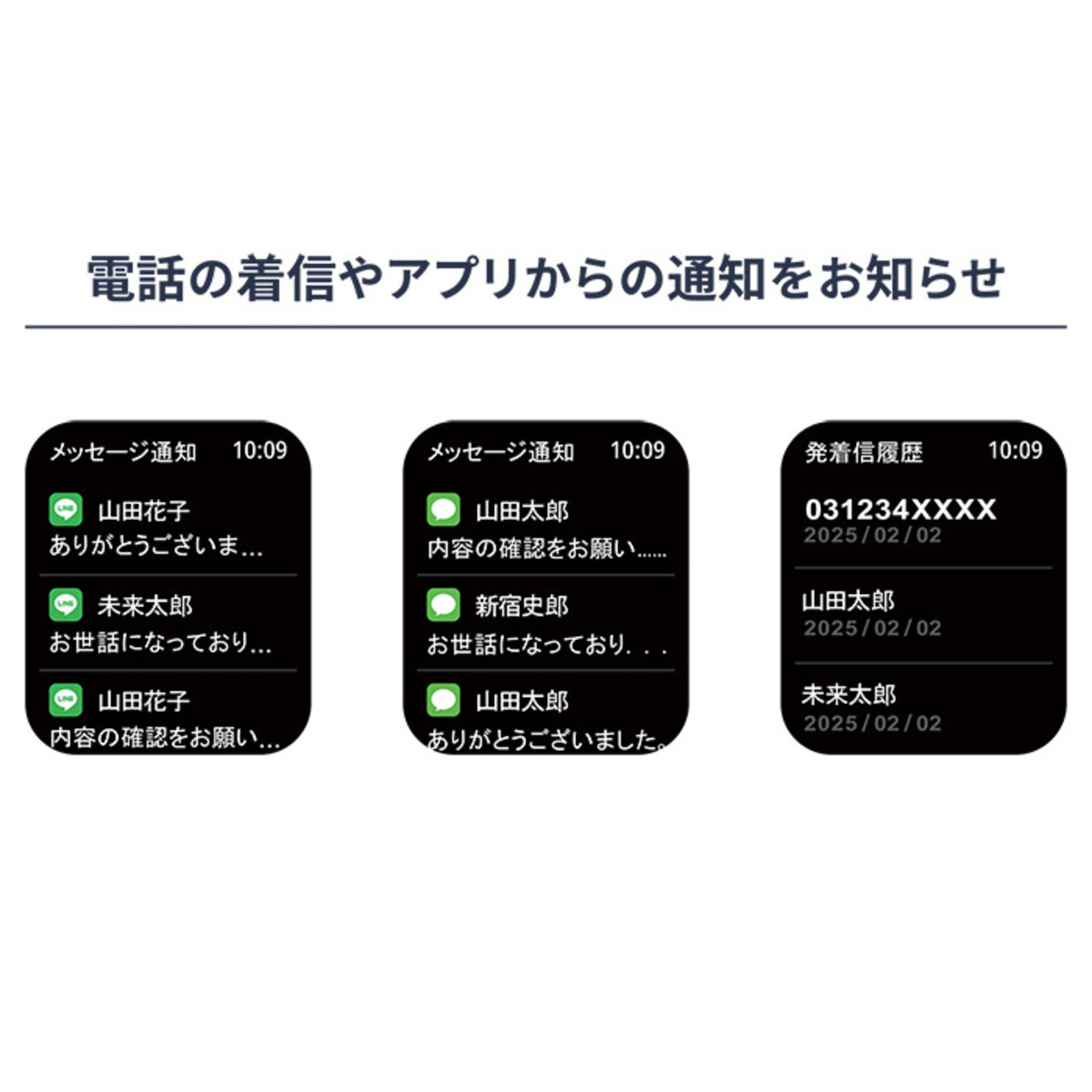 通知を受け取りたいアプリをオンにすることで、スマートフォンと連動しスマートウォッチへ通知することが可能。電話やSNSなどの通知が届いたときは振動や音でお知らせします(*4)