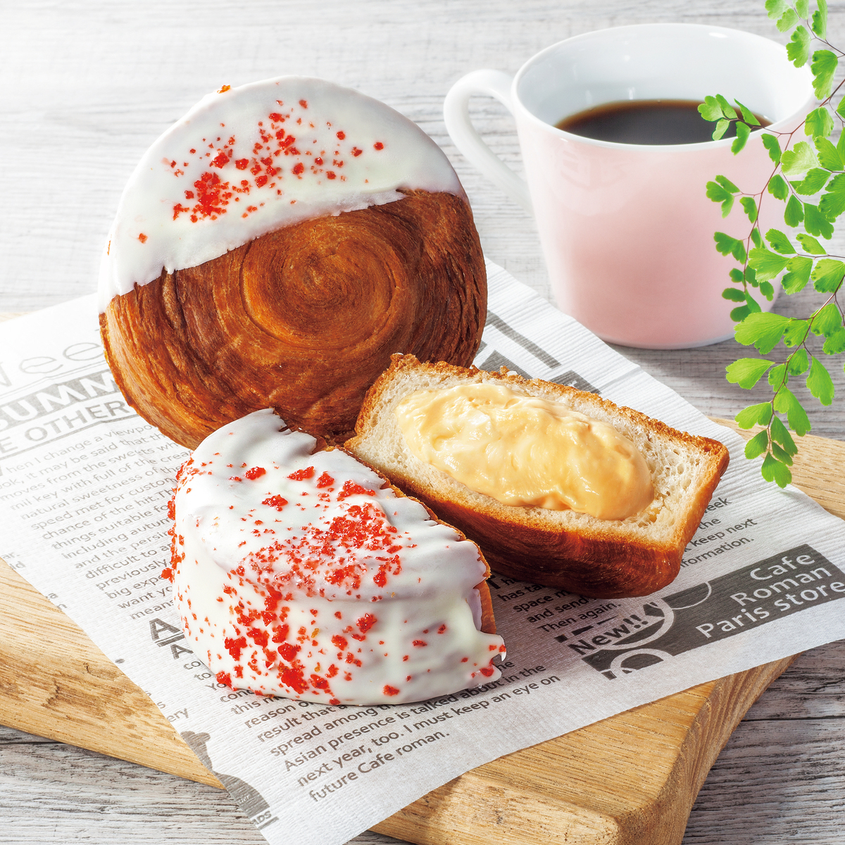 クロワッサンの中にはカスタードクリーム入り。外側にはホワイトチョコを半分かけ、いちご風味のトッピングもまとわせ、さまざまな味わいをお楽しみいただけます