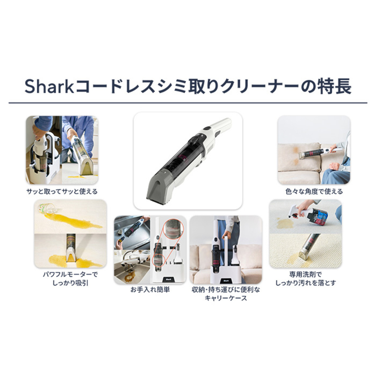 [商品内容] ・汚水タンク ・本体 ・ステインツール ・充電アダプター ・スプレーノズル ・専用洗剤(ボトル) ・キャリーケース [サイズ]9.9×7.9×45.2cm [重量]1090g [充電時間] 約4時間充電で約14.5分使用可能 [使用方法] 1. 本製品は、カーペット、ラグおよび布張りの家具専用です。硬い素材には使用しないでください 2. 本製品で乾いた汚れを掃除する前に、お手持ちの掃除機で表面の浮いたゴミを吸い取ってください 3. 本製品でのお掃除には専用洗剤のみを使用し、水を使用する必要はありません ※汚水タンクが満杯になるとハンディクリーナーは自動停止し、LEDインジケーターが白色に点滅します(汚水タンクを外し、汚水を捨ててください) [注意事項] ※Shark純正の専用洗剤以外は使用しない ※カーペット、ラグおよび布張りの家具以外では使用しない ※ウール、シルク、アンティーク、またはラグを含むデリケートな素材には使用しないでください ※ドライクリーニングのみ対応の素材には使用しないでください。水洗いが可能な素材にのみ使用できます ※本体が濡れている状態で操作しない ※本体を濡らさない ※電源プラグやバッテリーは改造しない ※Shark純正の充電器GQ20A-180050-AJまたはYLJXA-J180050以外は使用しない ※バッテリーを5℃(40°F)以下または40℃(104°F)以上の温度で充電しない ※本製品および電源コードを火気や130℃(266°F)以上の温度にさらさない ※Shark純正の専用洗剤以外の溶液を洗剤ボトルに補充しない ※電源ボタンに指をかけた状態で本体を持ち運んだり、電源が入ったままの状態で本体を充電しない <専用洗剤> [内容量] Deep Clean MAX:250ml OXY Multiplier MAX:250ml [液性] Deep Clean MAX:弱アルカリ性 OXY Multiplier MAX:弱酸性 [用途]カーペットやラグ、家具などの布地用のシミ取りおよび消臭 ■取り扱い説明を充分にご確認の上、ご使用下さい 【中国製】 <専用洗剤> [注意事項] ※お子様の手が届かない場所で保管してください ※目に入った場合は水で15分間洗い流してください ※コンタクトレンズを着けている場合はコンタクトレンズを外して目を水ですすいでください ※肌についた場合は石鹸をつけて水で洗ってください ※それでも肌や目のかゆみが続く場合は、医師の診察を受けてください ※空の容器はラベルをはがし、お住まいの自治体の回収ルールに従ってリサイクルしてください ※スプレー液は排水溝や水路に廃棄しないでください [成分] 専用洗剤:Shark Deep Clean MAX: 成分: 界面活性剤(2-エチルヘキサノール EO-PO 非イオン性界面活性剤)、重酸化ナトリウム、水酸化ナトリウム(0.7%)、キレート剤、香料 Shark OXY Multiplier MAX: 成分: 界面活性剤(オクタンスルホン酸ナトリウム)、過酸化水素(酸素系)、泡調整剤