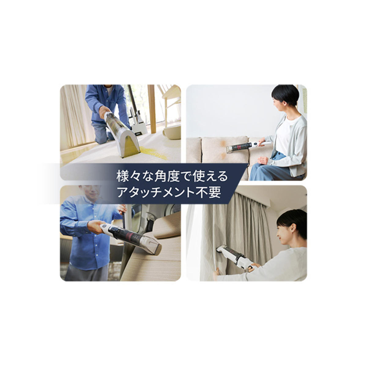 様々な角度で使用できるので、普段掃除しにくいソファーや車のシートの背もたれなどにも対応。また、場所によってアタッチメントを付け替える煩わしさがありません