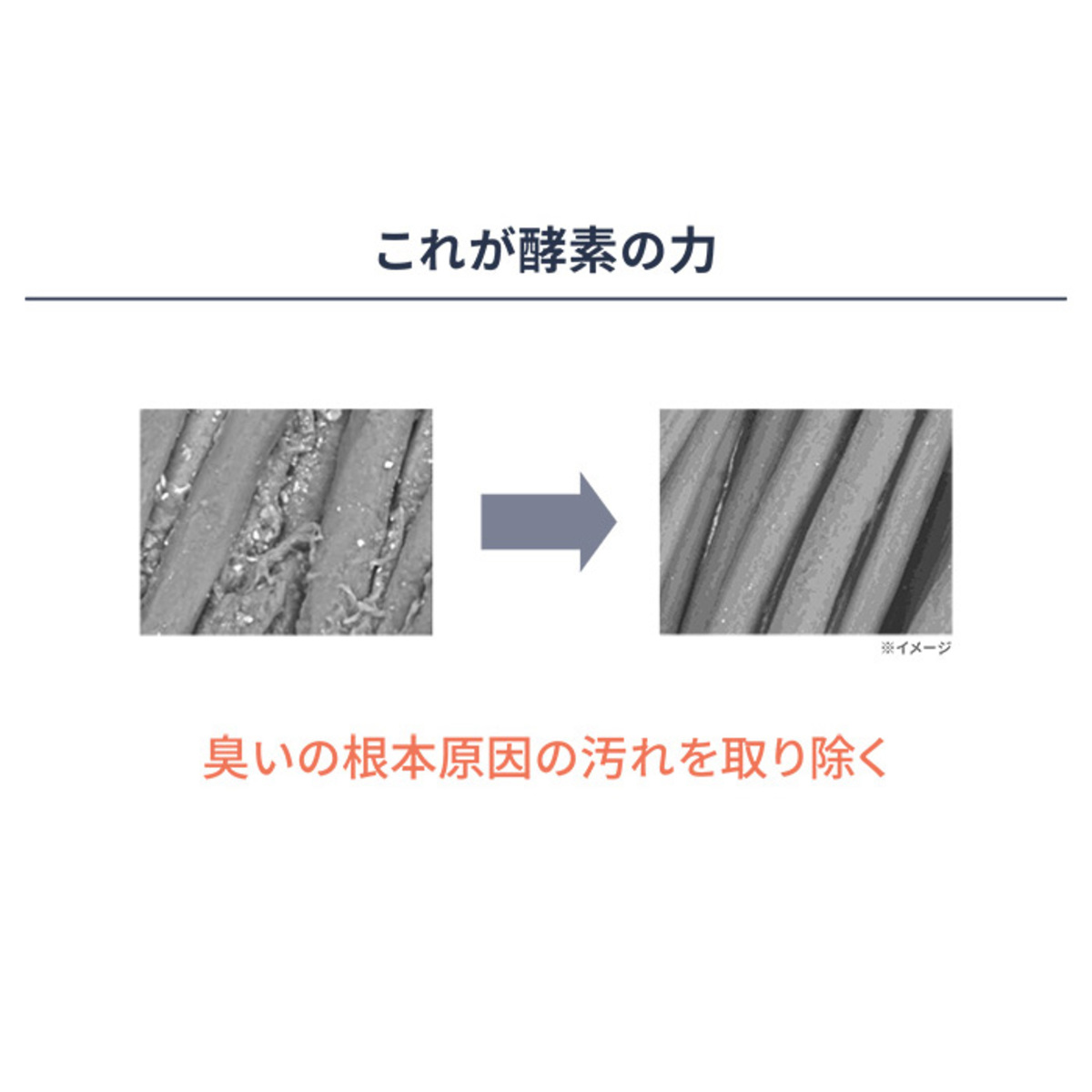 プロテアーゼ、アミラーゼ、リパーゼ、セルラーゼ、ホスホジエステラーゼの5種類の酵素で汚れを落とす洗濯洗剤。酵素とアルカリ、石けんの力で高い洗浄力を実現。除菌効果があり*、蛍光増白剤、香料は不使用です
