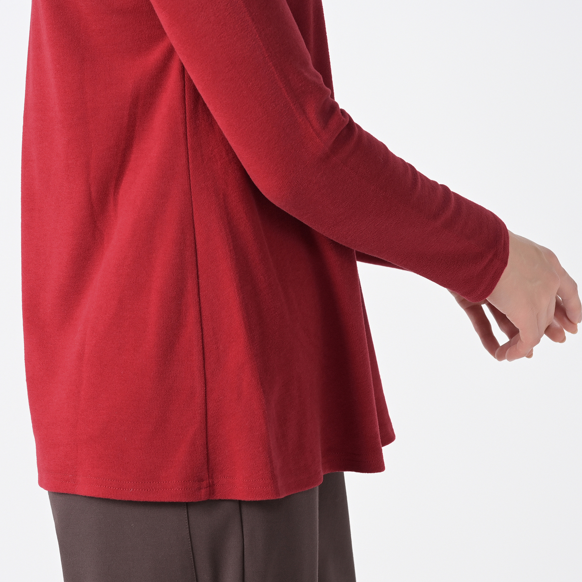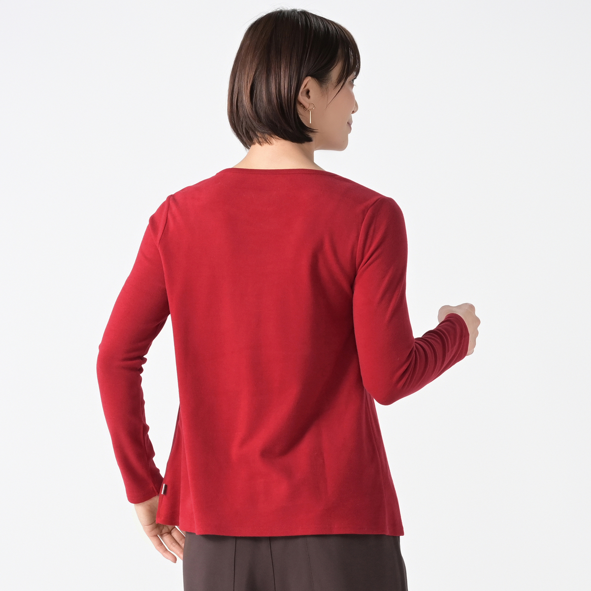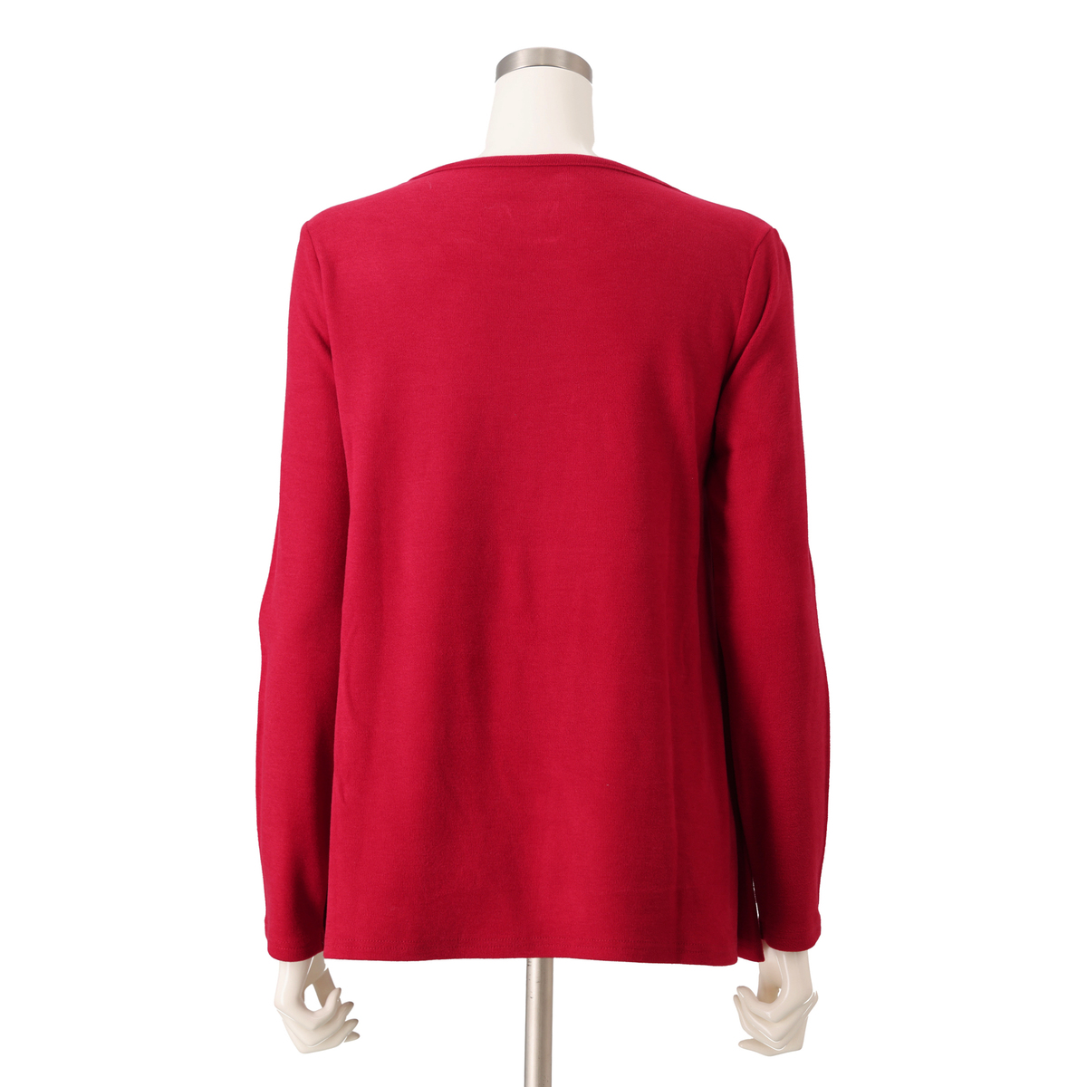 [商品寸法(ヌード)cm] サイズ バスト 着丈 M: 84(81〜89) 60 L: 90(88〜96) 61 LL: 96(95〜103) 62 3L: 104(102〜110) 63 サイズ 肩幅 袖丈 M: 35 57 L: 36 58 LL: 37 59 3L: 38 60 [素材] レーヨン 65%、アクリル 16%、ポリウレタン 10%、綿 9% [お手入れ] 洗濯機洗い可 [注意事項] ※商品寸法の誤差は多少発生します。ご了承下さい ※洗濯後はすぐに脱水し、形を整えて干して下さい。長時間、水につけたままにしないで下さい ※洗濯・クリーニングの際、色落ちすることがありますので他の物と分けて洗って下さい ※素材の特性上、着用や取り扱いにより製品が斜行することがありますが、形を整えて軽くアイロンをかけていただくとある程度回復します ※蛍光増白剤入り洗剤を使用しないで下さい 【中国製】
