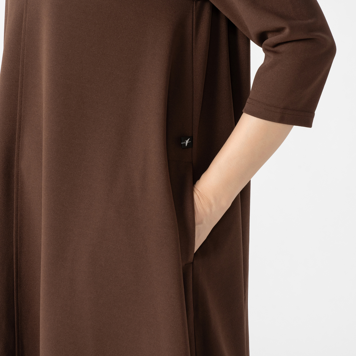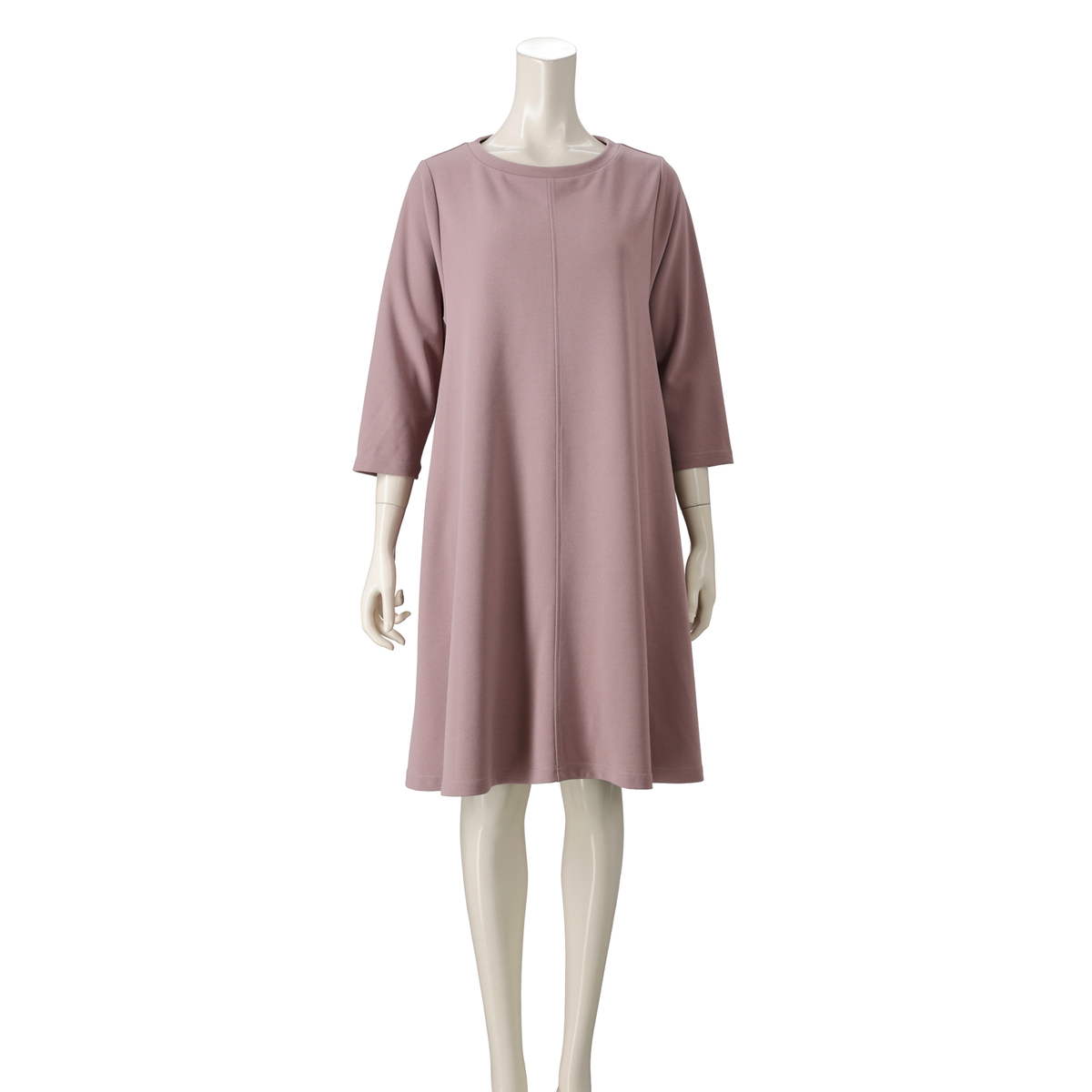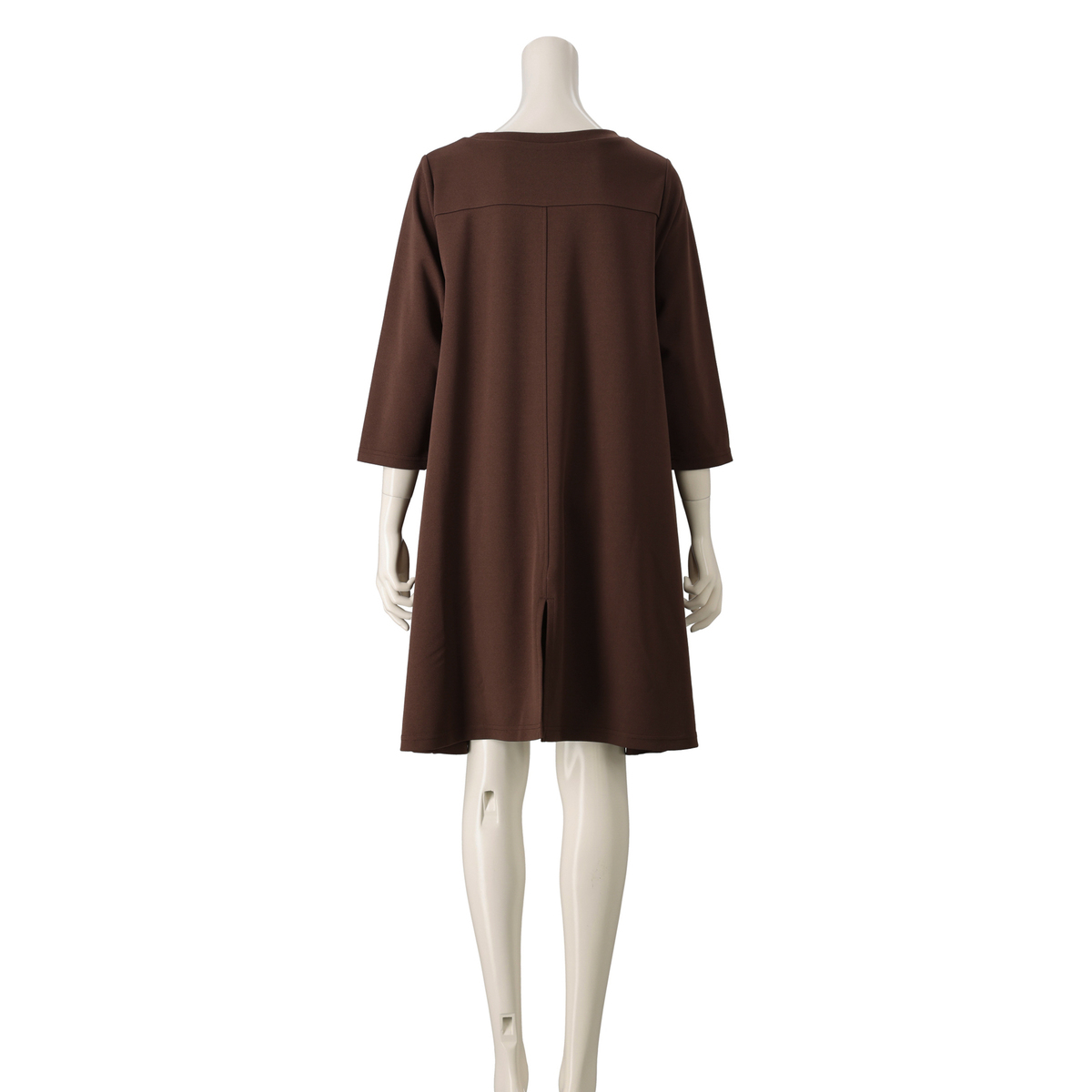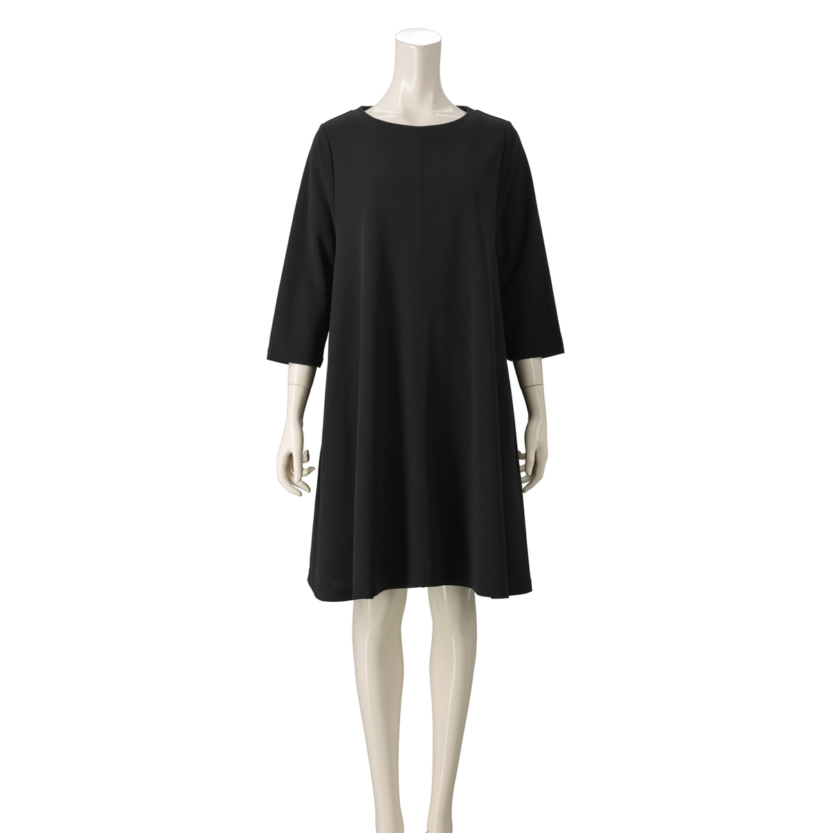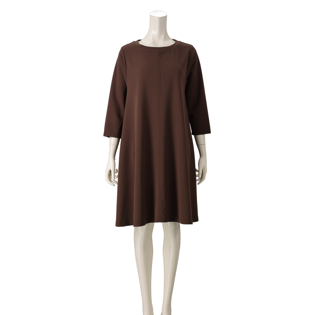 スクランブル・梨地のラウンドネックワンピース。シンプルなデザインで、幅広いコーディネートに活用する一枚。左右脇には便利なポケット付きです