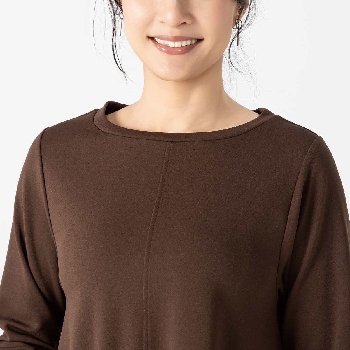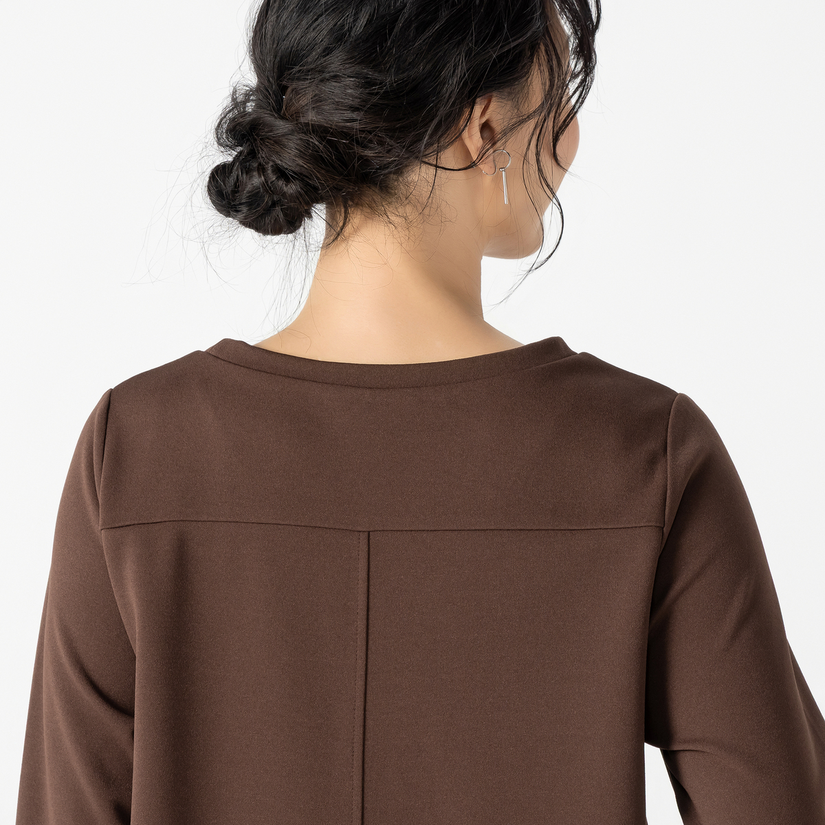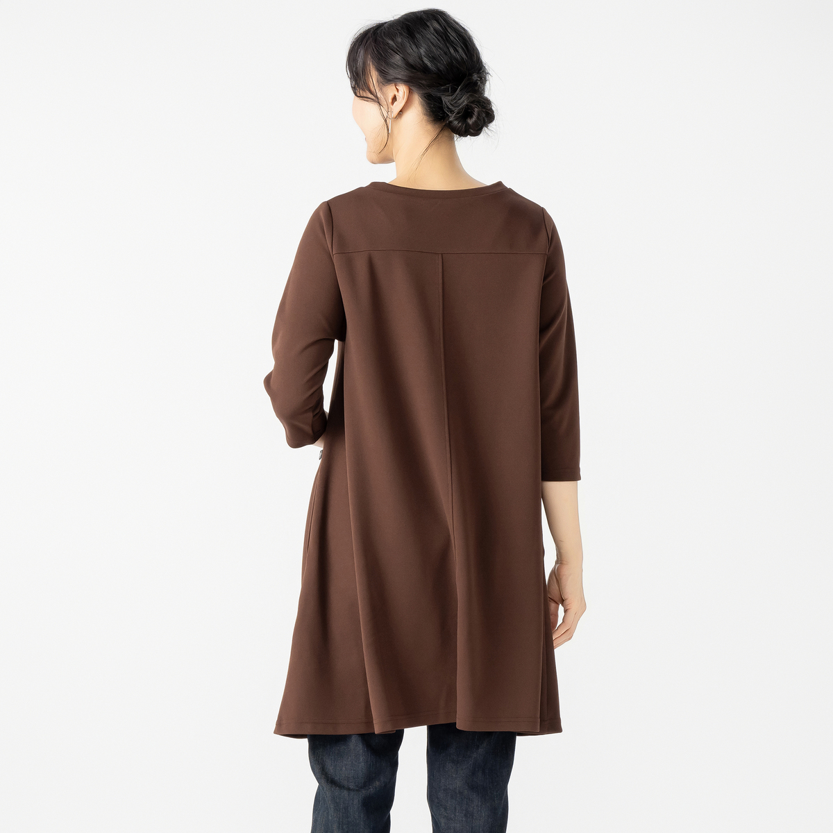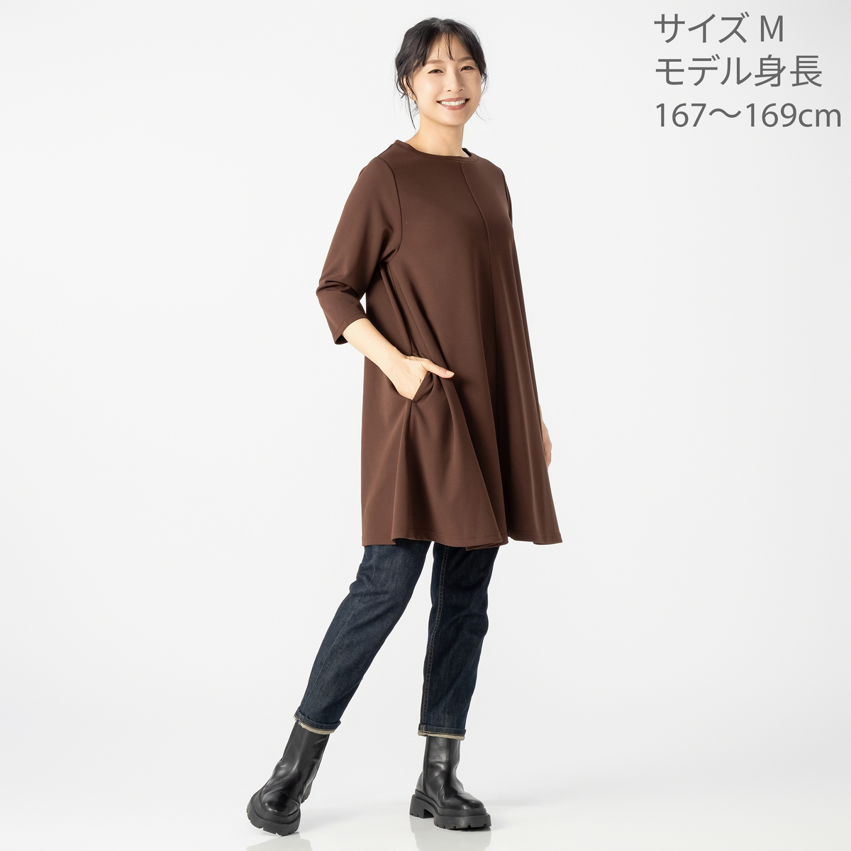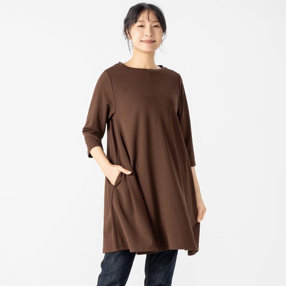 スクランブル・梨地のラウンドネックワンピース。シンプルなデザインで、幅広いコーディネートに活用する一枚。左右脇には便利なポケット付きです