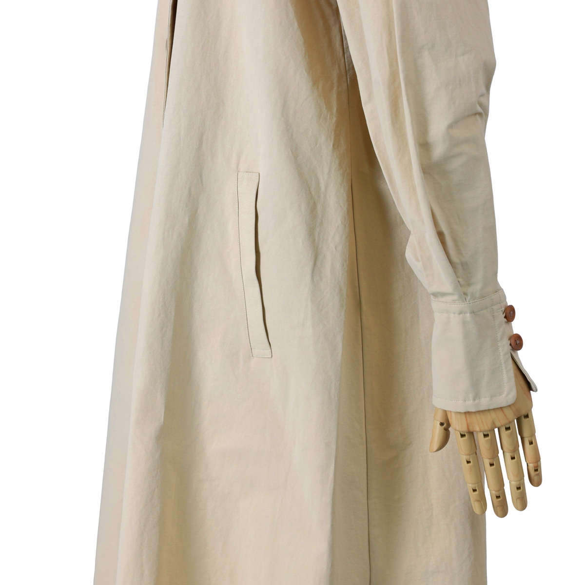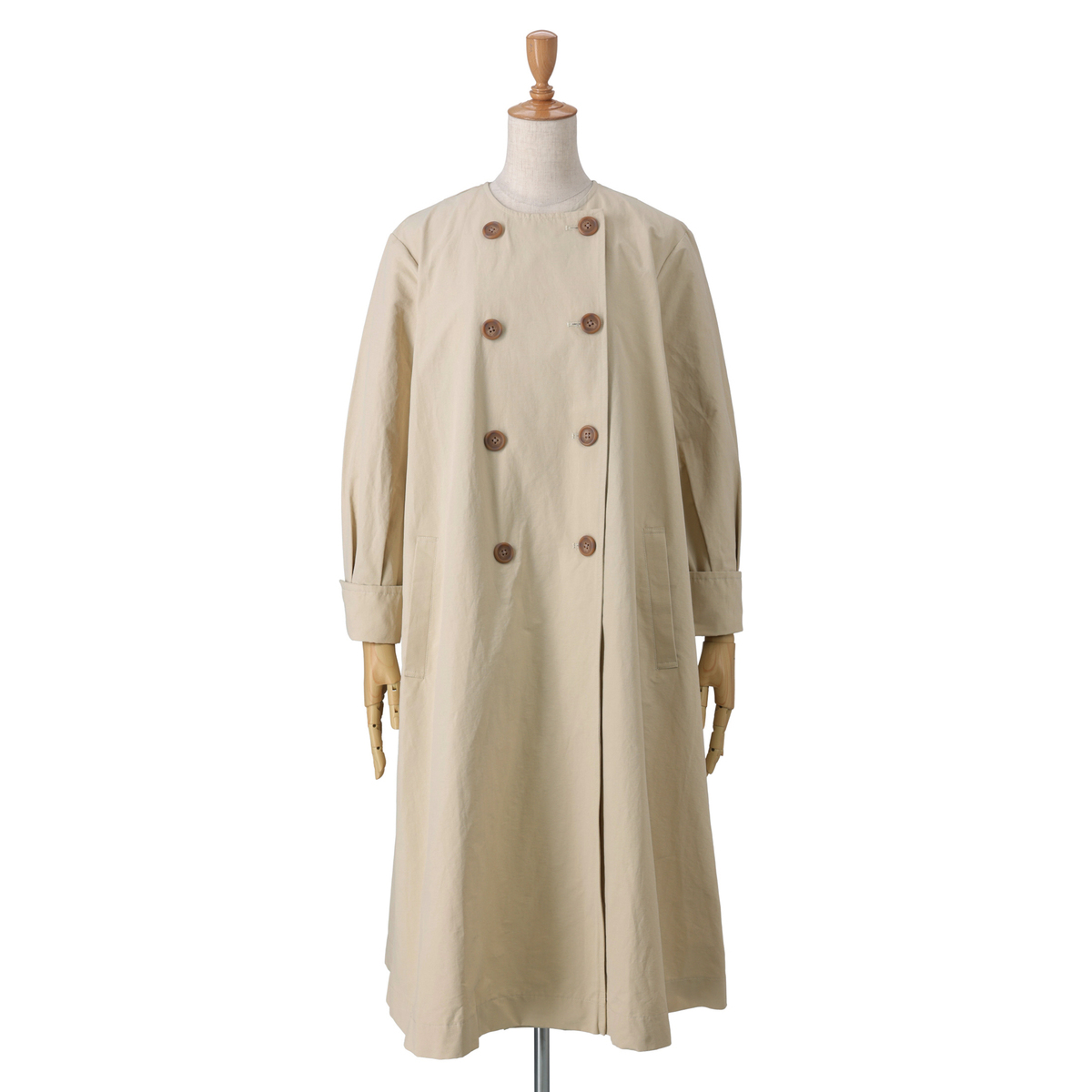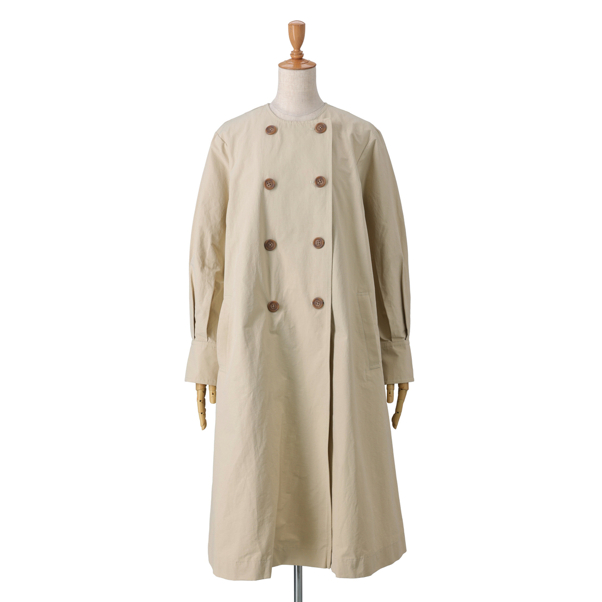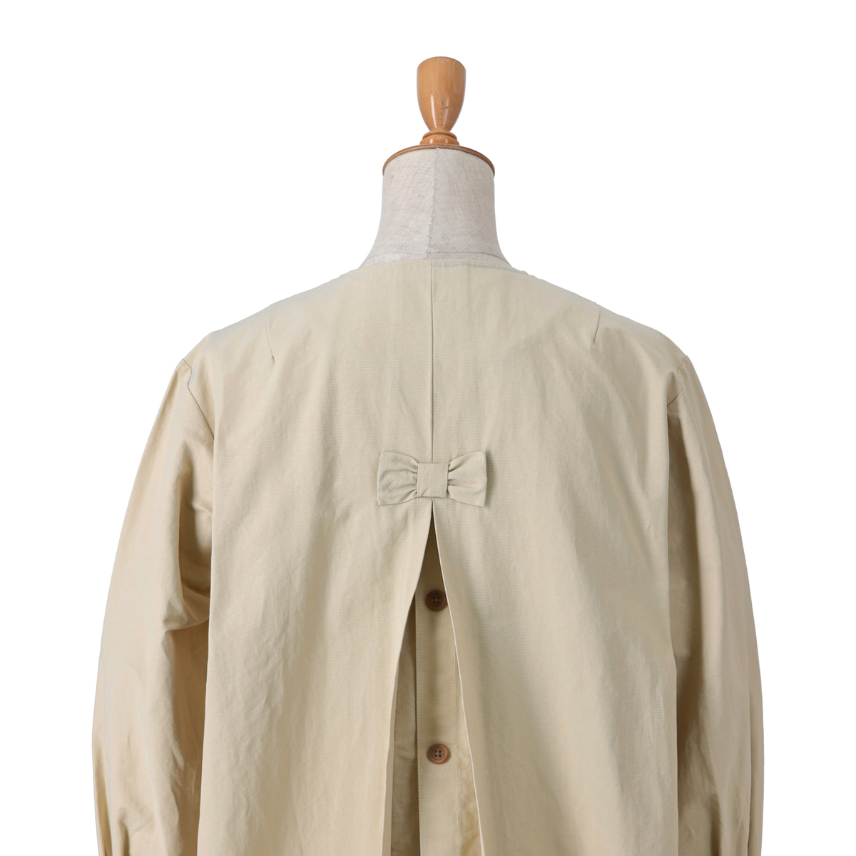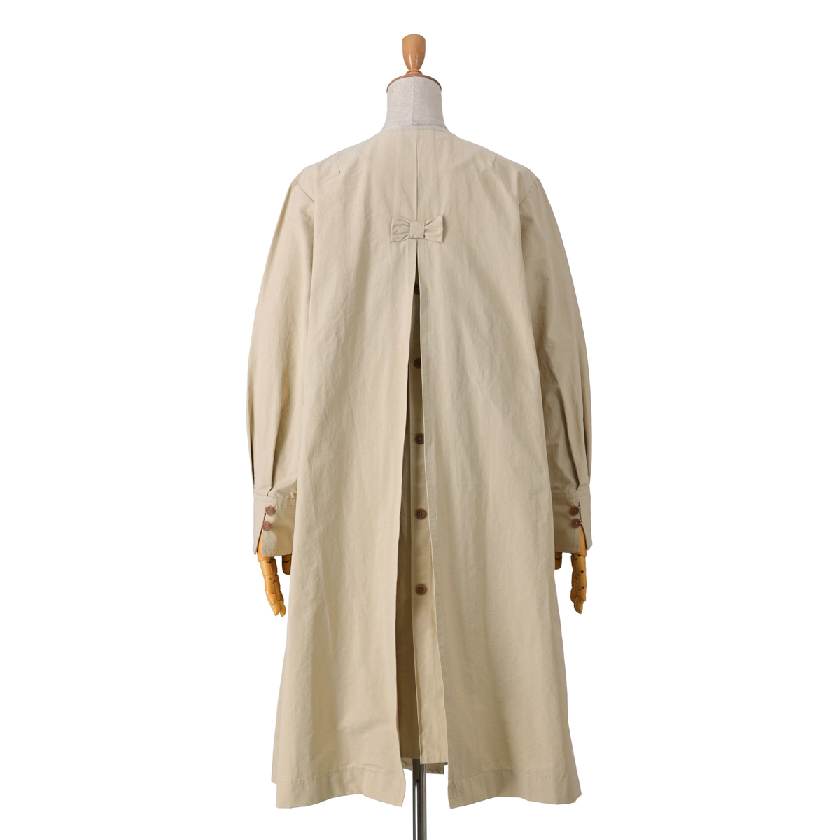 ドレスのように広がるAラインが魅力のコート。前身頃はダブルの打ち合わせで品格を添え、パフスリーブが立体感を演出。長めのカフスは折り返して表情を変えられ、後ろにはリボンとボタンを施して大人かわいいディテールを詰め込みました