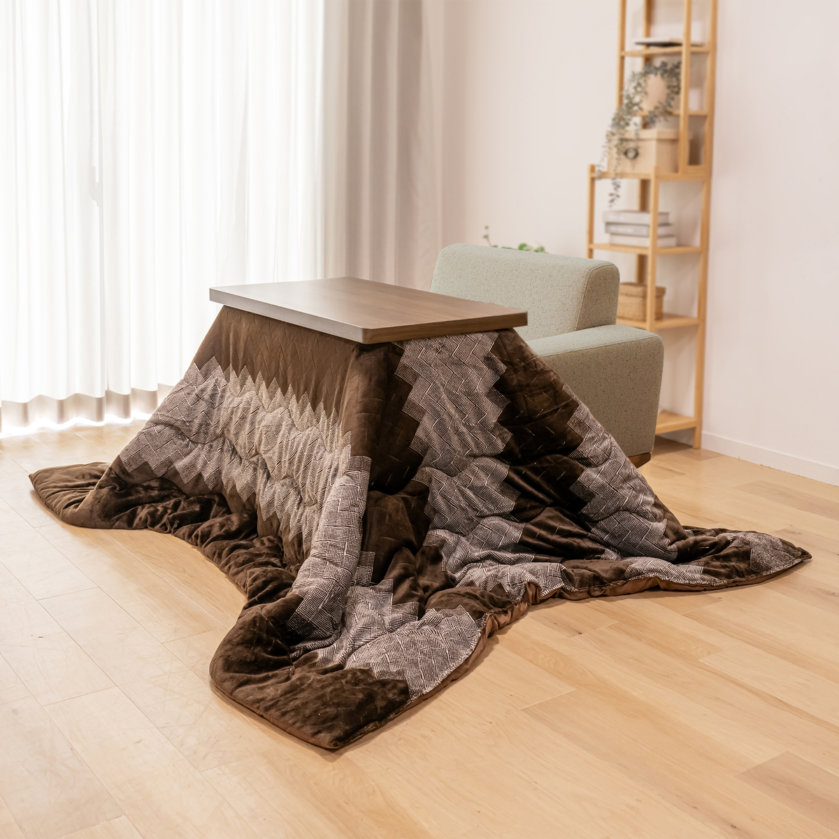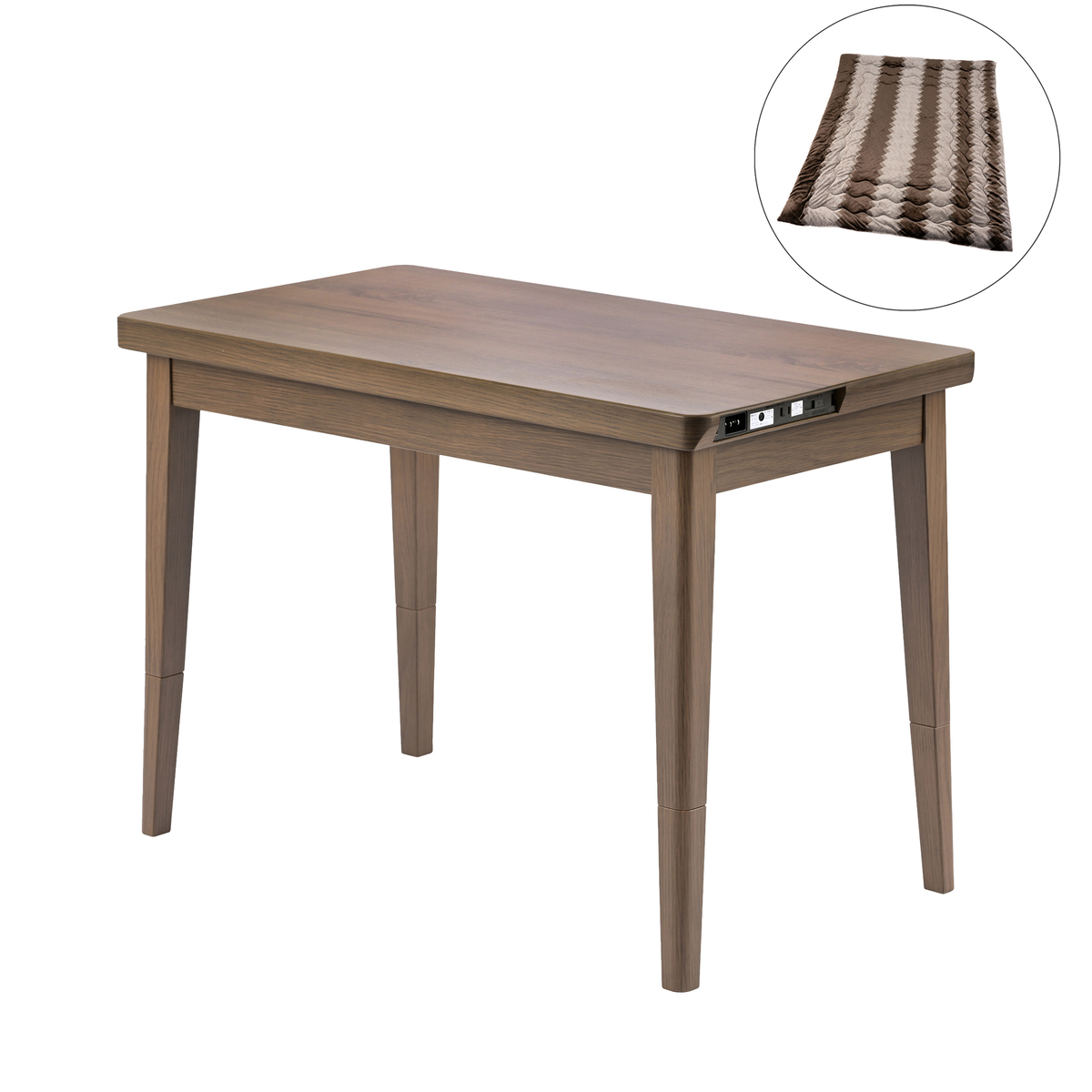 自宅のソファに合わせて使えるコタツ。サーモスタット(可変式)を採用し、温度調節ツマミでお好みの温度に「弱」から「強」まで無段階で調節可能です