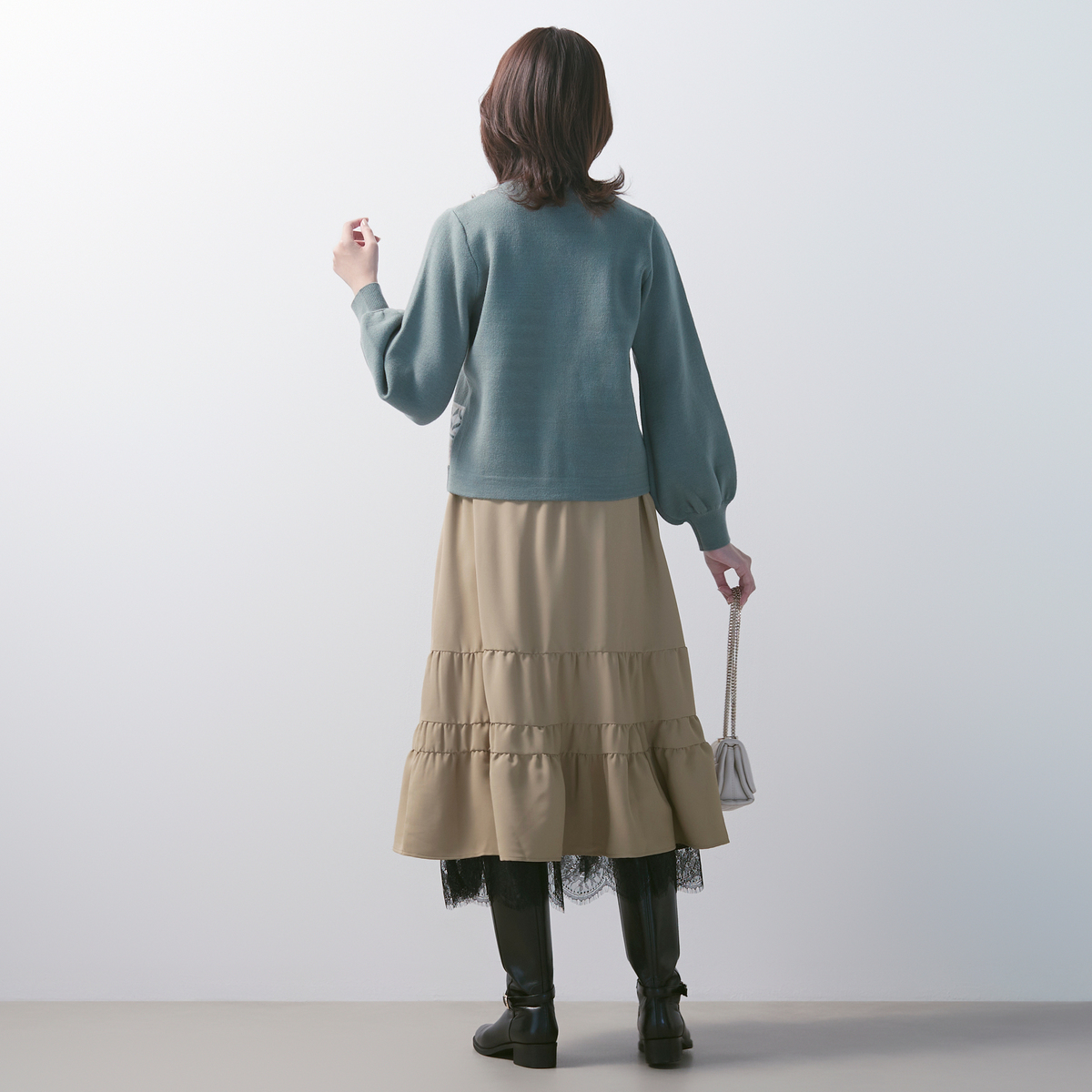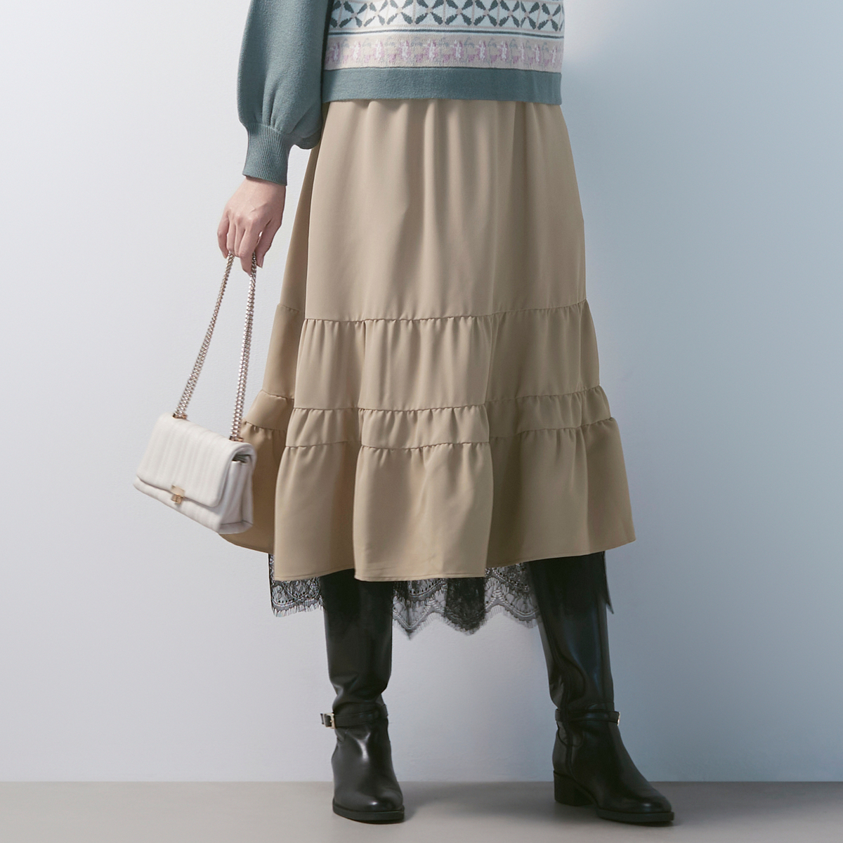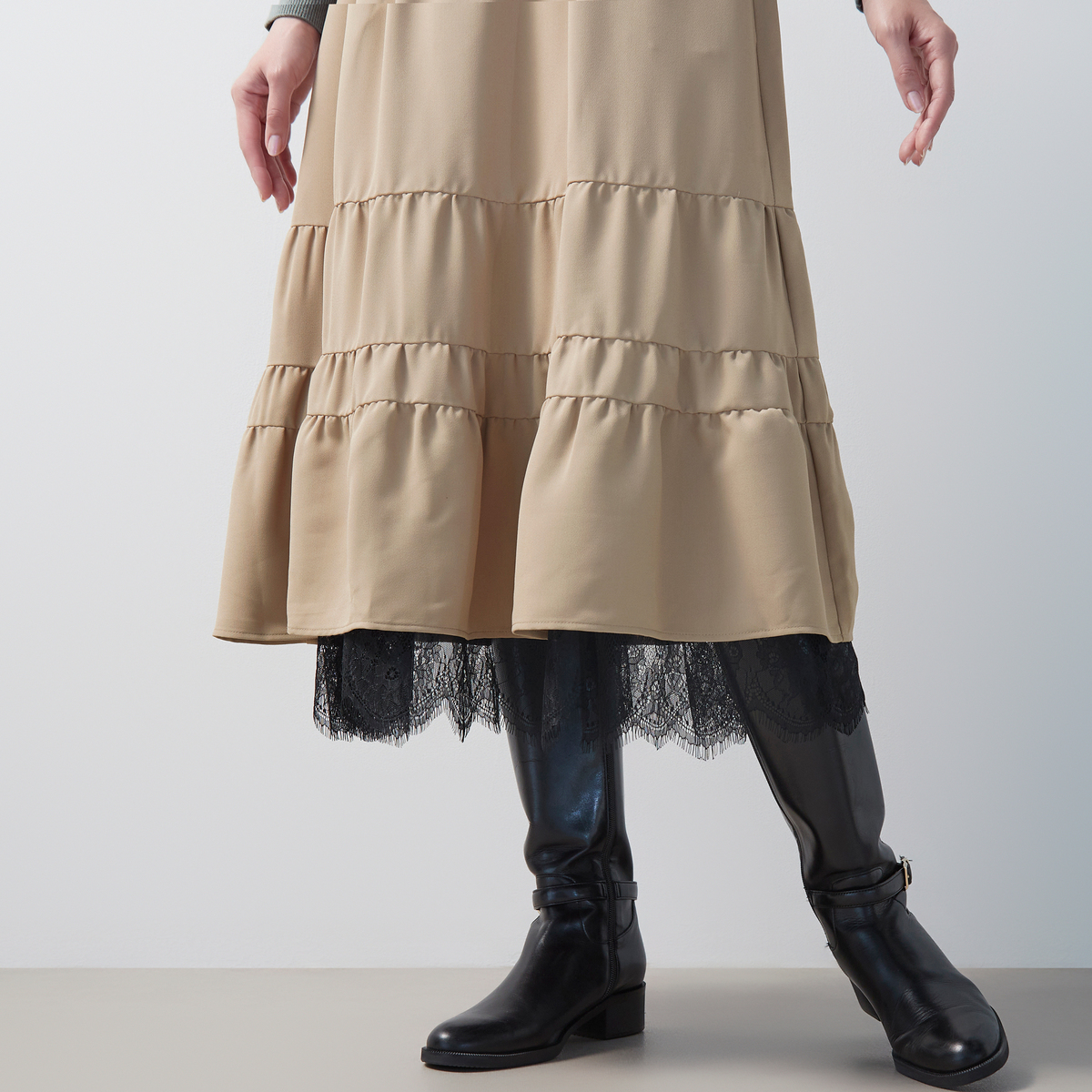立体感と奥行きを添える華やかなティアードスカート。段ごとに入れたギャザーが、動きに合わせて軽やかに揺れ、フェミニンな印象を演出します。さらに、裏地の裾には広幅のラッセルレースを贅沢に使用。表地より長めに設定し、レースがさりげなく覗くデザインが、華やかな雰囲気を引き立てます