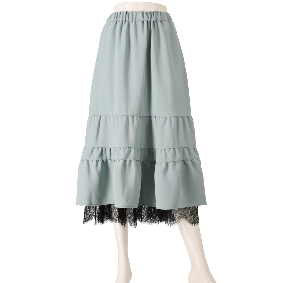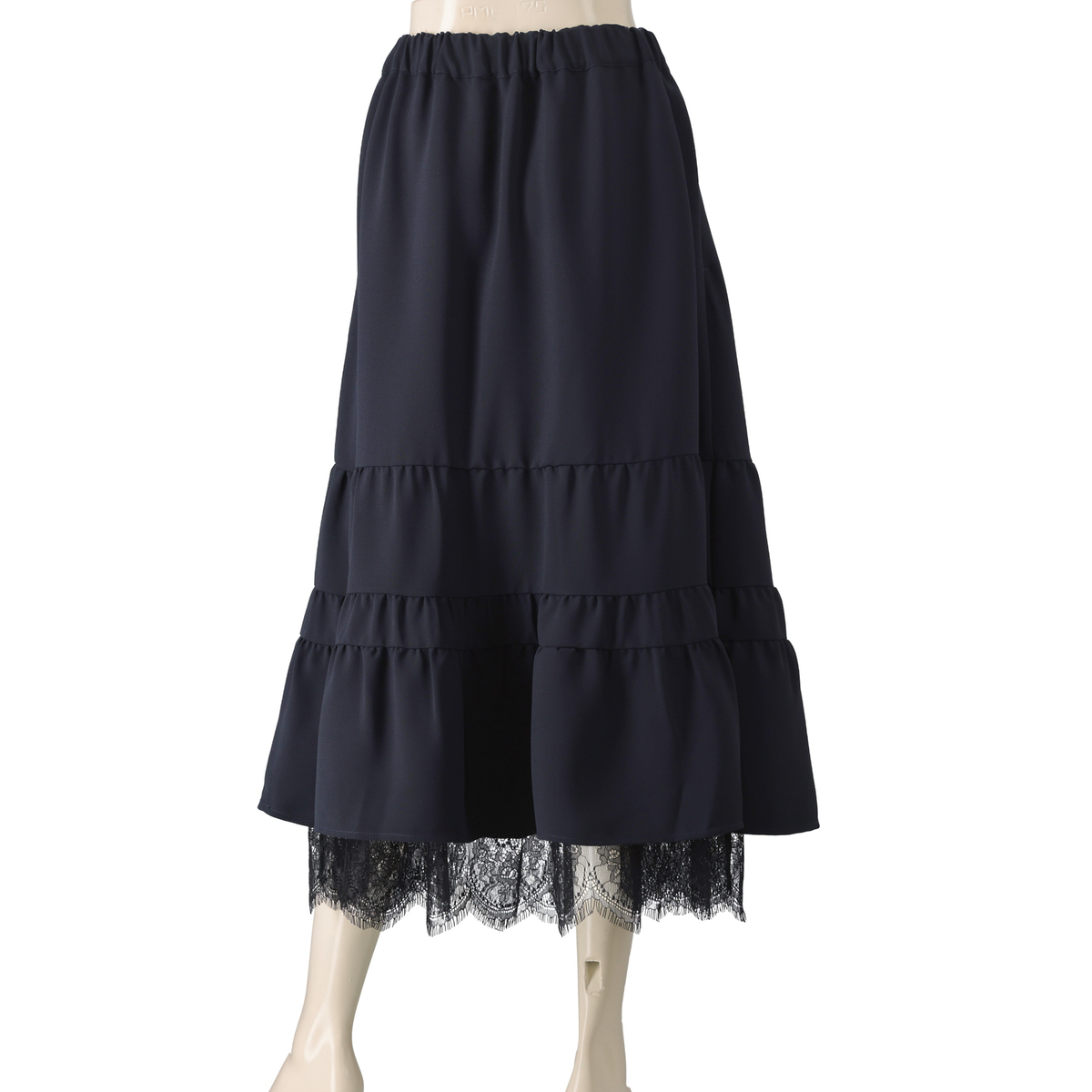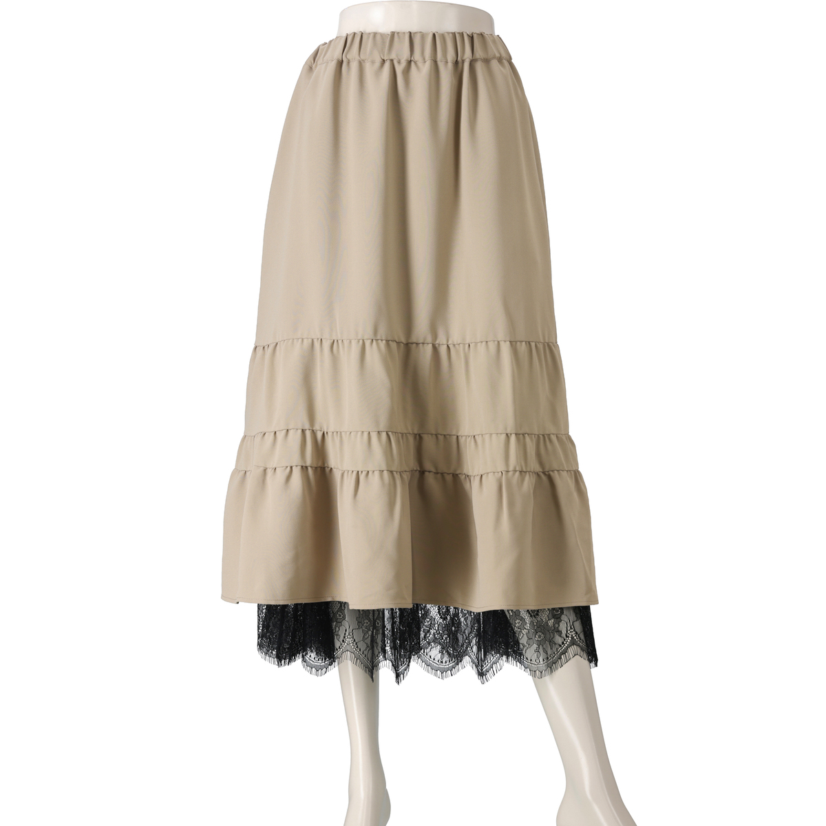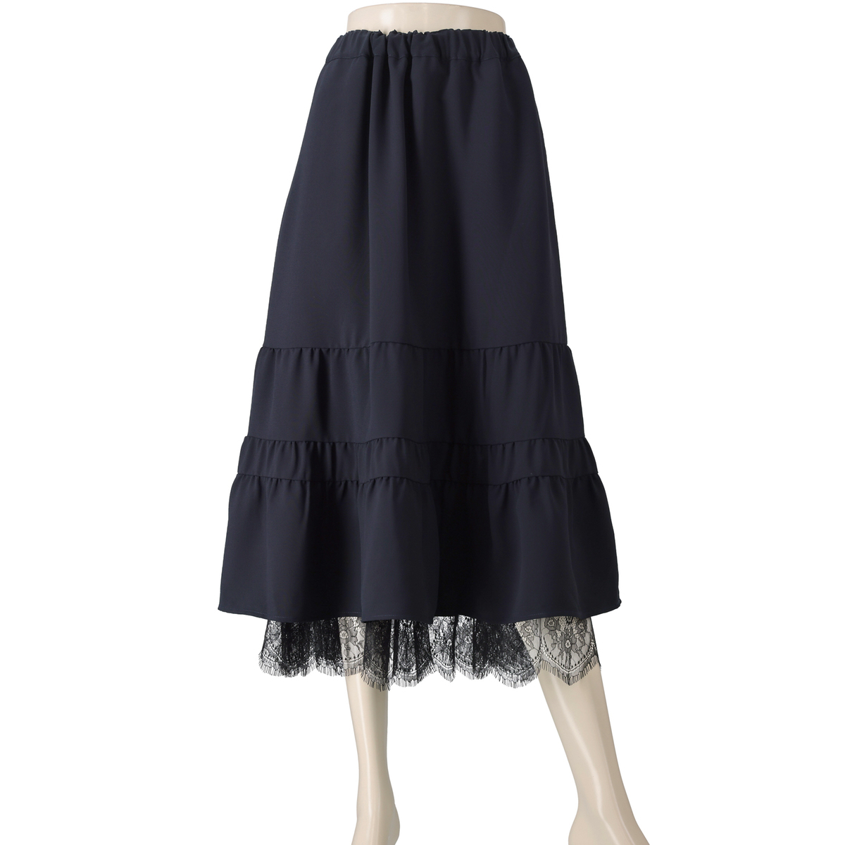 立体感と奥行きを添える華やかなティアードスカート。段ごとに入れたギャザーが、動きに合わせて軽やかに揺れ、フェミニンな印象を演出します。さらに、裏地の裾には広幅のラッセルレースを贅沢に使用。表地より長めに設定し、レースがさりげなく覗くデザインが、華やかな雰囲気を引き立てます