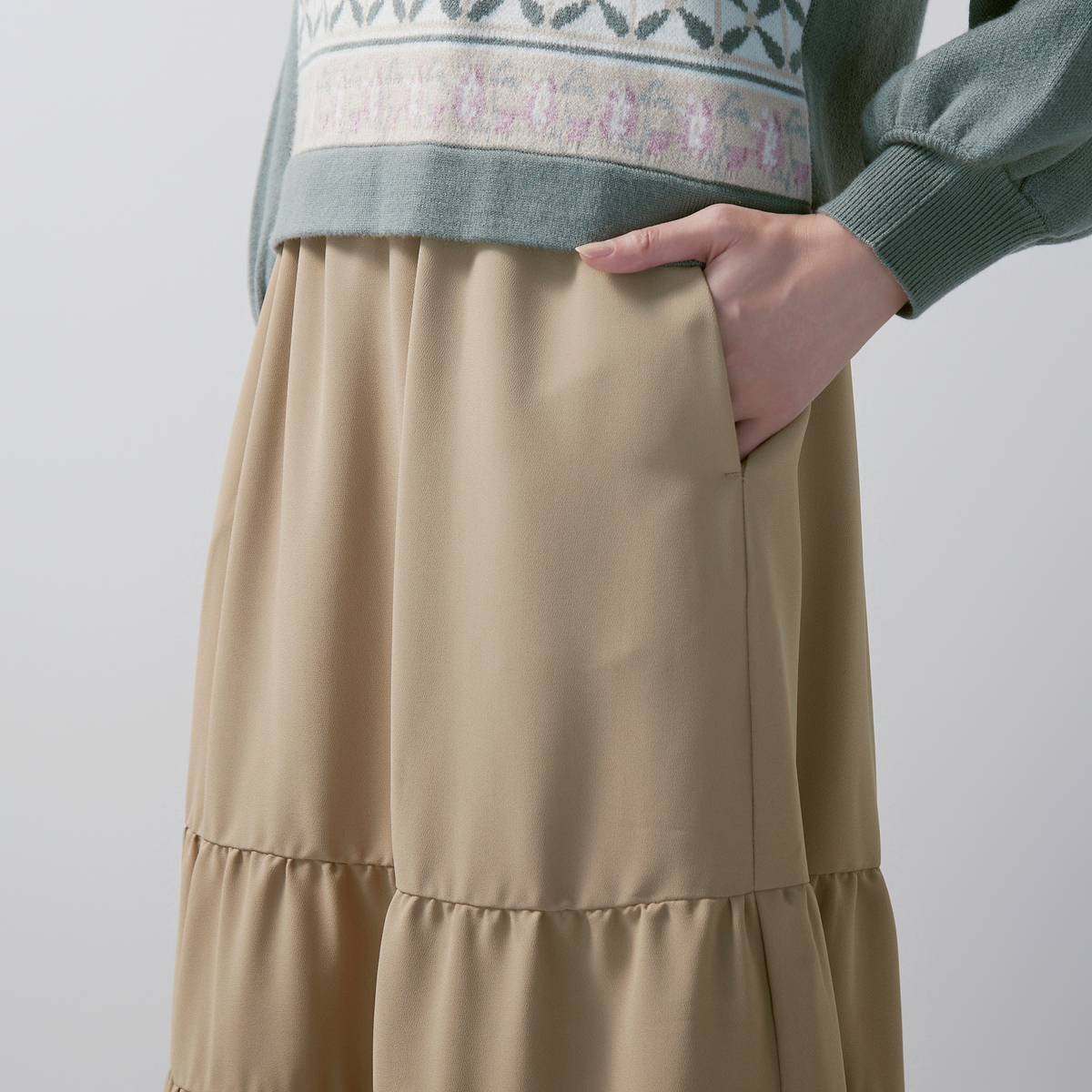ウエストはゴム仕様で長時間の着用でもストレスなく過ごせます。シンプルなトップスでスカートを主役にしたり、ジャケットを合わせたり、カジュアルからエレガントまで、幅広いスタイルに対応します