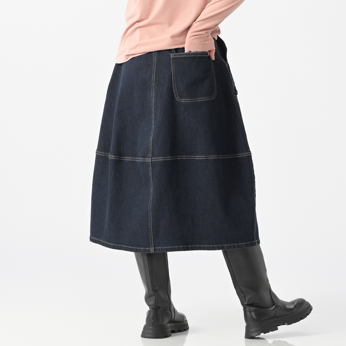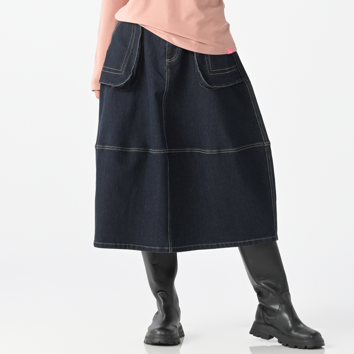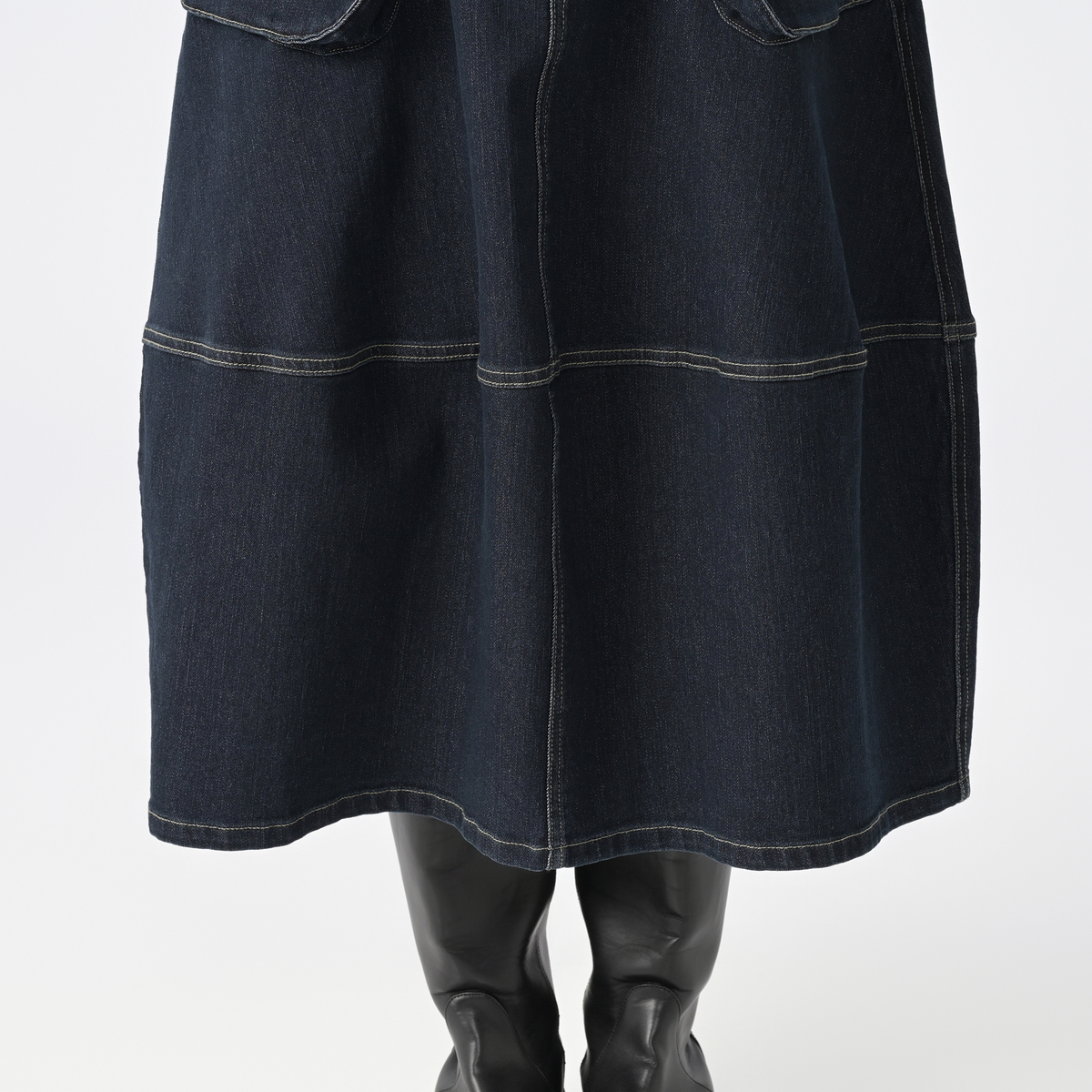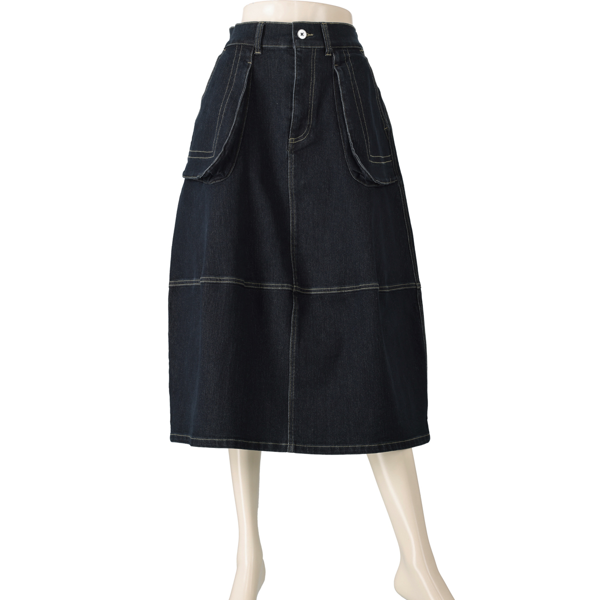 前身頃の立体ポケットがアクセントのデニムコクーンスカートです。丸みを描くシルエットがフェミニンさを引き立て、気になる体型も自然にカバーします