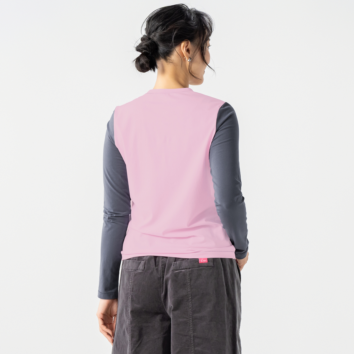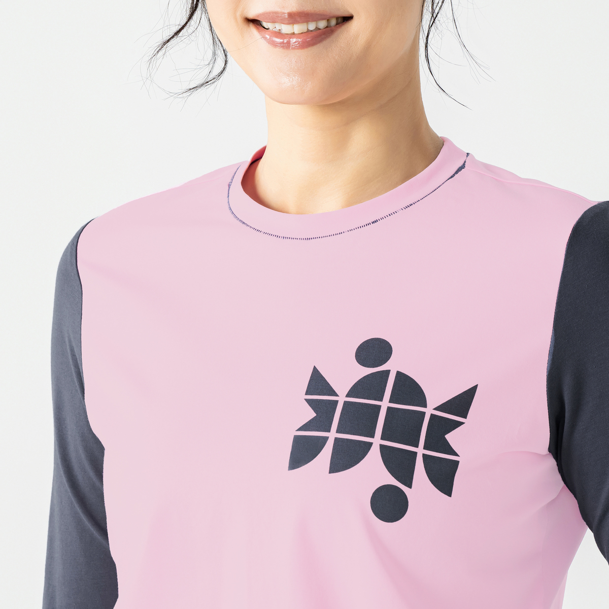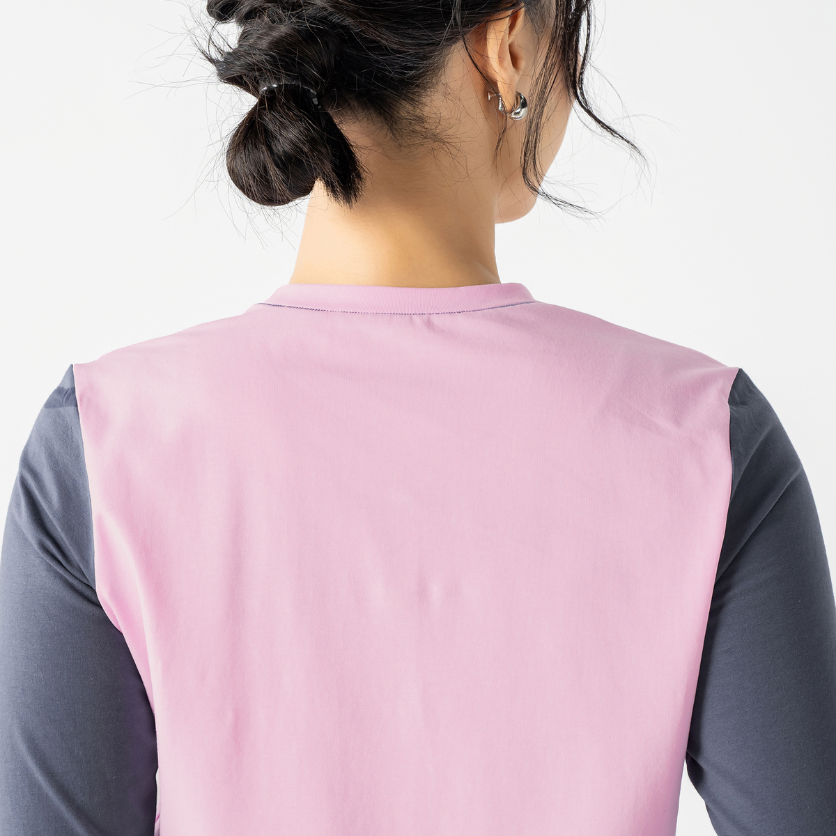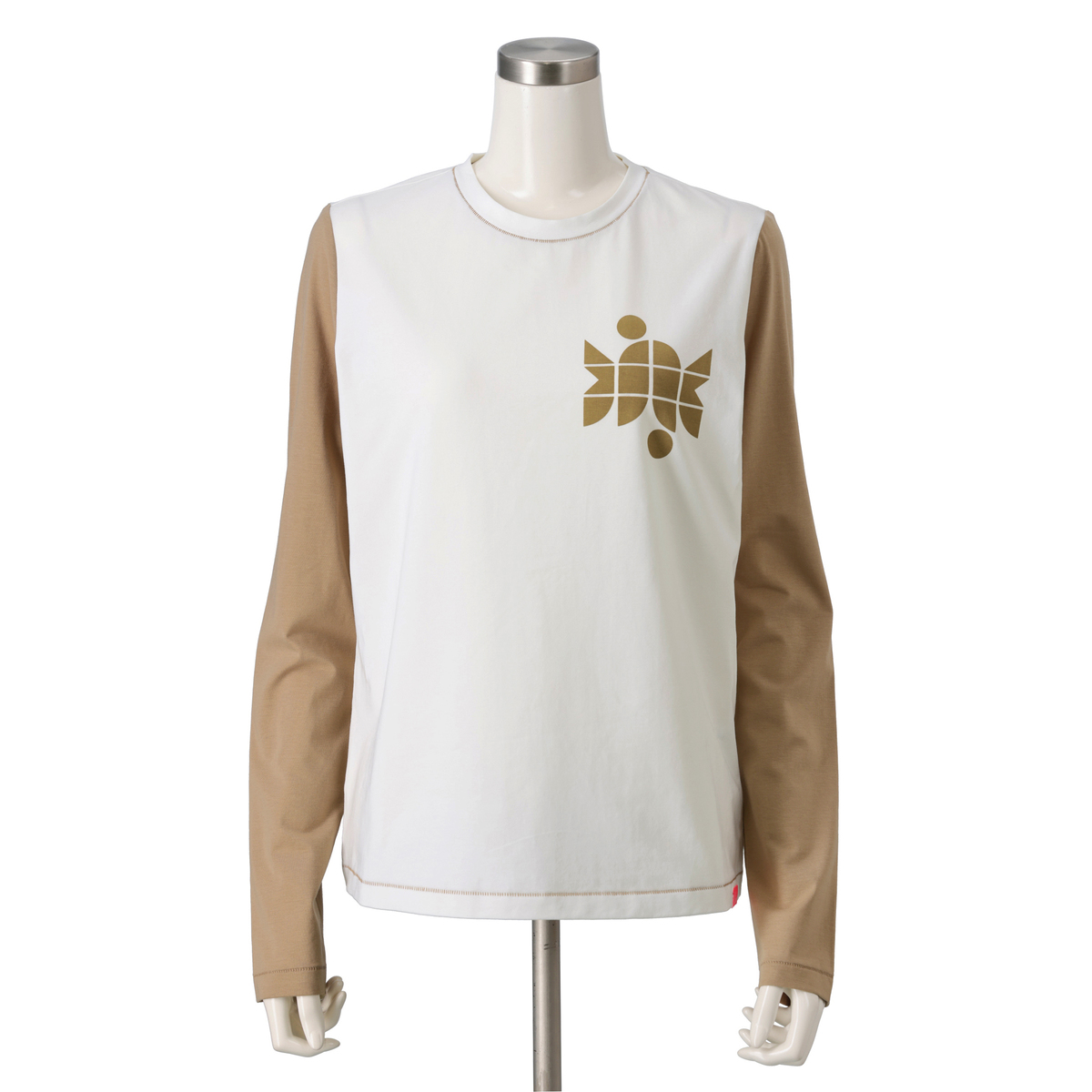 綿ベア天竺を使用した袖配色プルオーバー。左胸のKiKKiロゴプリントがさりげないアクセントに。シンプルながらも配色デザインが華やかさを添え、一枚でも重ね着でも楽しめるアイテムです