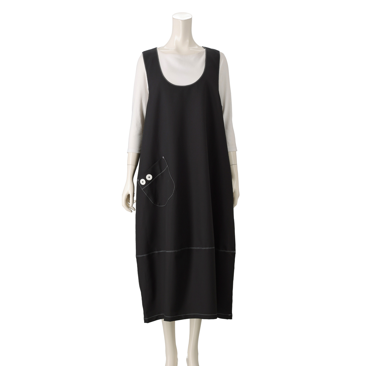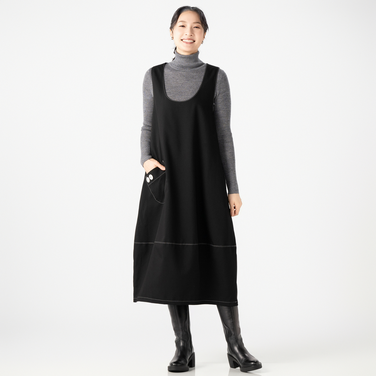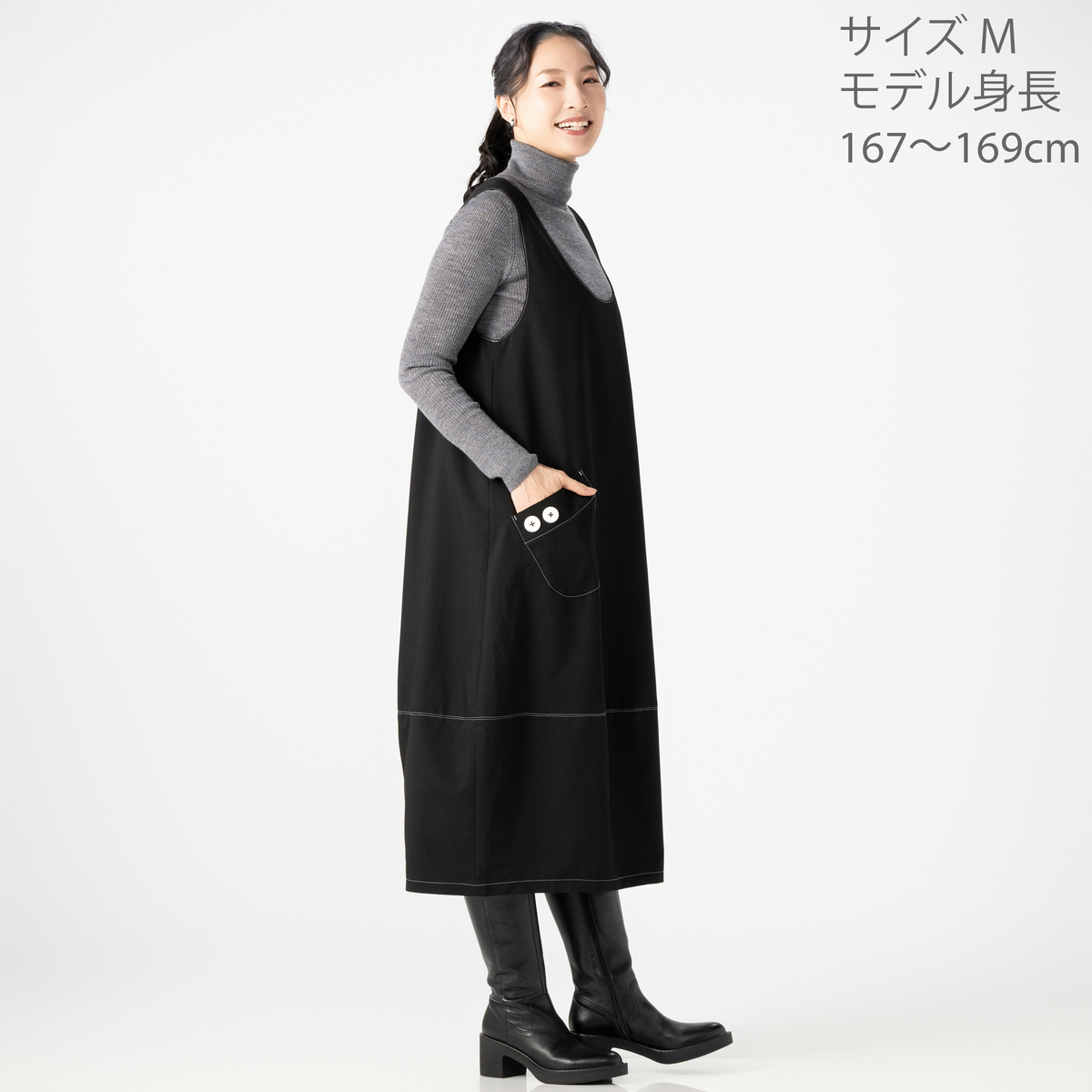 コクーンシルエットがやさしい印象を与えるジャンパースカート。丸みのあるラインで体型を自然にカバーし、リラックス感のある着心地です