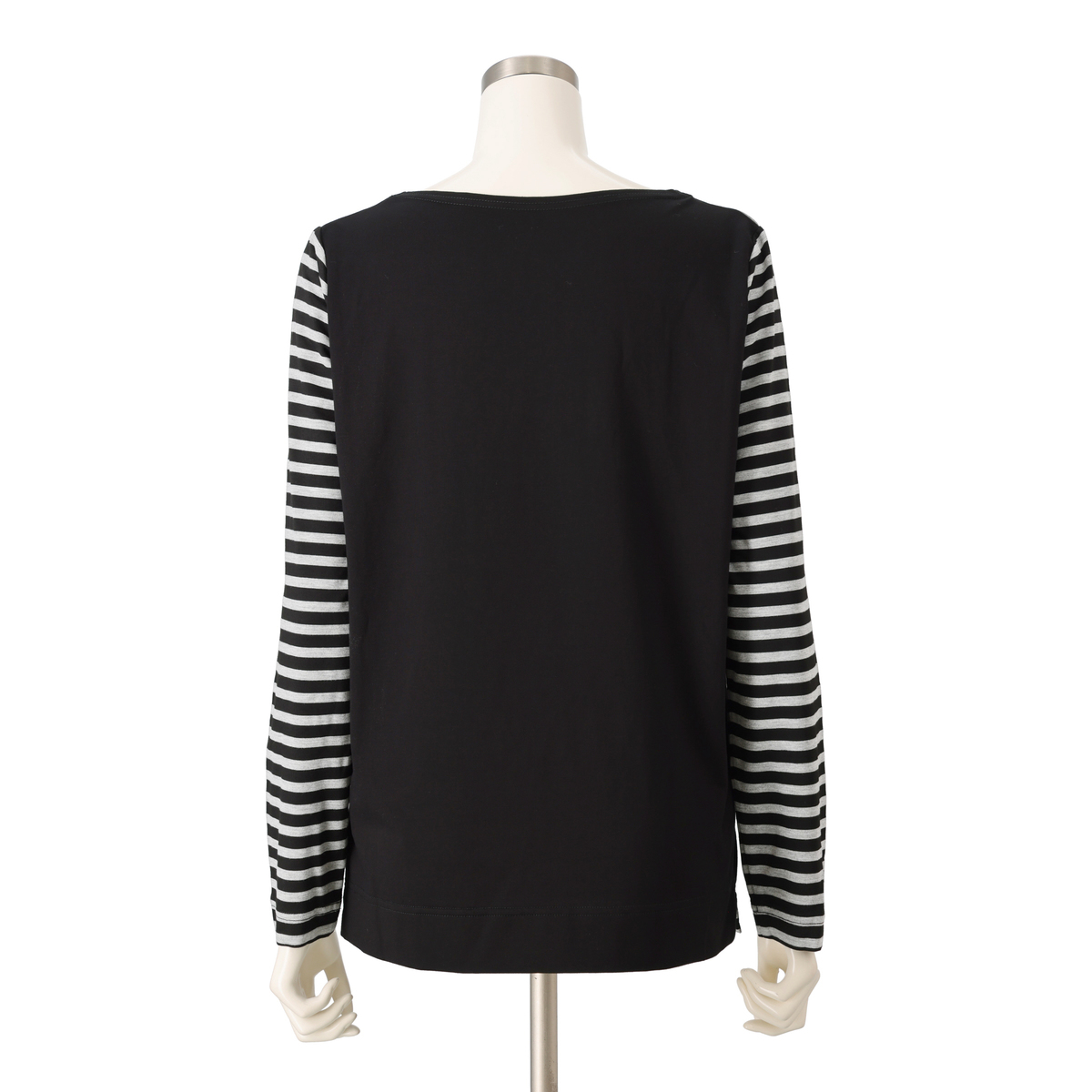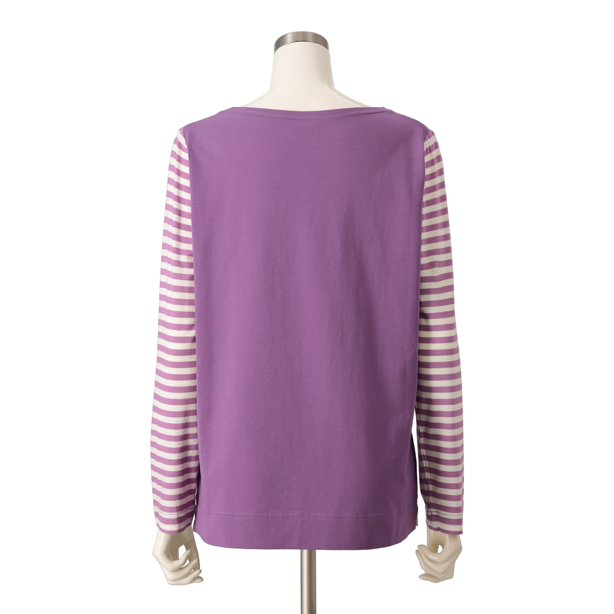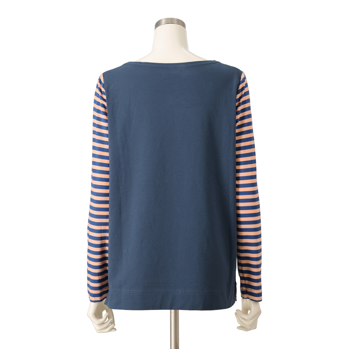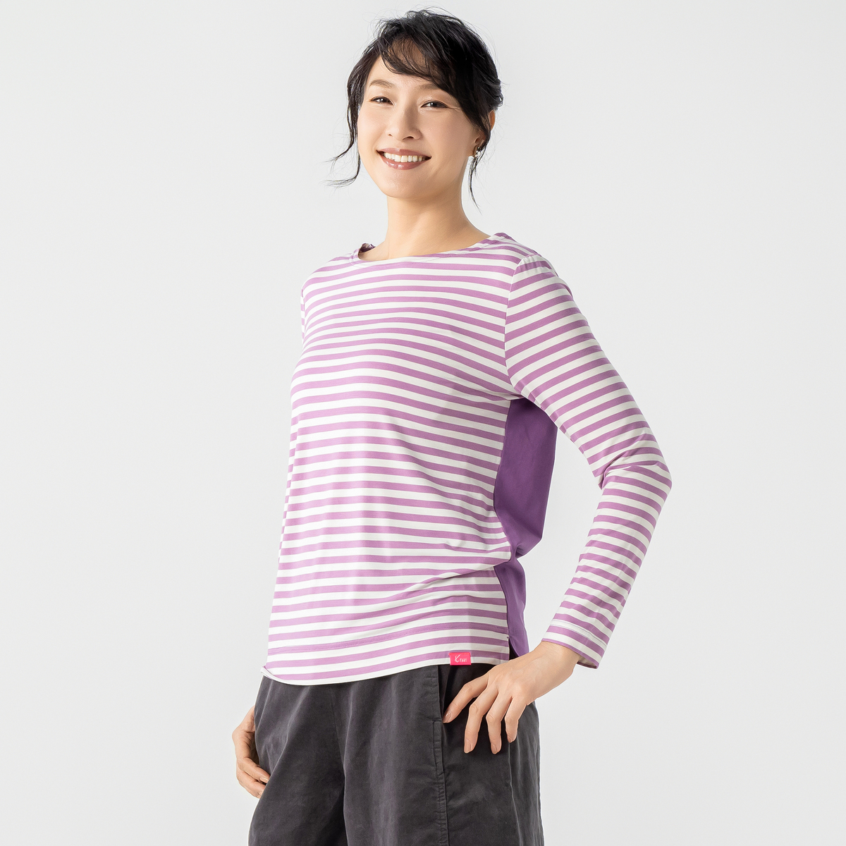 前身頃と袖にボーダーをあしらい、後ろ身頃は無地で仕上げたデザイン性の高いプルオーバー。ボートネック仕様で、カジュアルすぎず上品な印象に。シンプルな組合せで、日常からお出かけまで幅広く活躍します