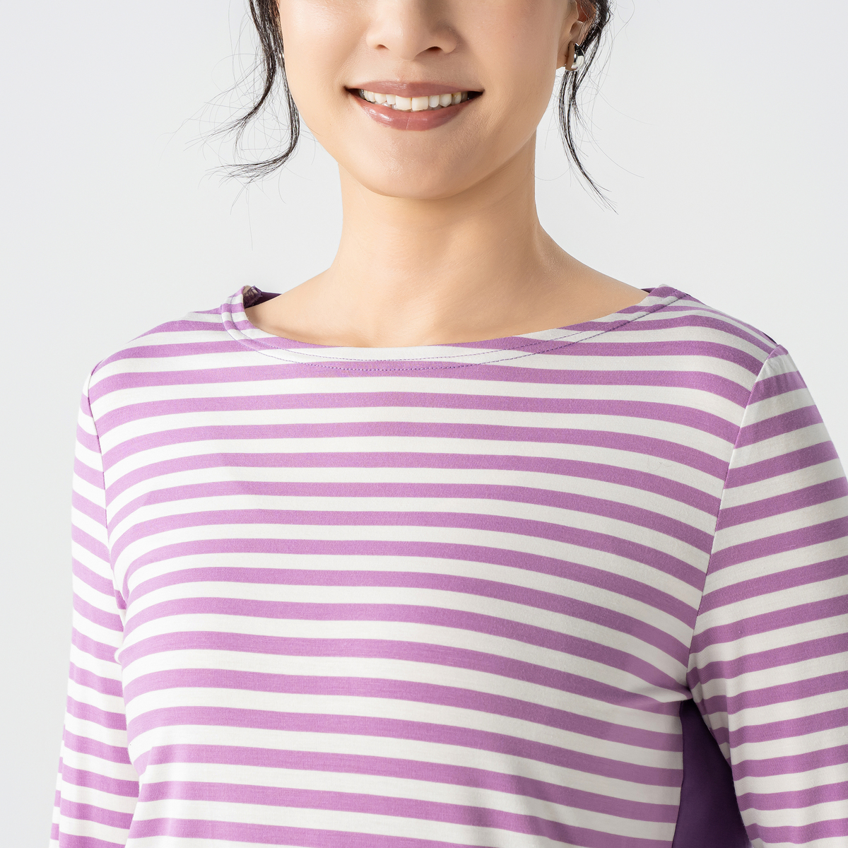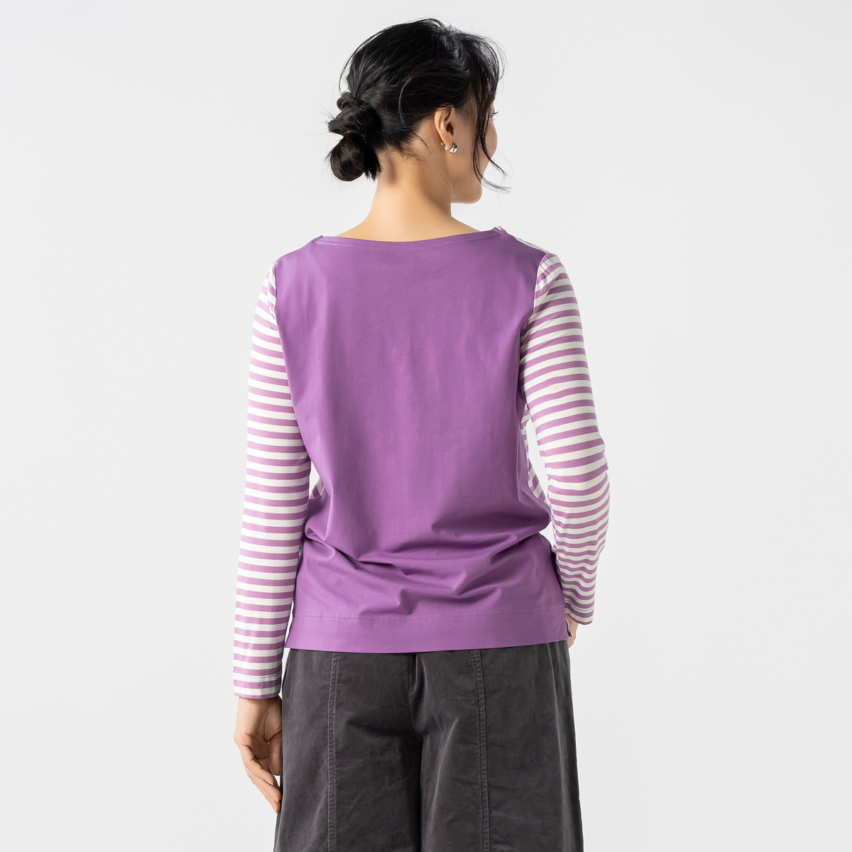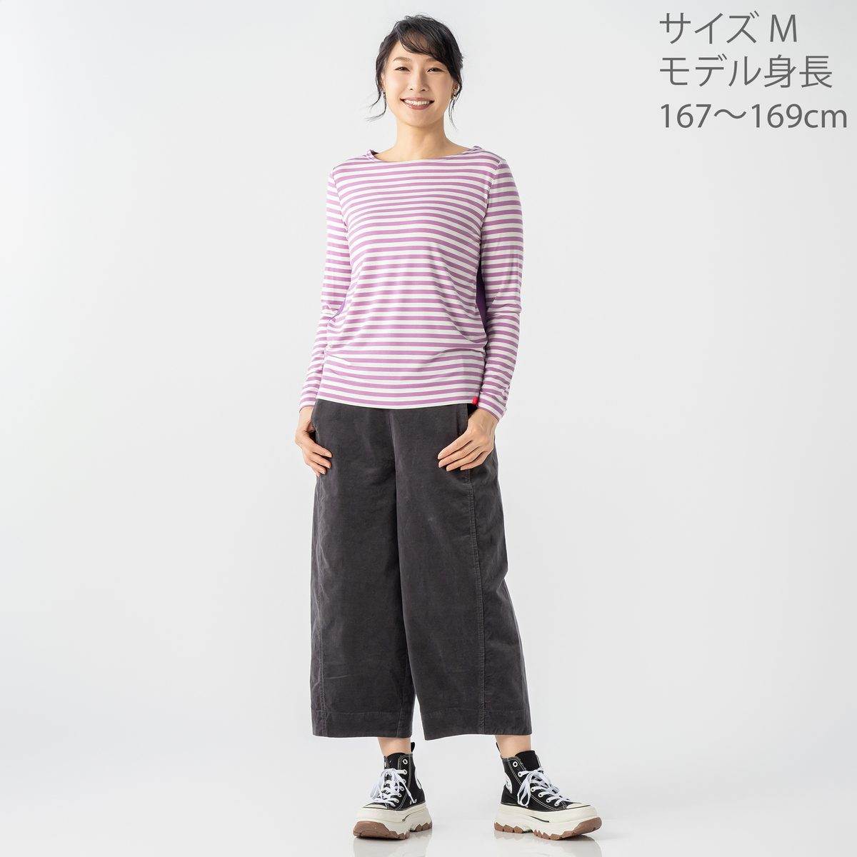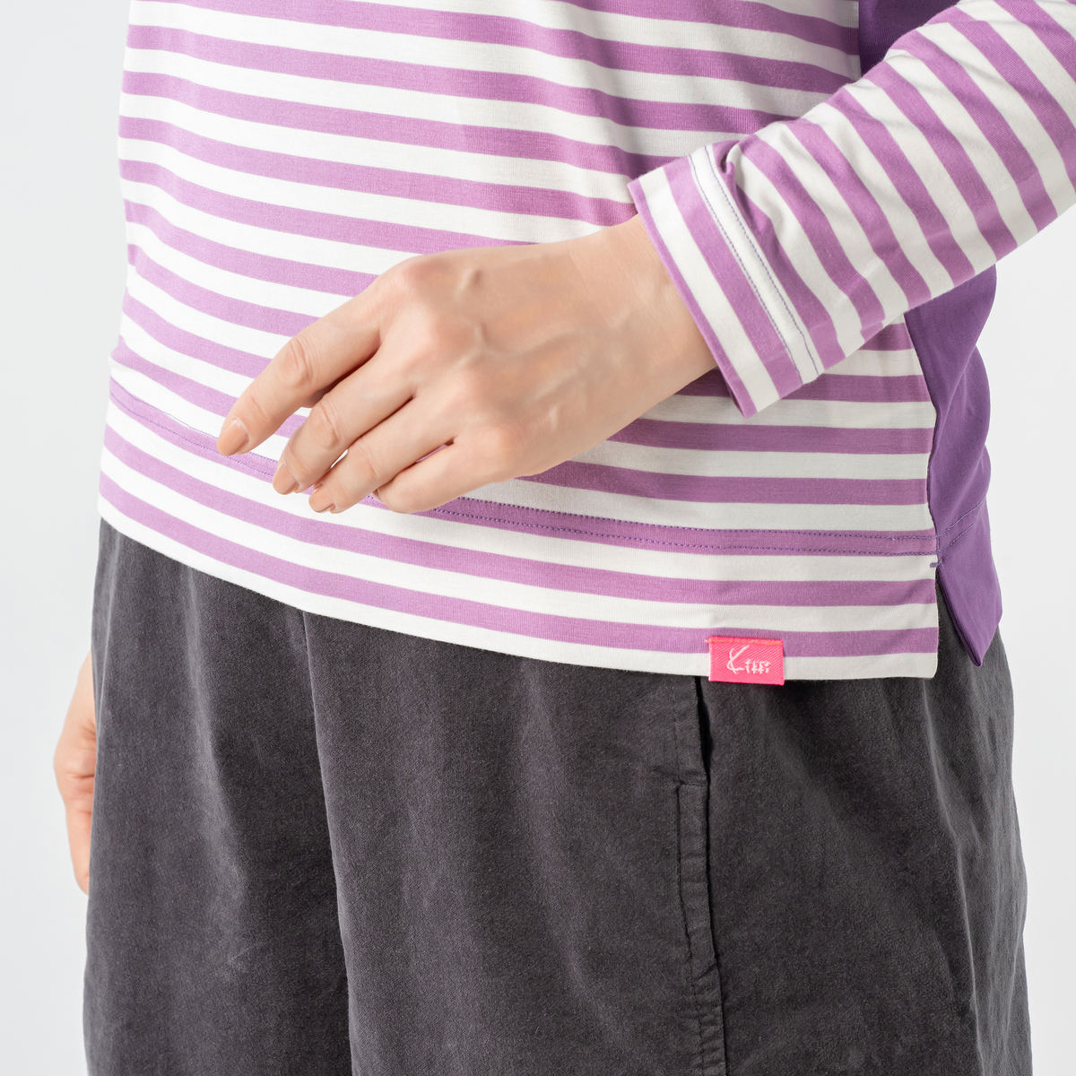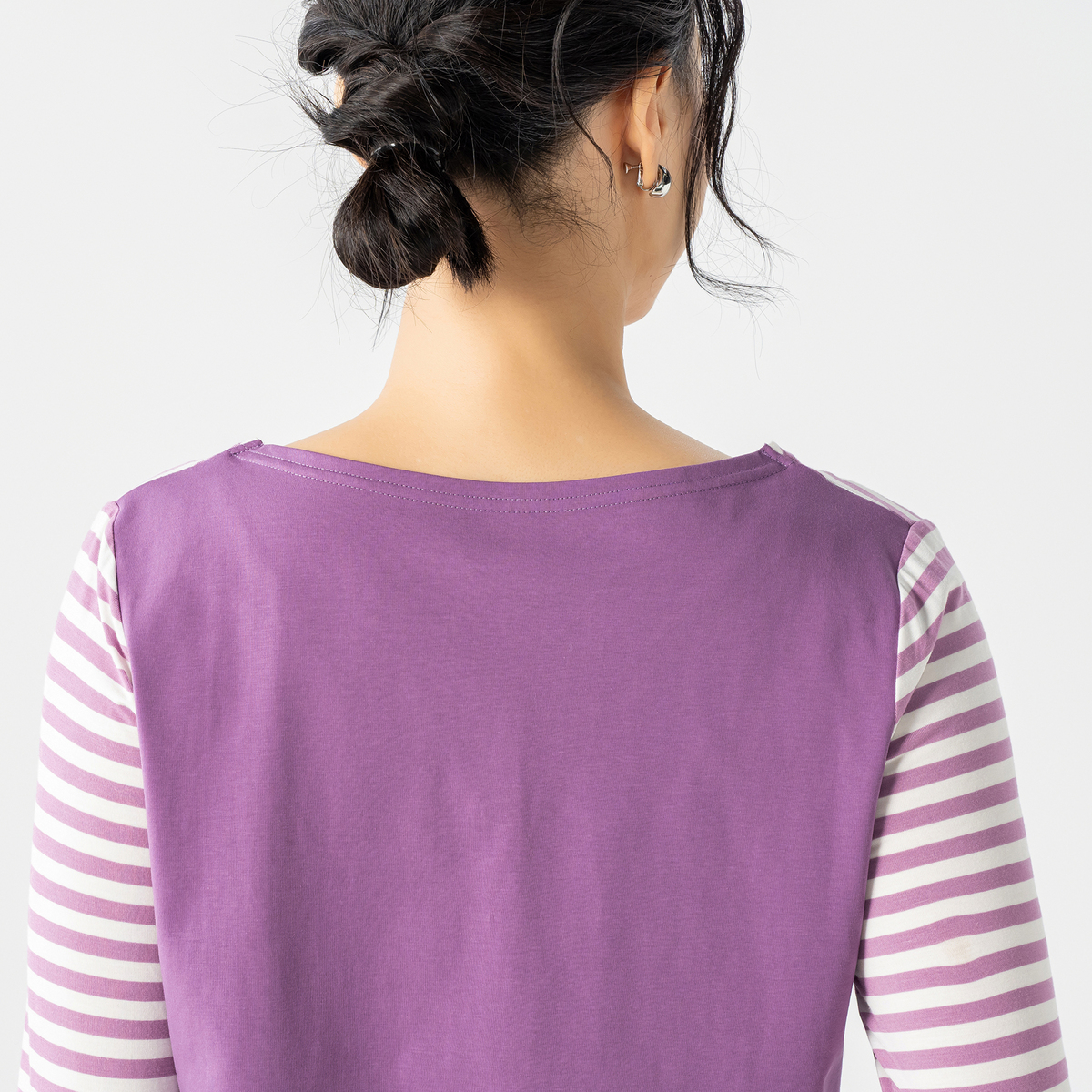 前身頃と袖にボーダーをあしらい、後ろ身頃は無地で仕上げたデザイン性の高いプルオーバー。ボートネック仕様で、カジュアルすぎず上品な印象に。シンプルな組合せで、日常からお出かけまで幅広く活躍します