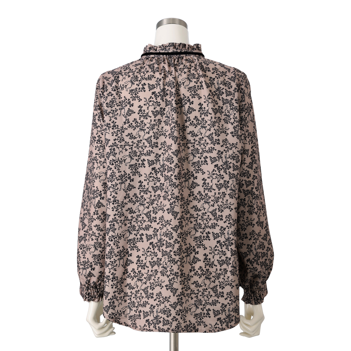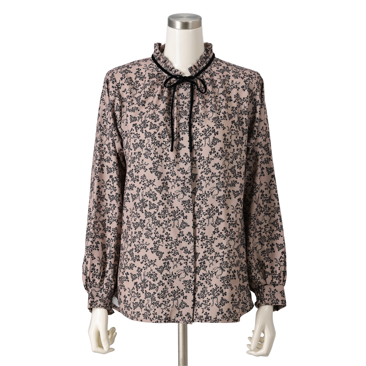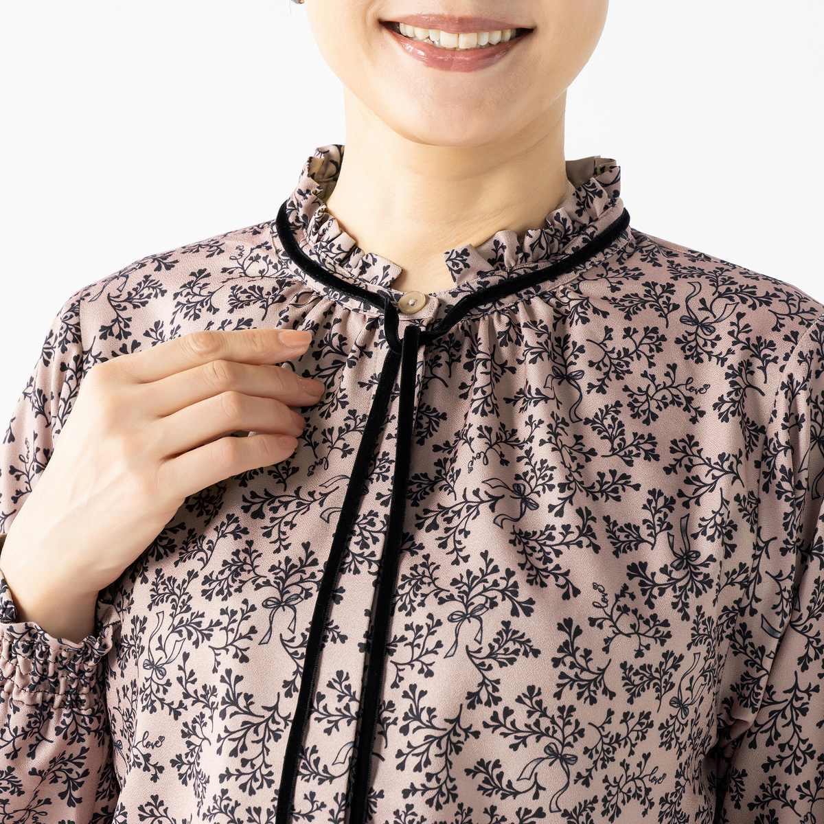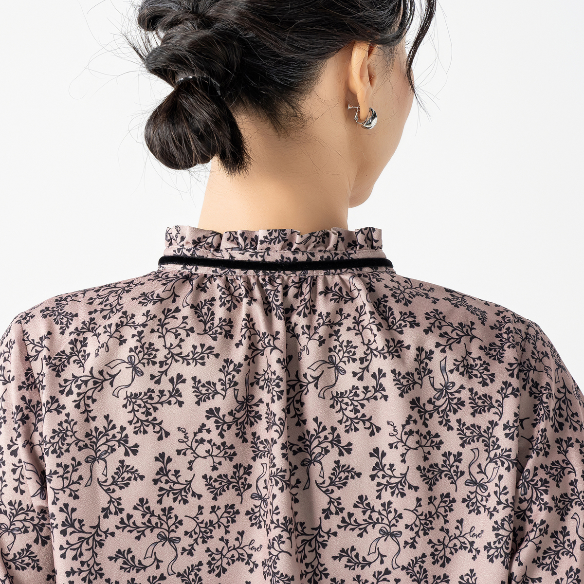 華やかなハートフラワープリントのブラウス。首元のフリルとベルベット調のリボンが上品なアクセントに