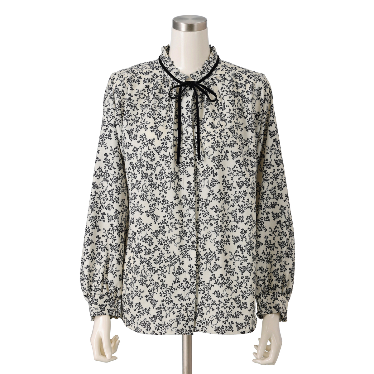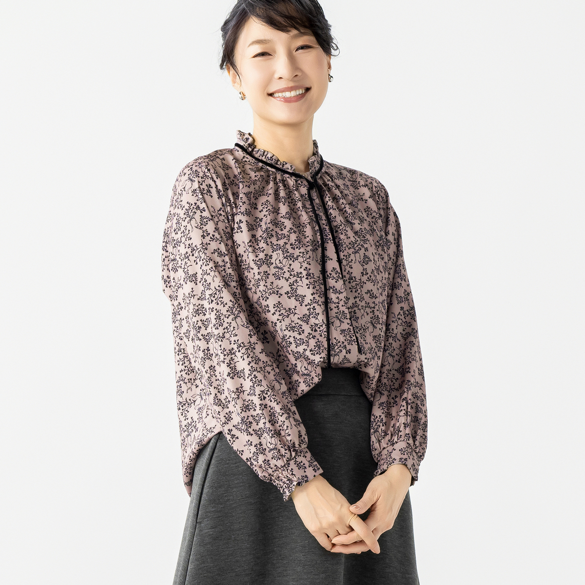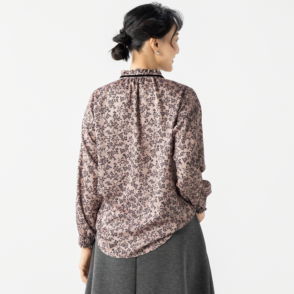 華やかなハートフラワープリントのブラウス。首元のフリルとベルベット調のリボンが上品なアクセントに