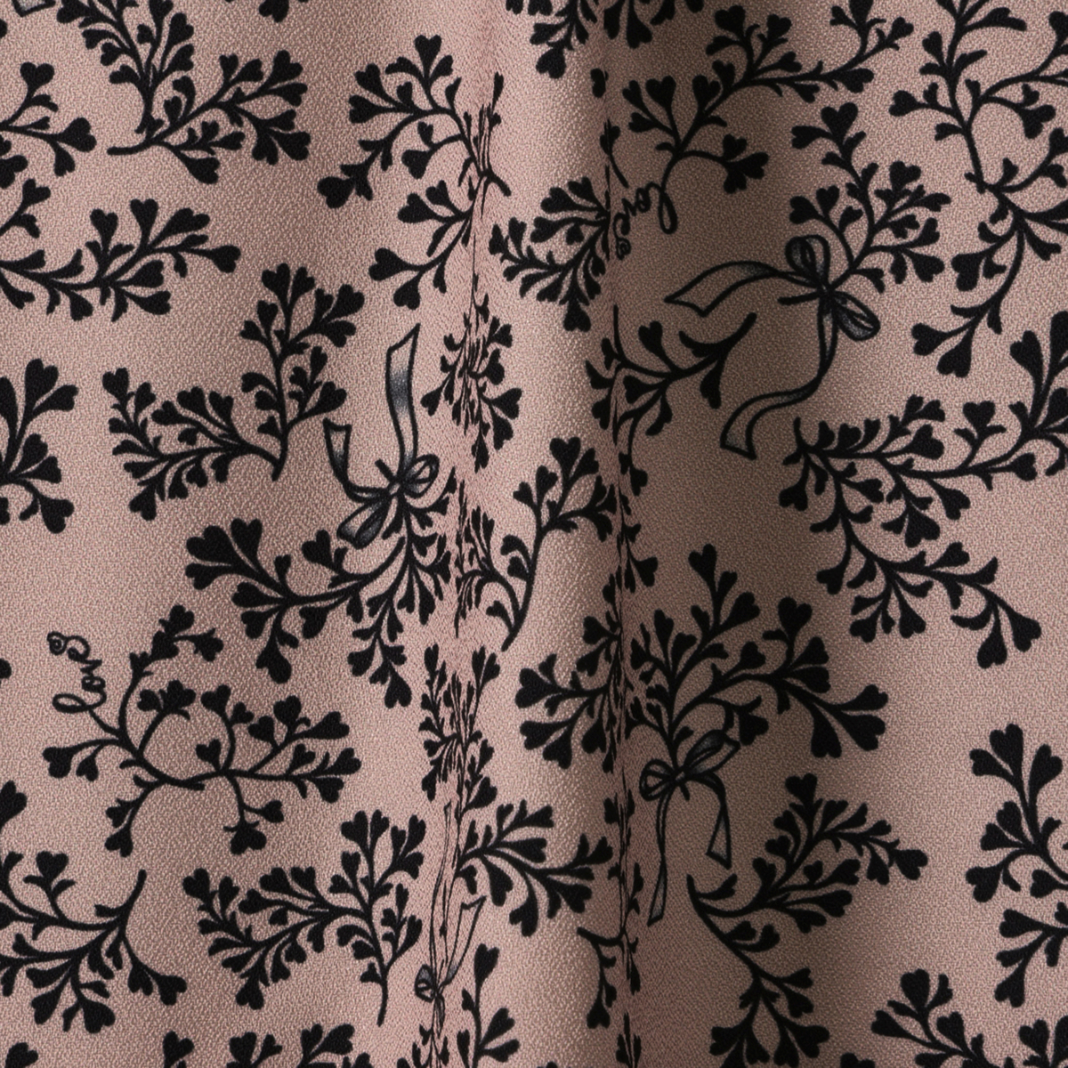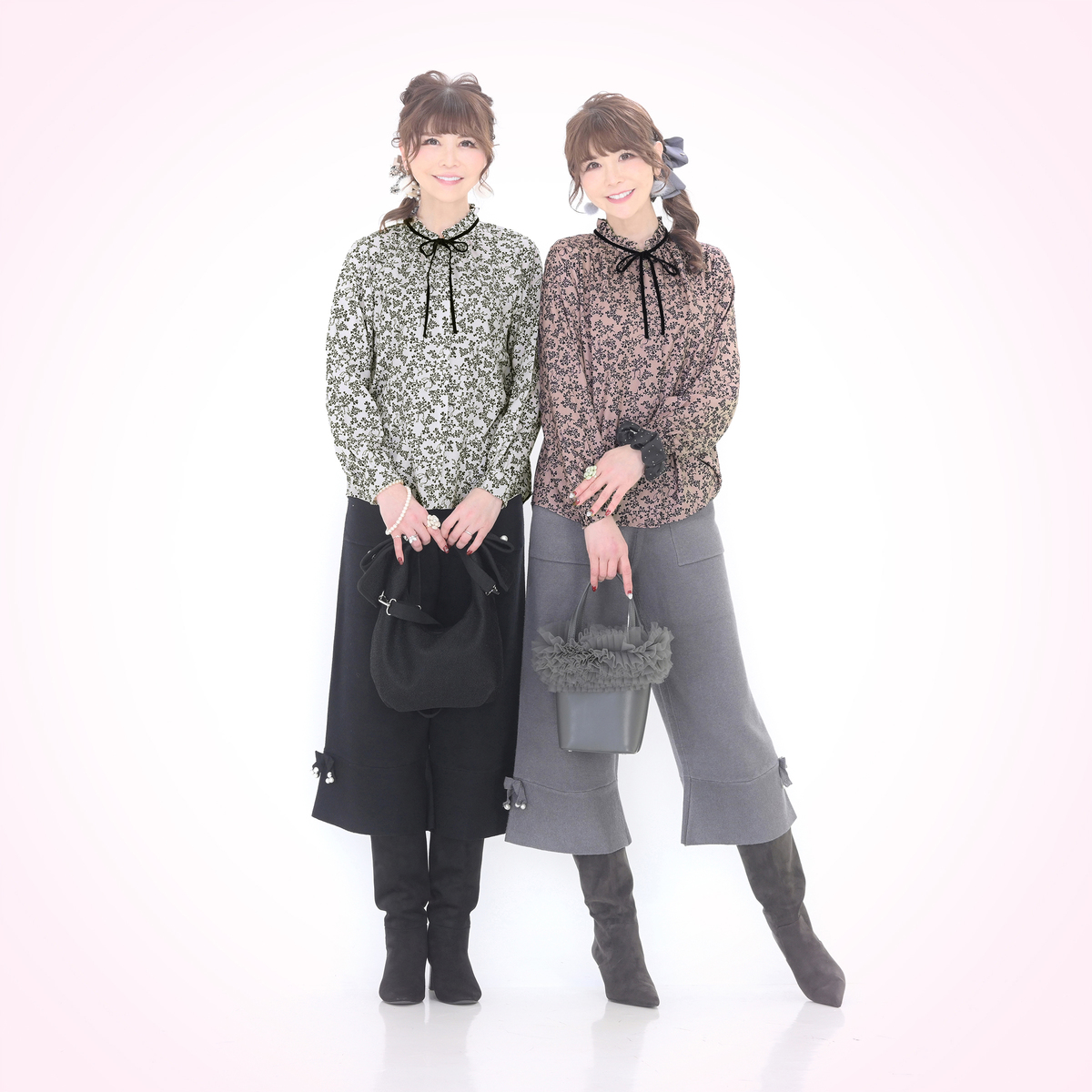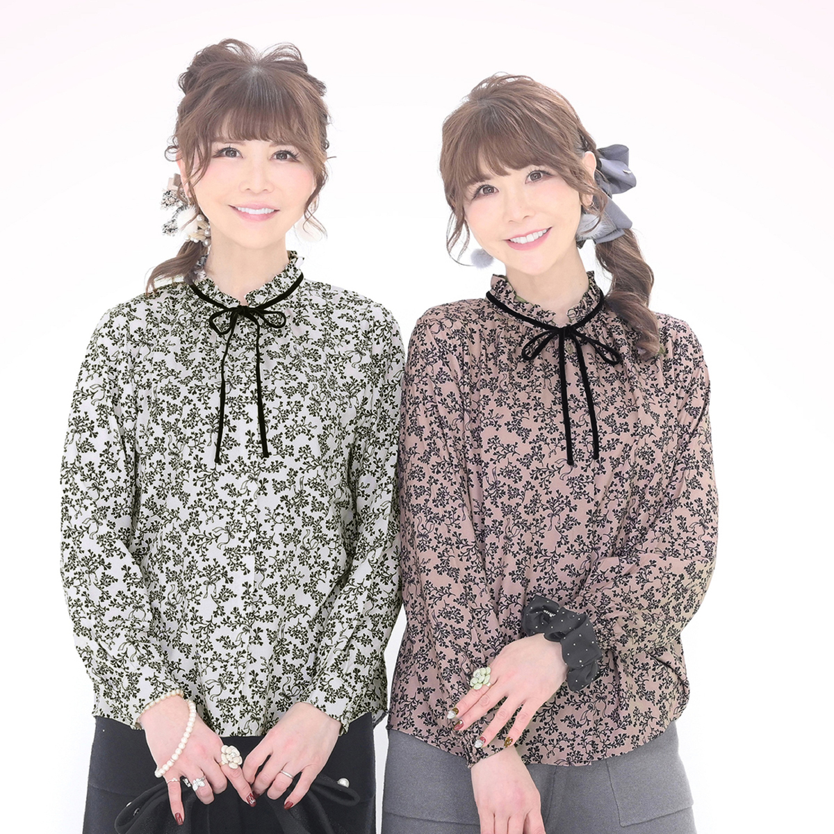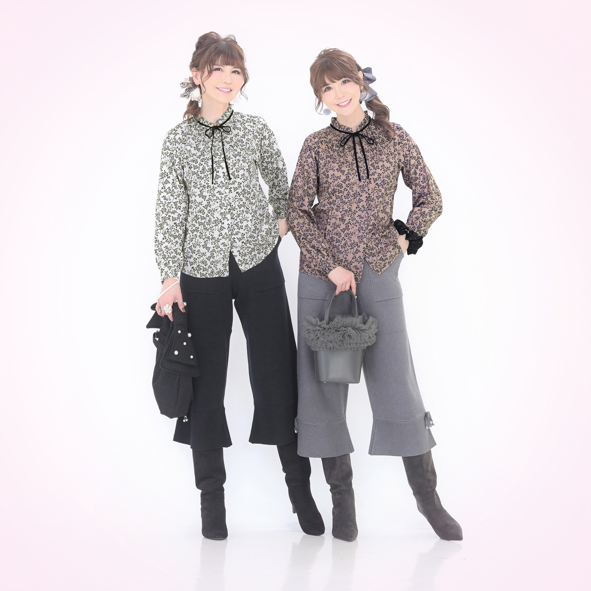 華やかなハートフラワープリントのブラウス。首元のフリルとベルベット調のリボンが上品なアクセントに