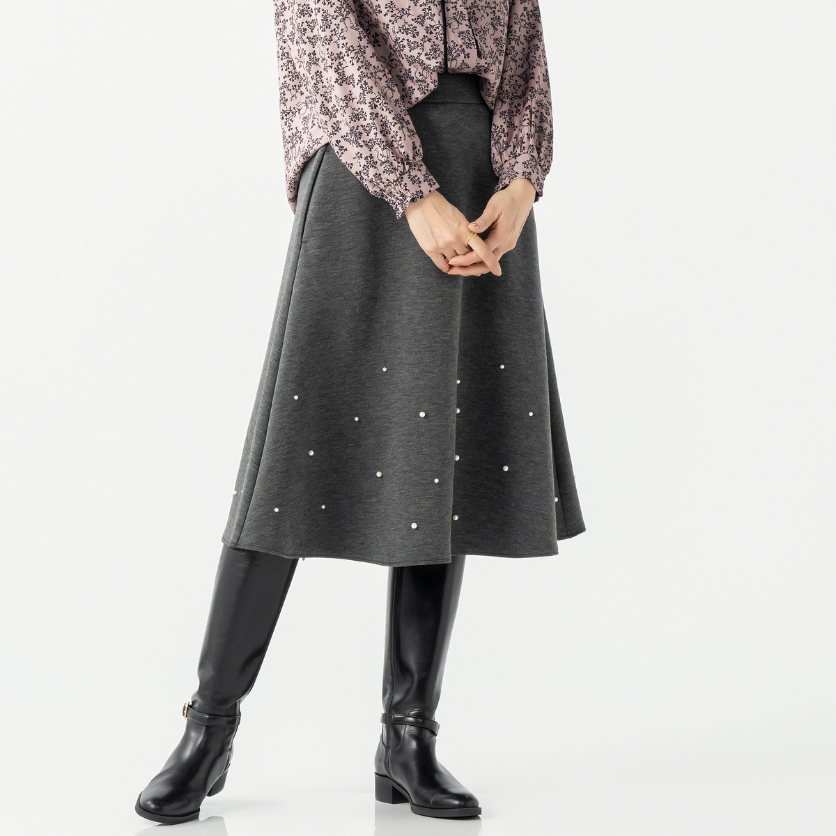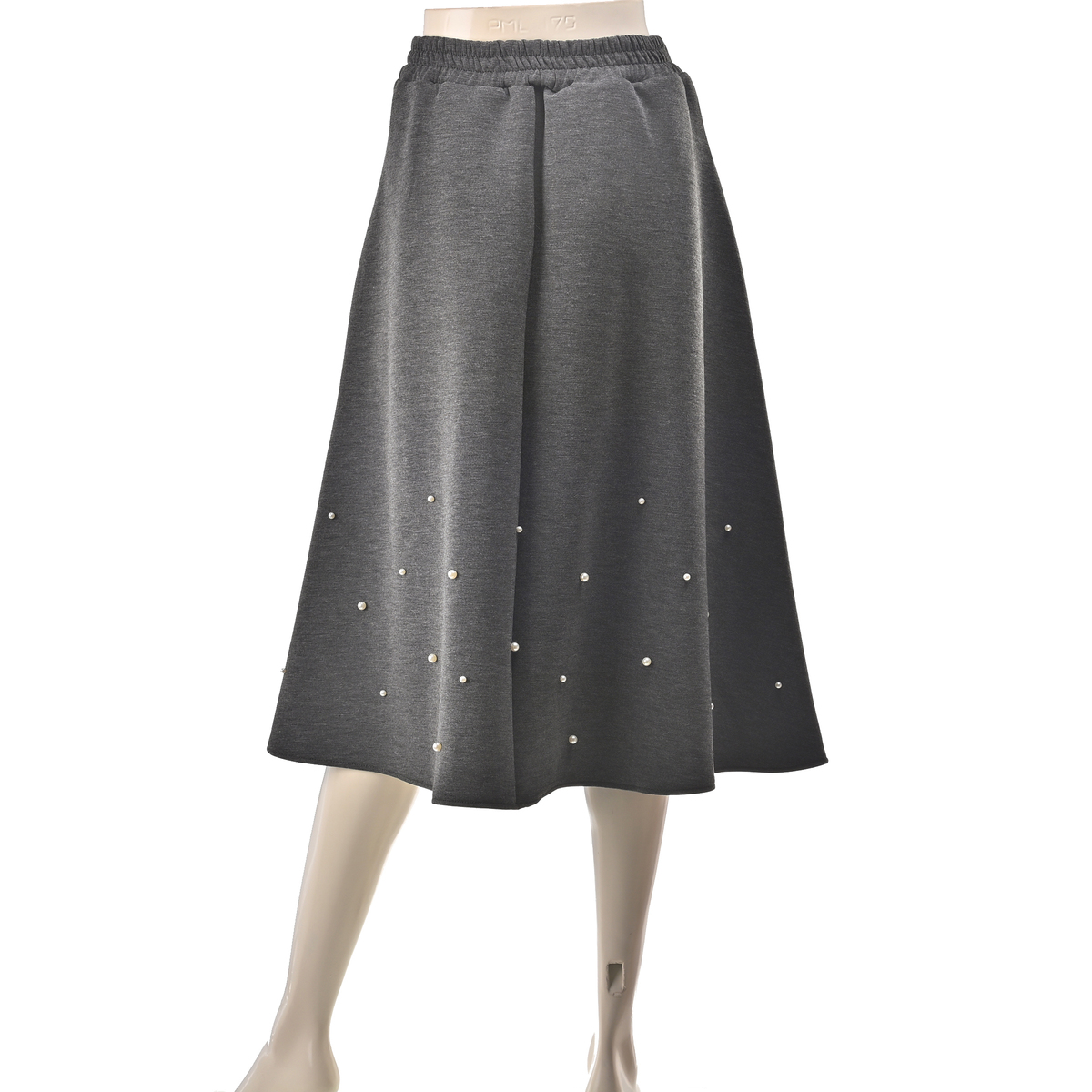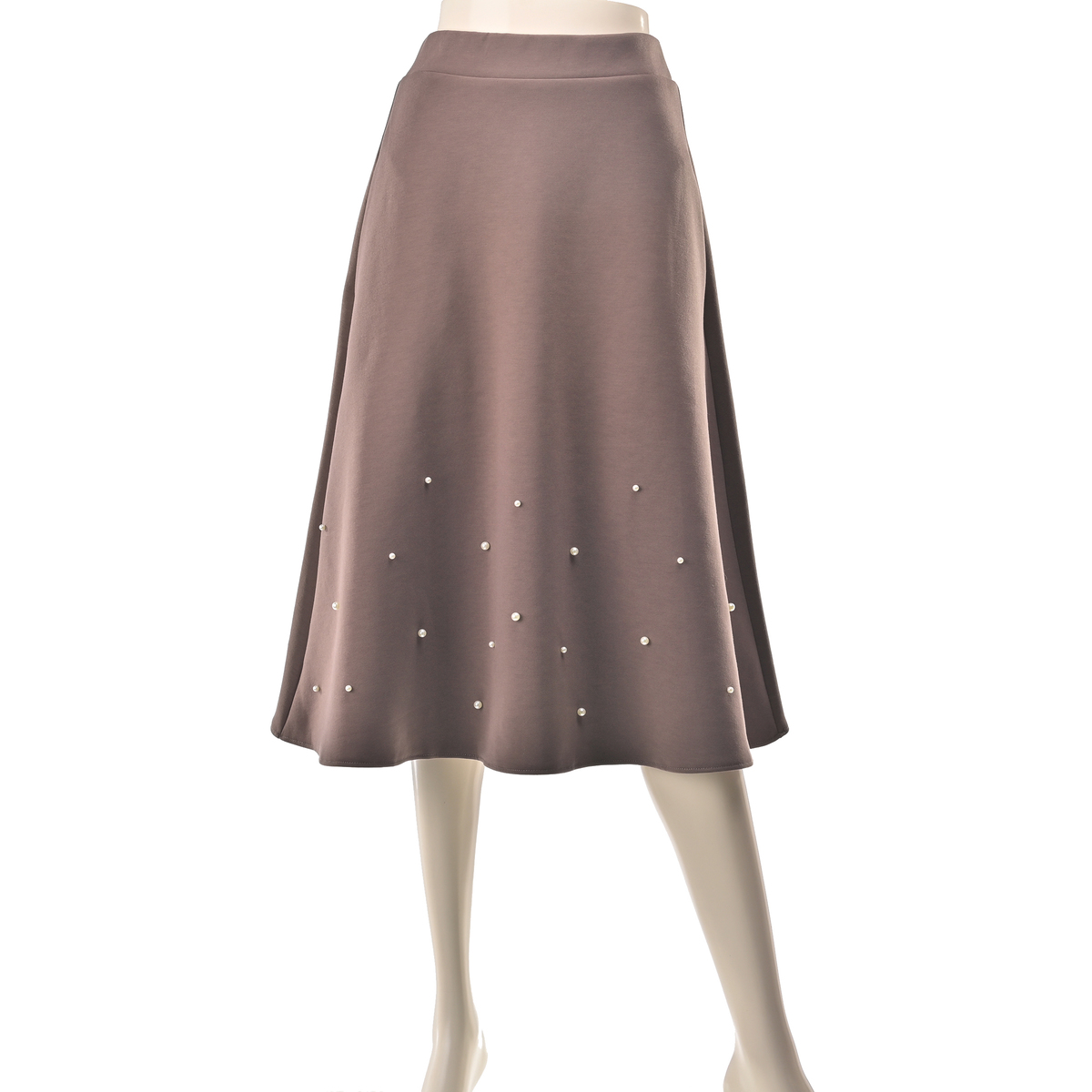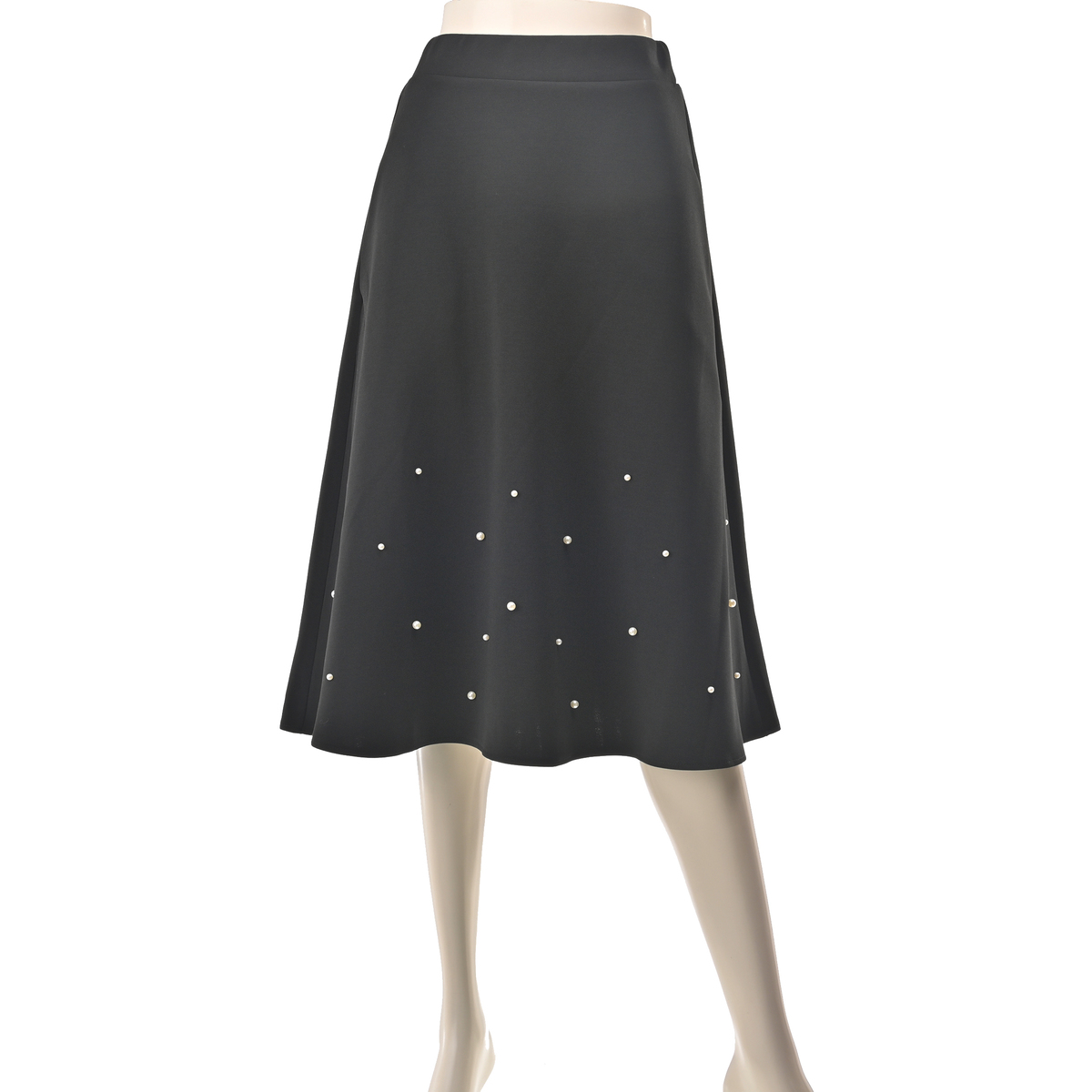 程よい分量感で、ふんわり揺れる裾がエレガントでフェミニンなフレアスカート。異なる2サイズのパール調ビジューをバランスよくランダムにあしらい、動くたびにさりげなく輝きます