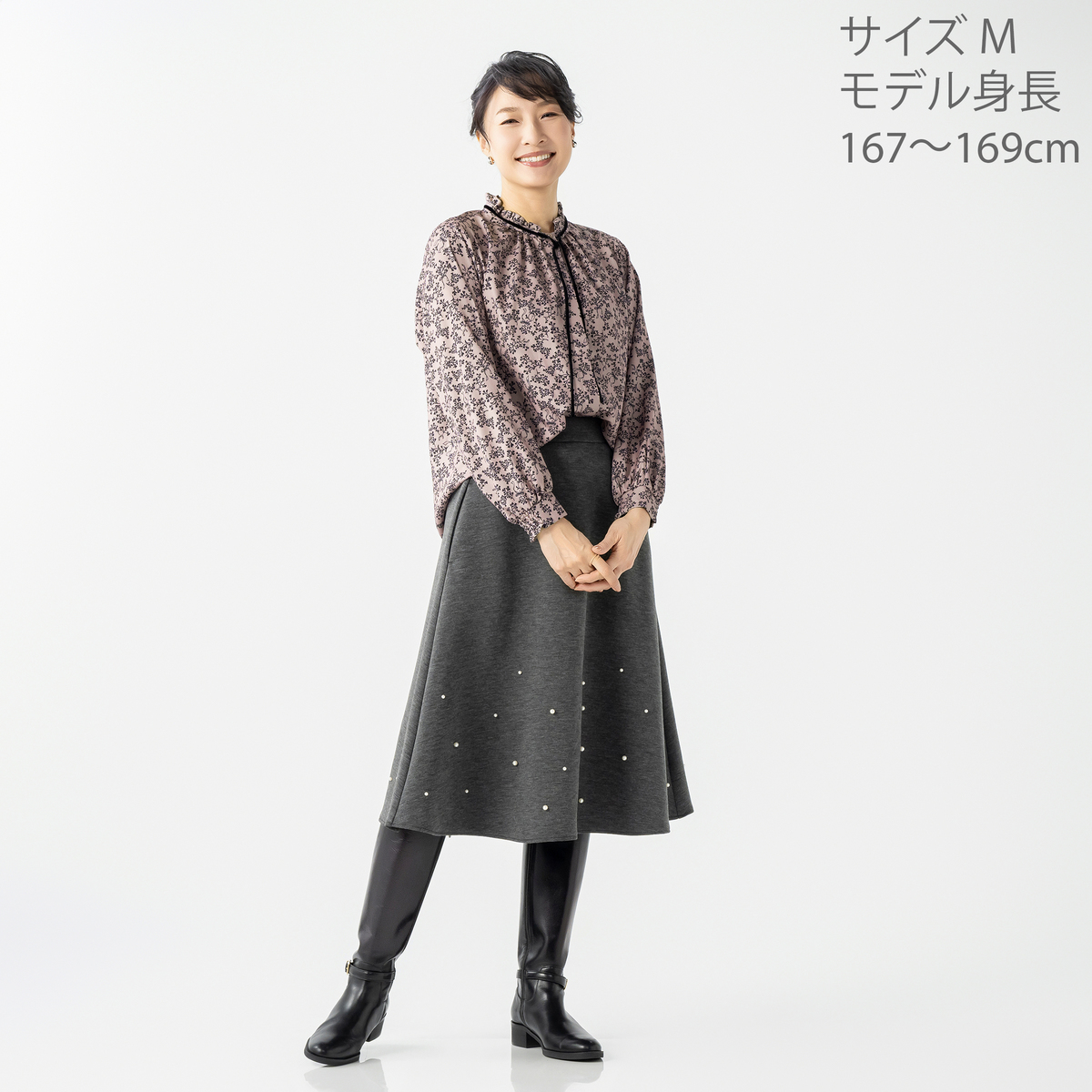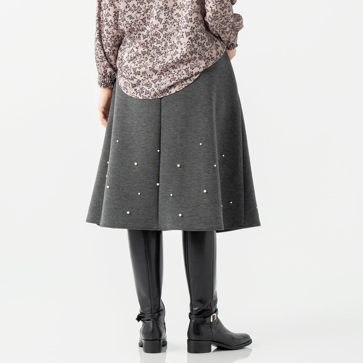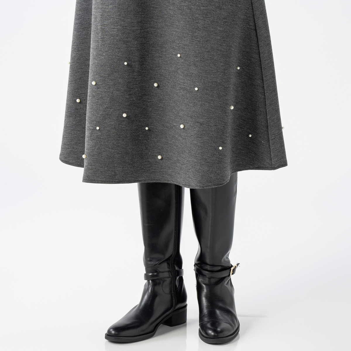 程よい分量感で、ふんわり揺れる裾がエレガントでフェミニンなフレアスカート。異なる2サイズのパール調ビジューをバランスよくランダムにあしらい、動くたびにさりげなく輝きます