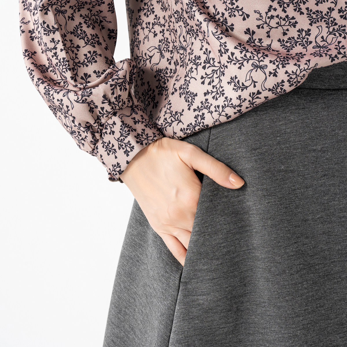 前ウエストはフラット仕様でトップスインがきれいに決まるデザイン。両脇ポケット付きで使い勝手も良く、ダンボールニットの程よい張り感と柔らかさが、エレガントなシルエットを美しく際立たせます