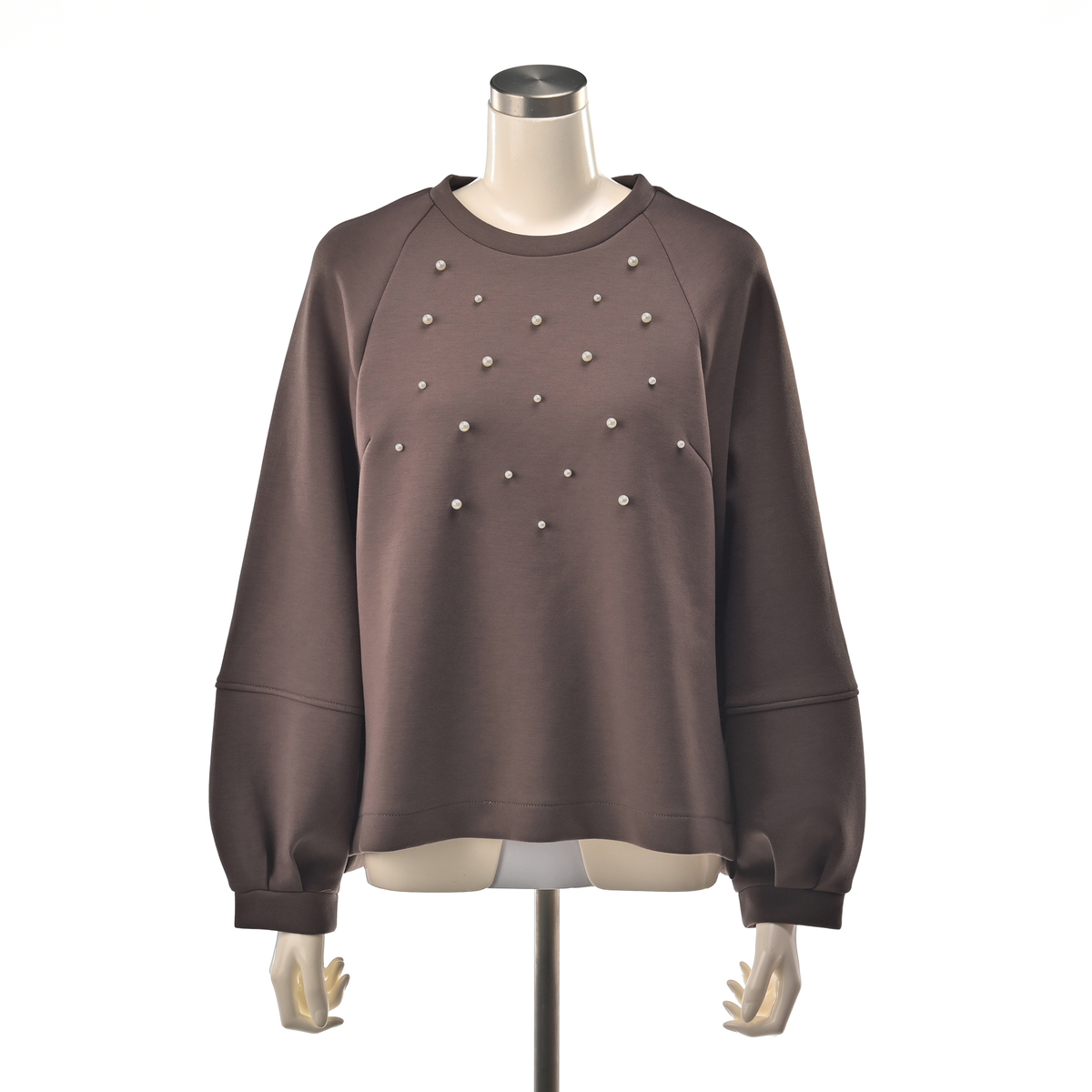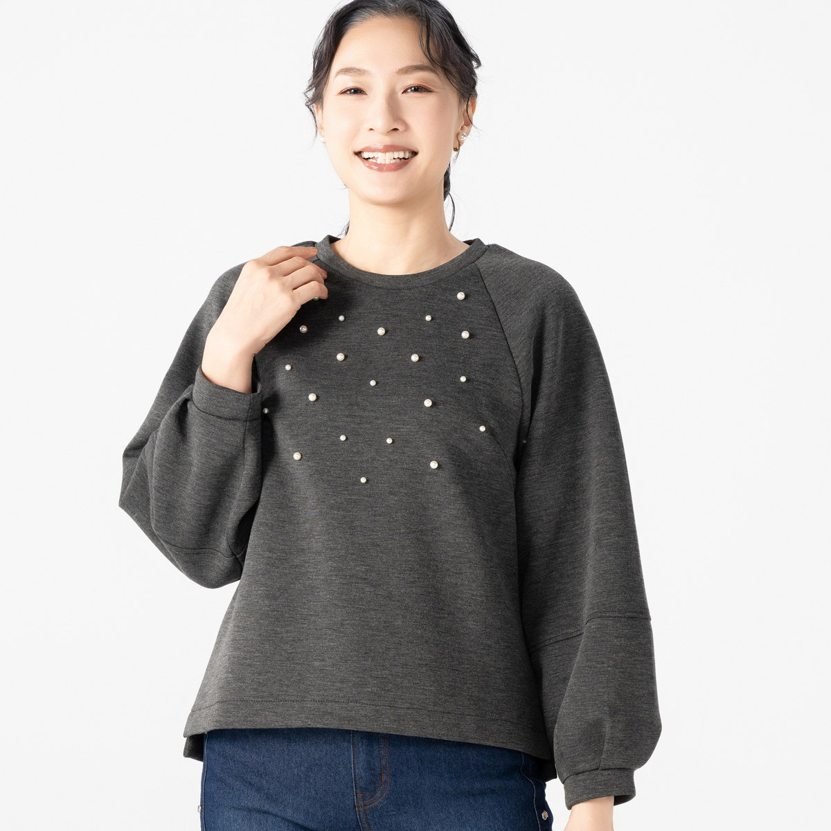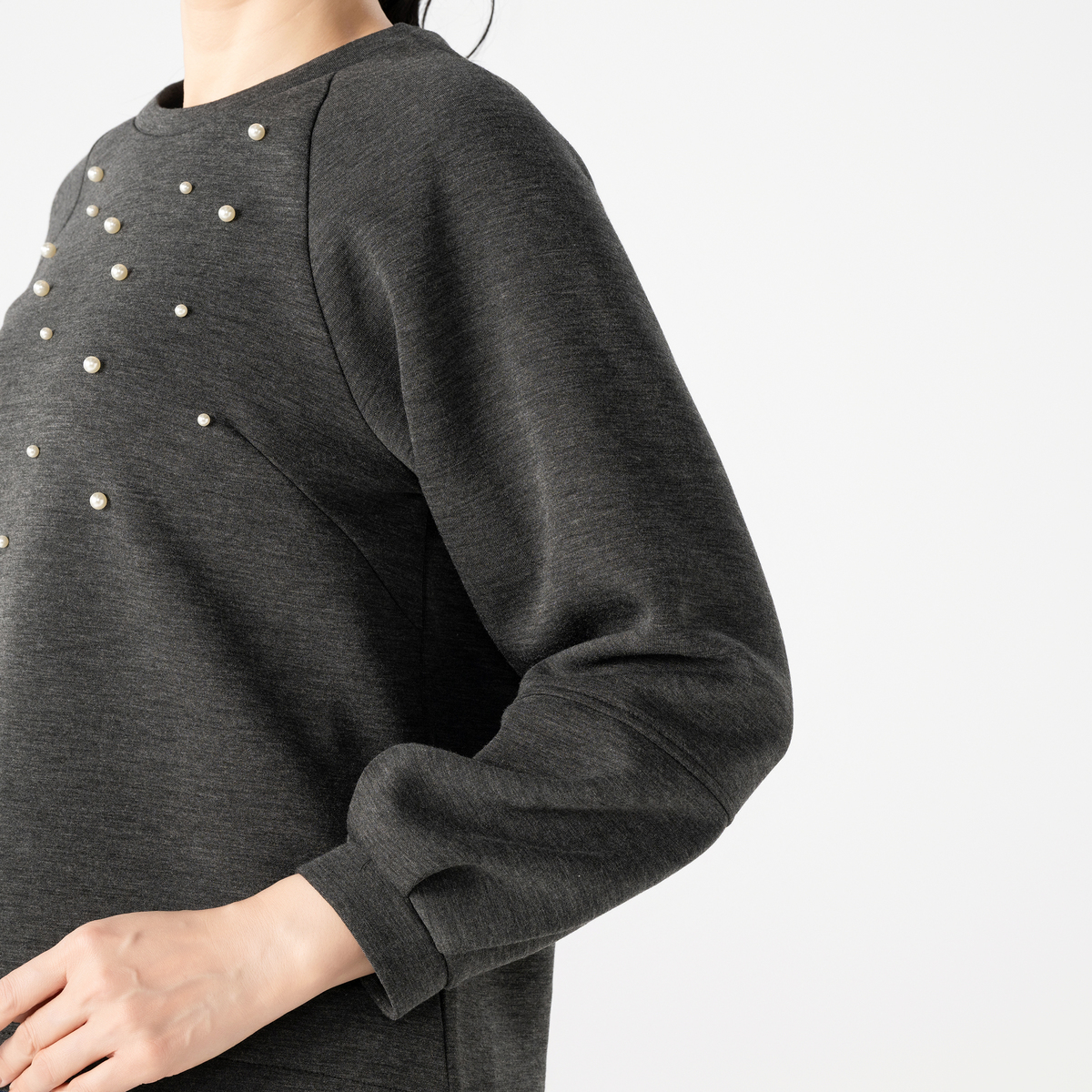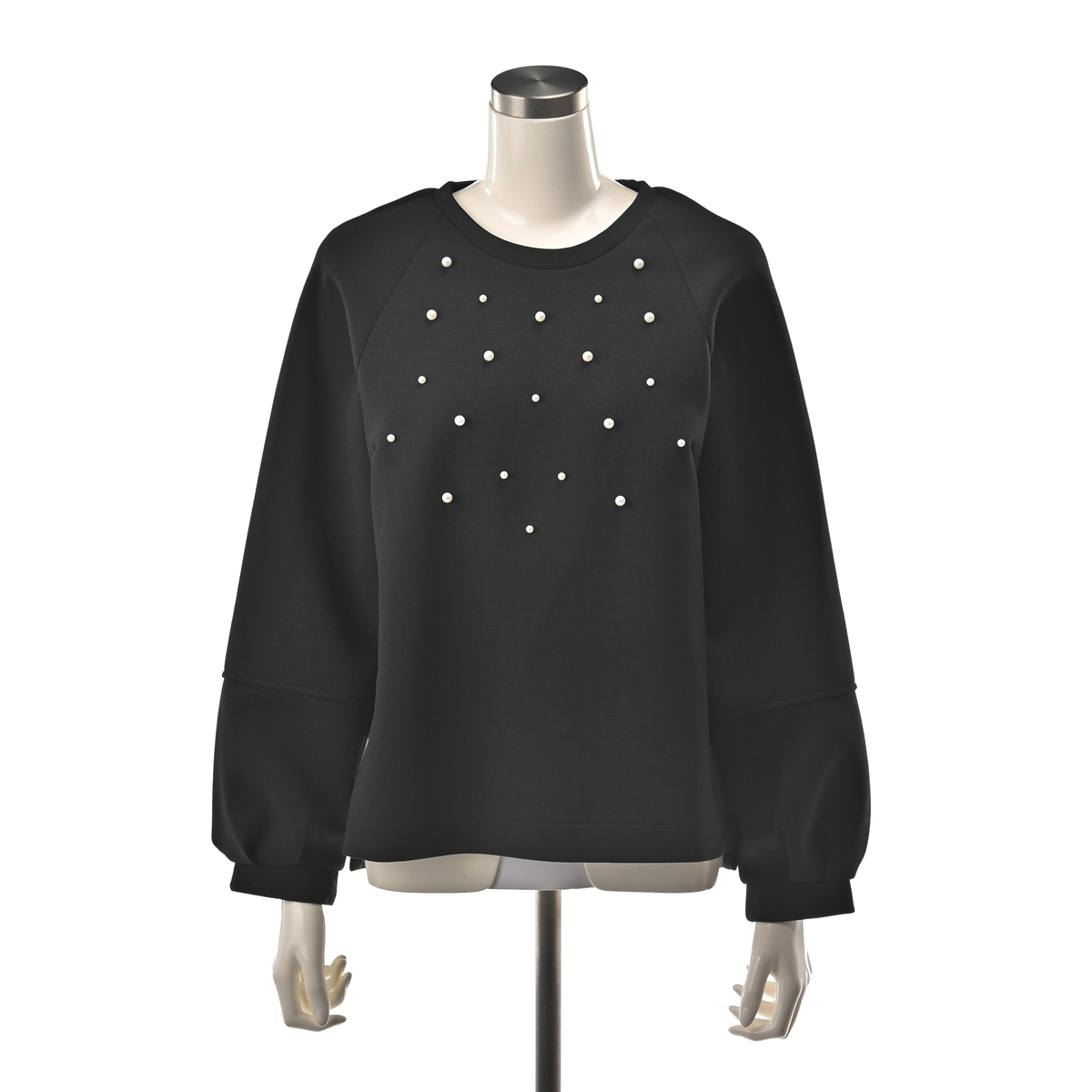 ダンボールニット素材が程良い張り感と柔らかさを両立し、表面のなめらかさが上品な印象を与えるトップス。大小のパール調ビジューをバランスよくランダムに散りばめ、アクセサリーなしでもお顔まわりが明るく映えます