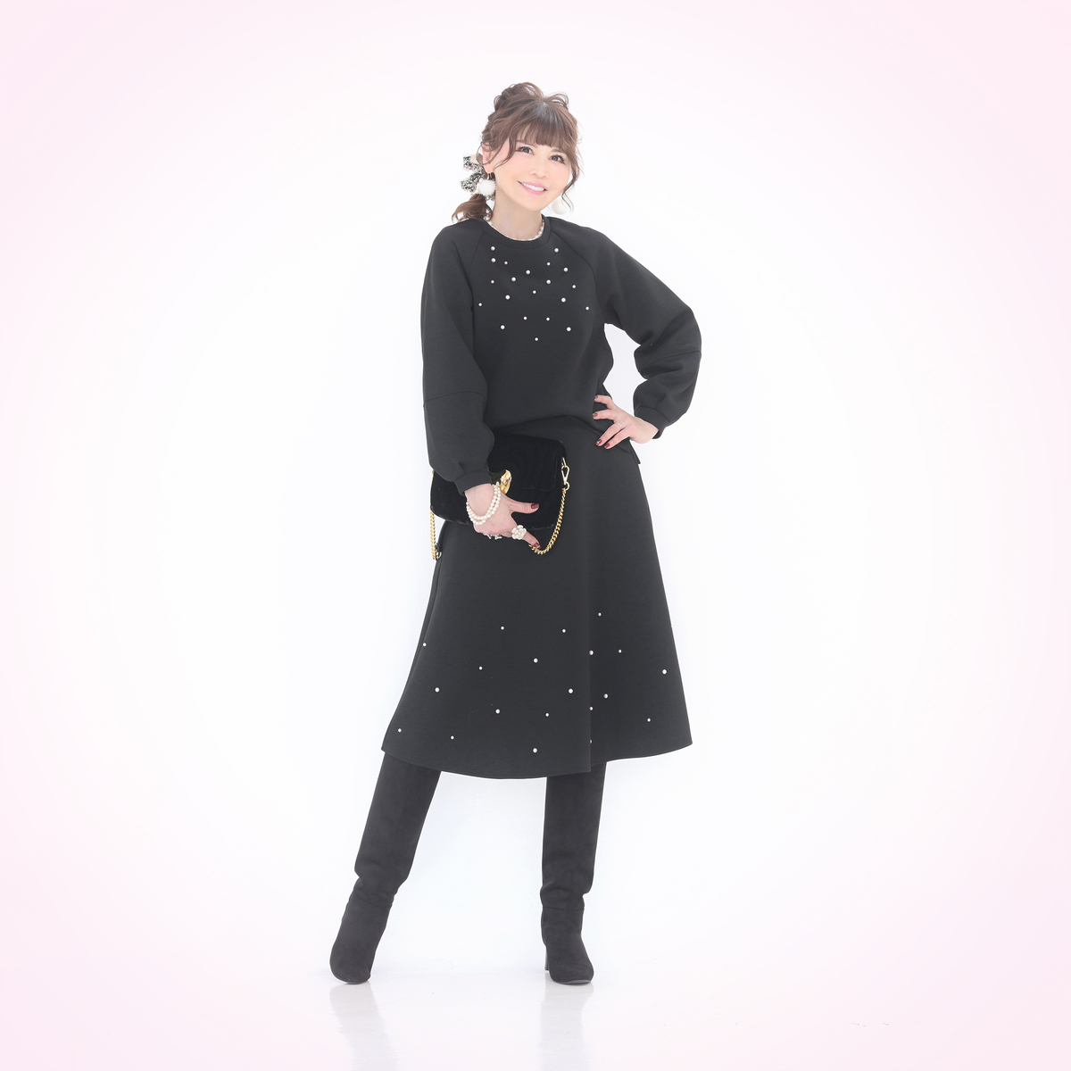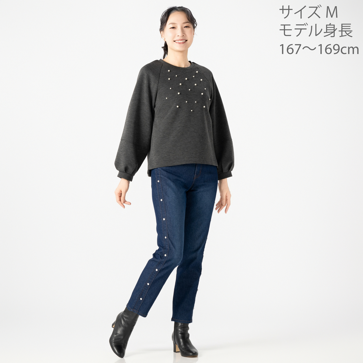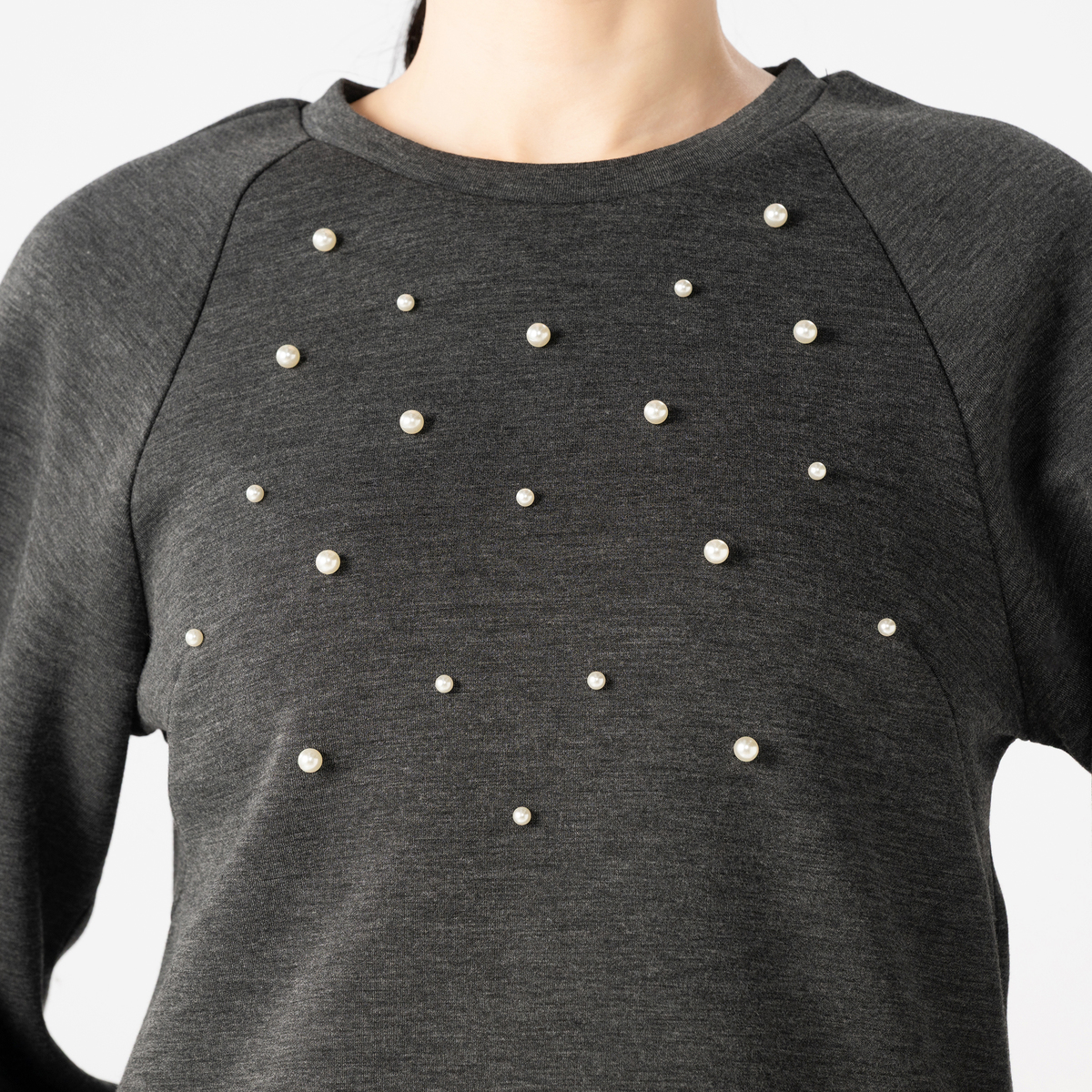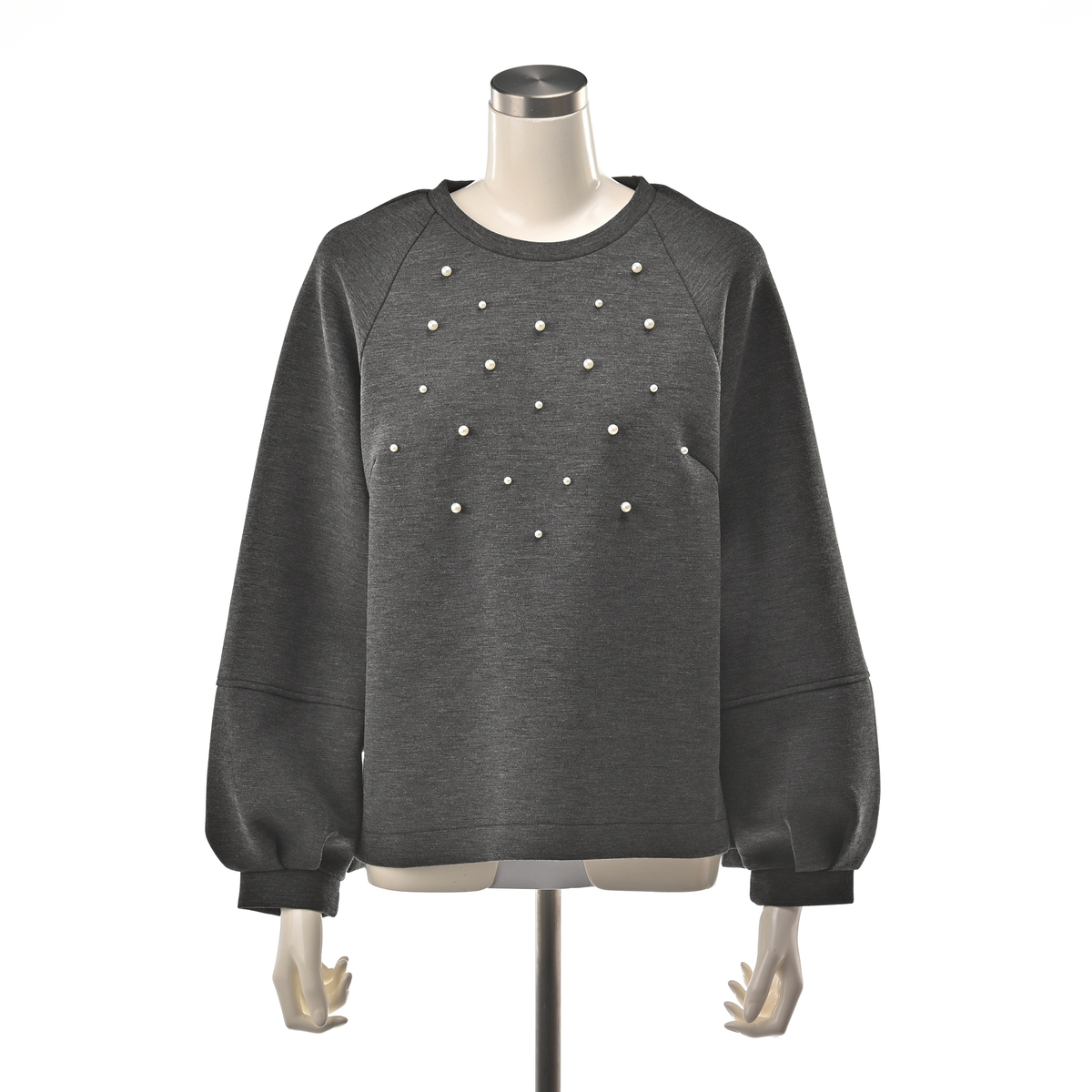 ダンボールニット素材が程良い張り感と柔らかさを両立し、表面のなめらかさが上品な印象を与えるトップス。大小のパール調ビジューをバランスよくランダムに散りばめ、アクセサリーなしでもお顔まわりが明るく映えます