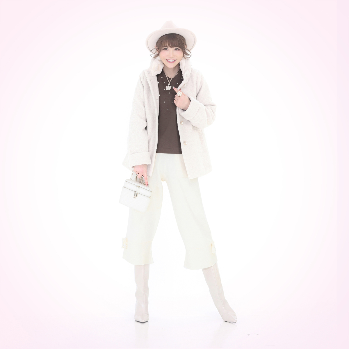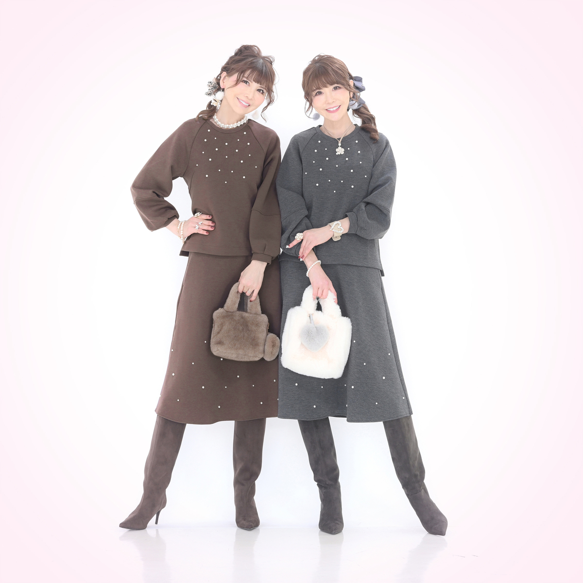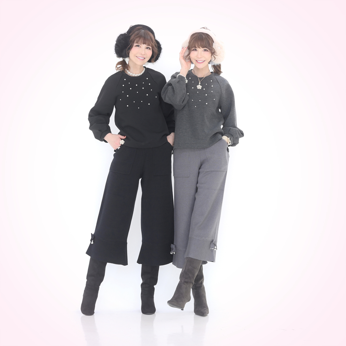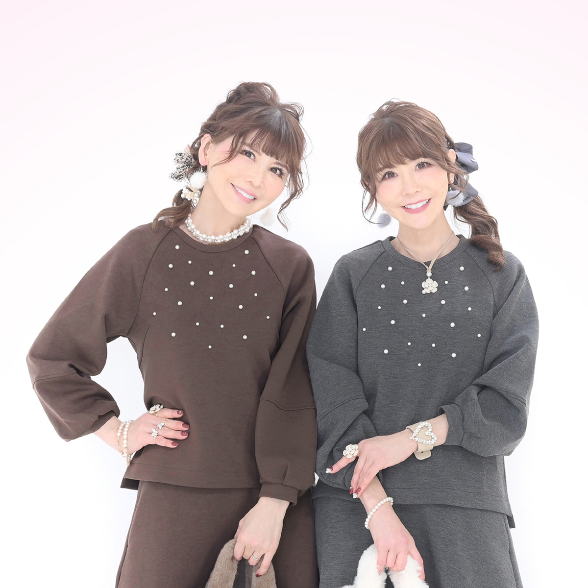 ダンボールニット素材が程良い張り感と柔らかさを両立し、表面のなめらかさが上品な印象を与えるトップス。大小のパール調ビジューをバランスよくランダムに散りばめ、アクセサリーなしでもお顔まわりが明るく映えます