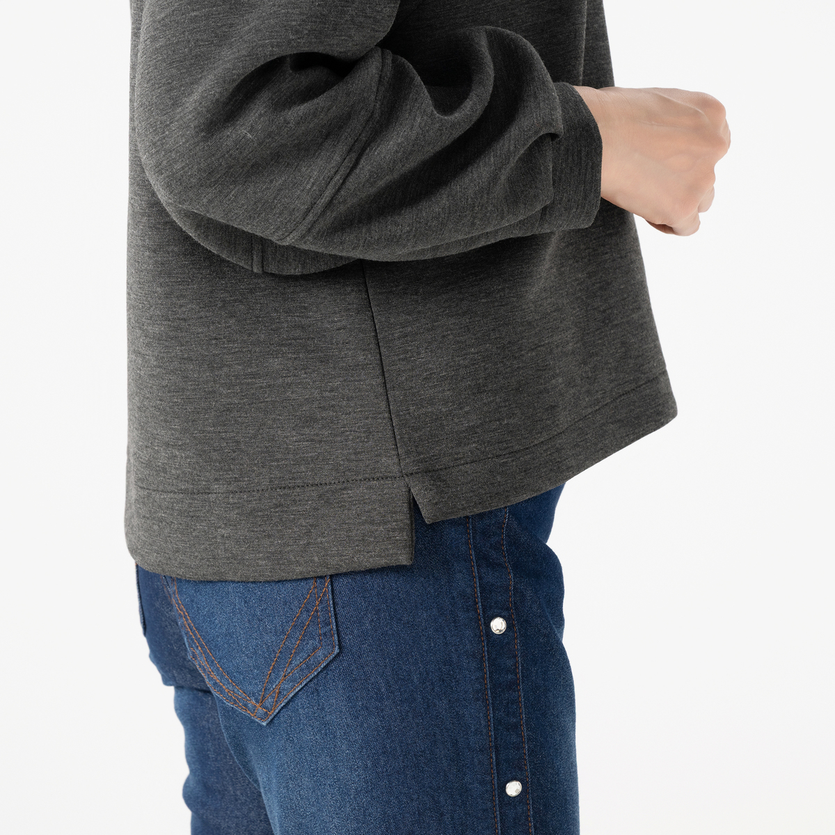 前身頃のバストダーツがフェミニンな立体感を演出し、裾両サイドのスリットが抜け感と動きやすさを叶えます