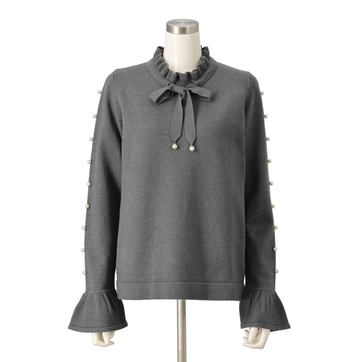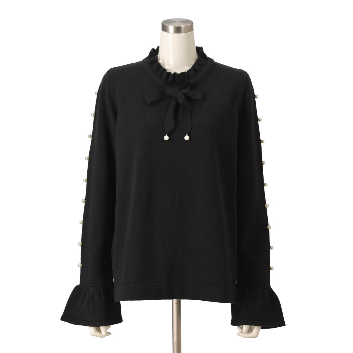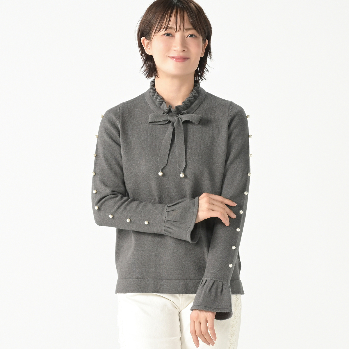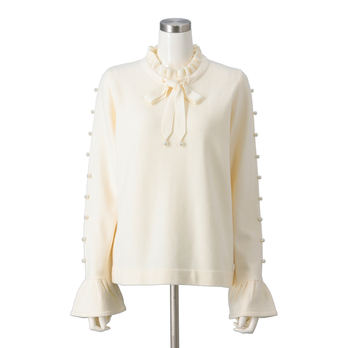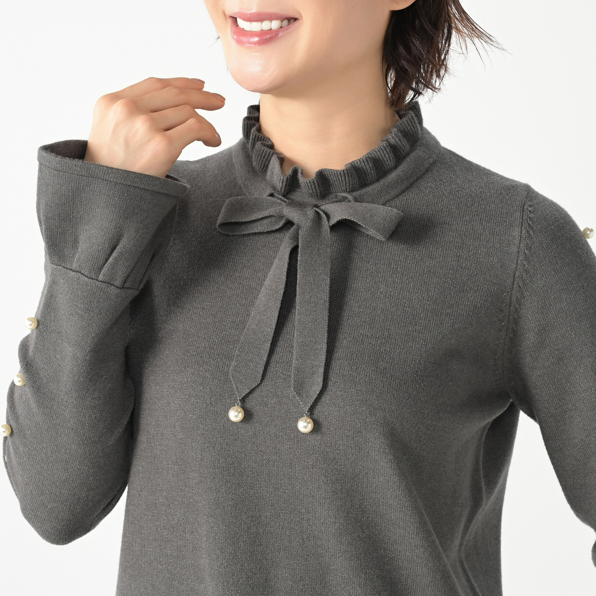 襟元のリボンと重ねたフリルが、お顔まわりを明るく華やかに。袖にはパール調ビジューを贅沢にあしらい、襟リボンの先端にもパール調モチーフをプラス。袖口には大ぶりのフレアデザインを採用し、手首が細く見える効果が期待できます