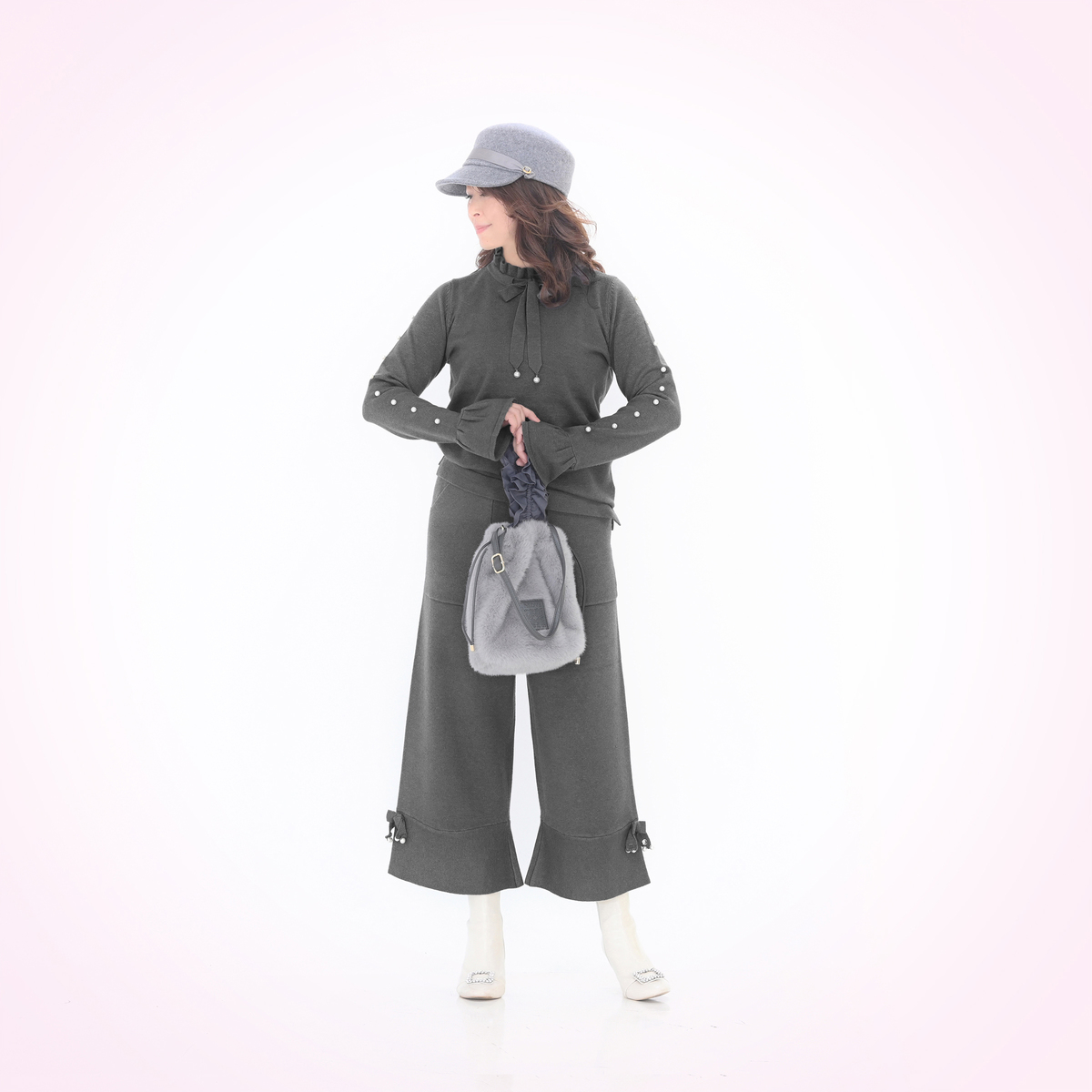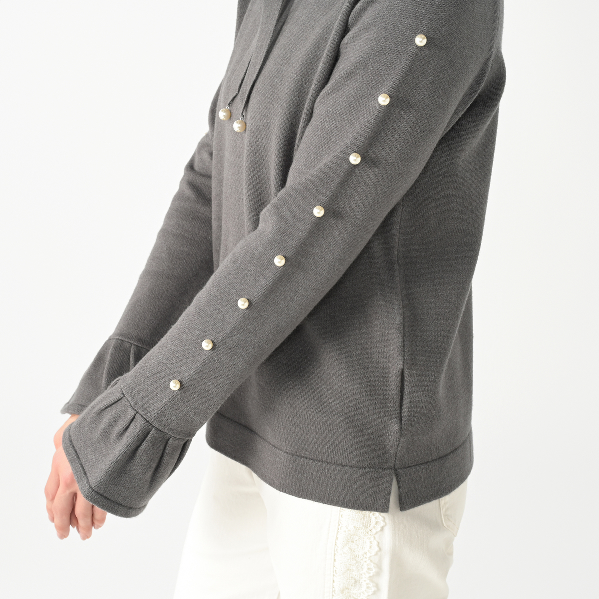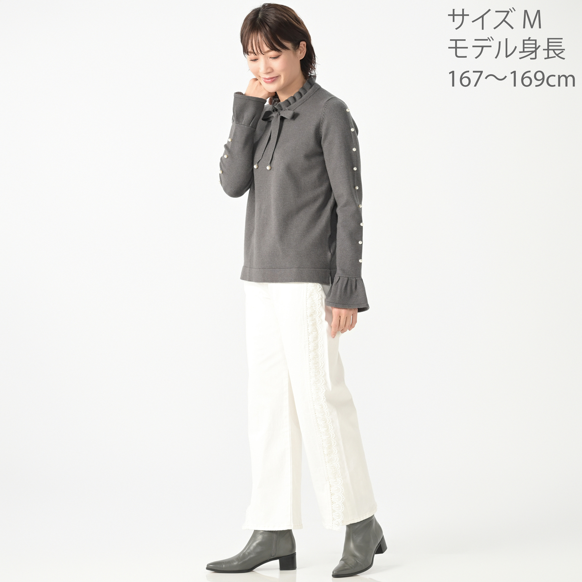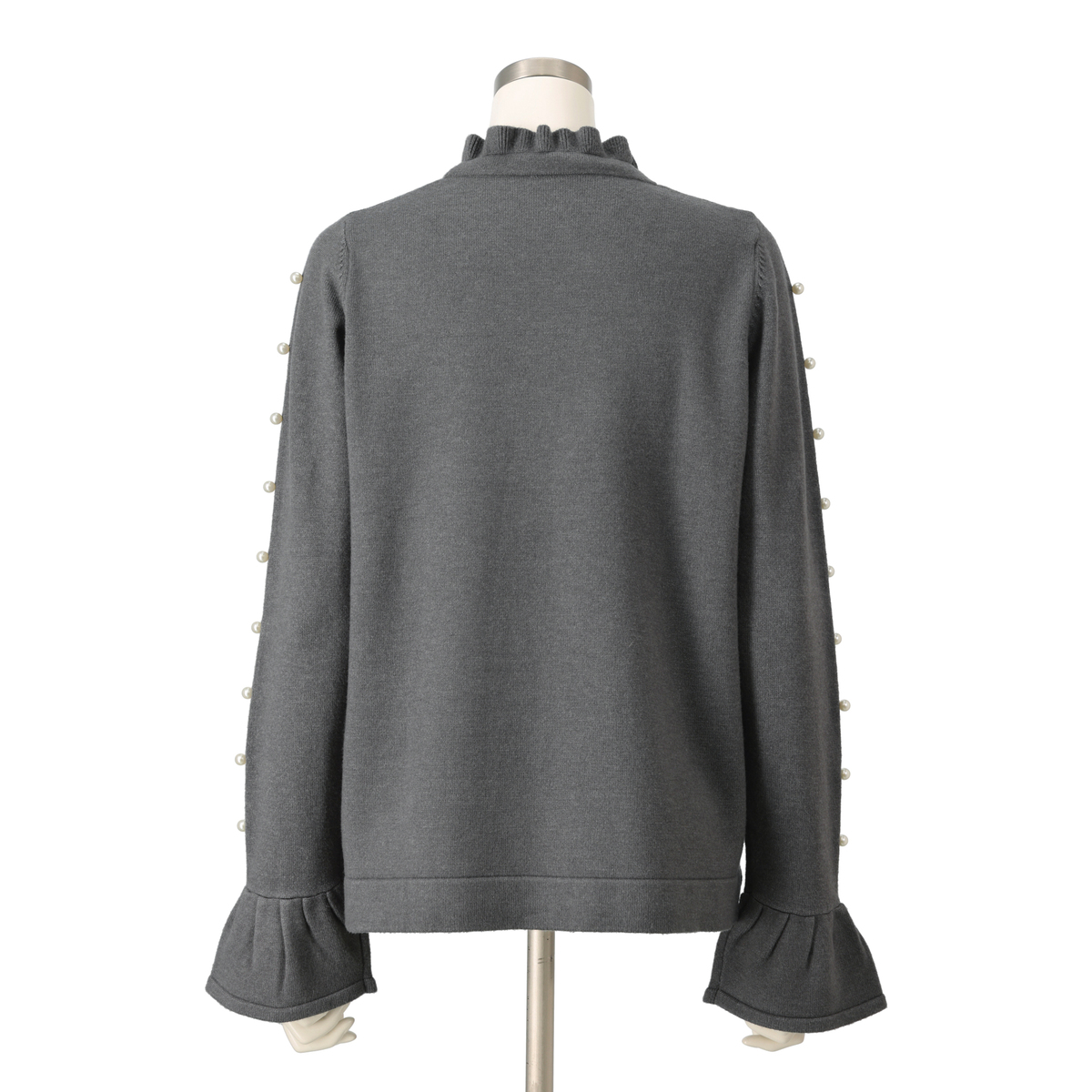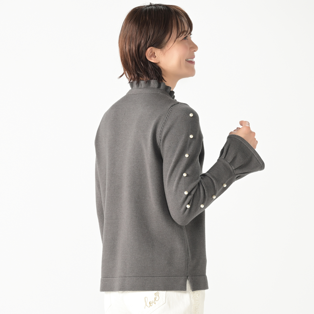 襟元のリボンと重ねたフリルが、お顔まわりを明るく華やかに。袖にはパール調ビジューを贅沢にあしらい、襟リボンの先端にもパール調モチーフをプラス。袖口には大ぶりのフレアデザインを採用し、手首が細く見える効果が期待できます