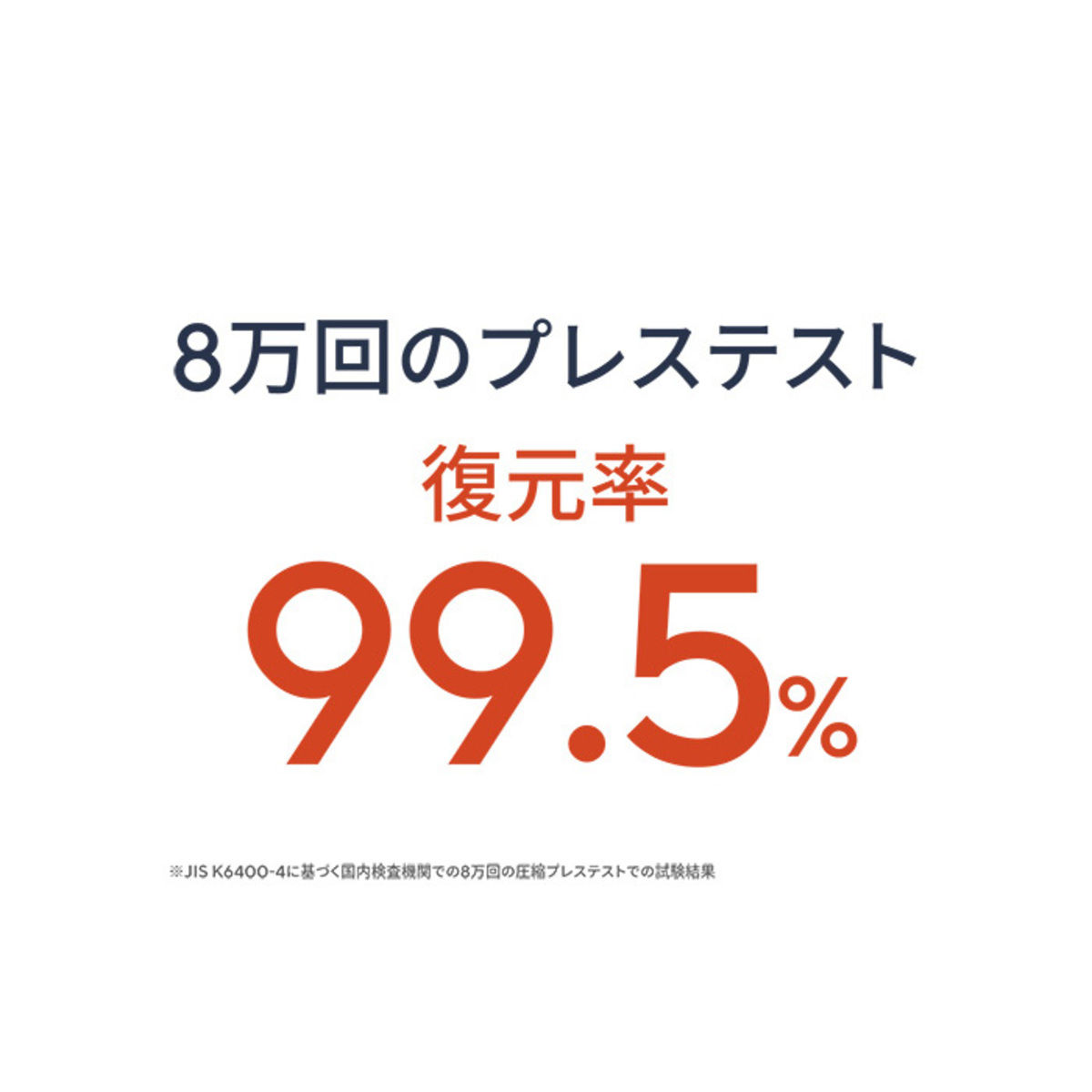 JIS K6400-4に基づく国内検査機関での8万回の圧縮プレステストで復元率99.5%を記録。エコテックス(カバー生地に対する安全規格)や、サーティピュア(詰めもののウレタンに対する安全規格)など、アメリカやヨーロッパなどの安全性においての厳しい国際規格に合格しています