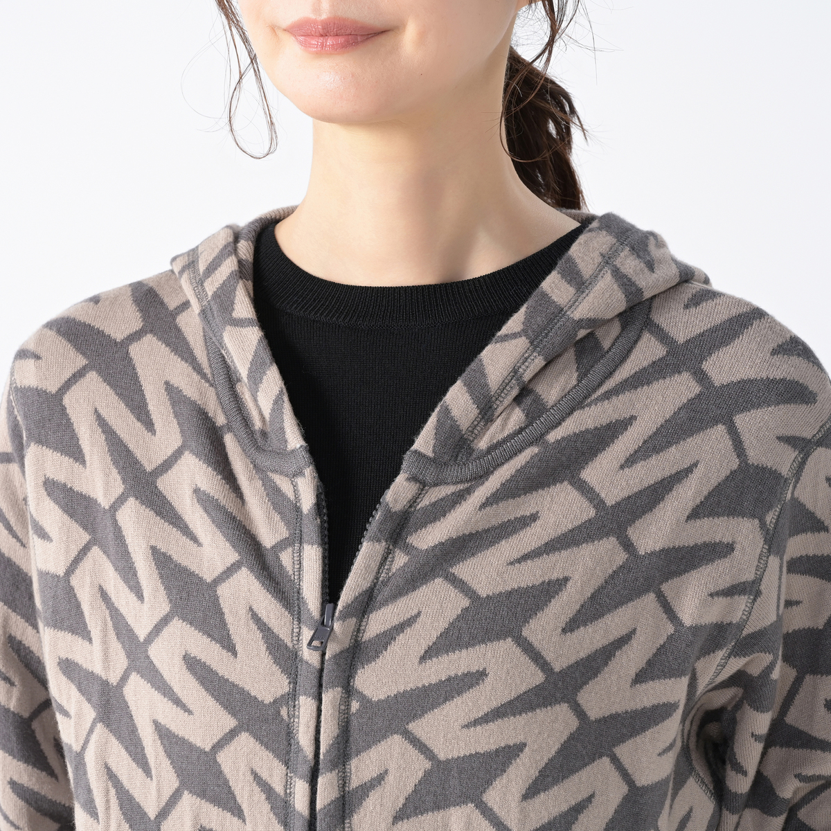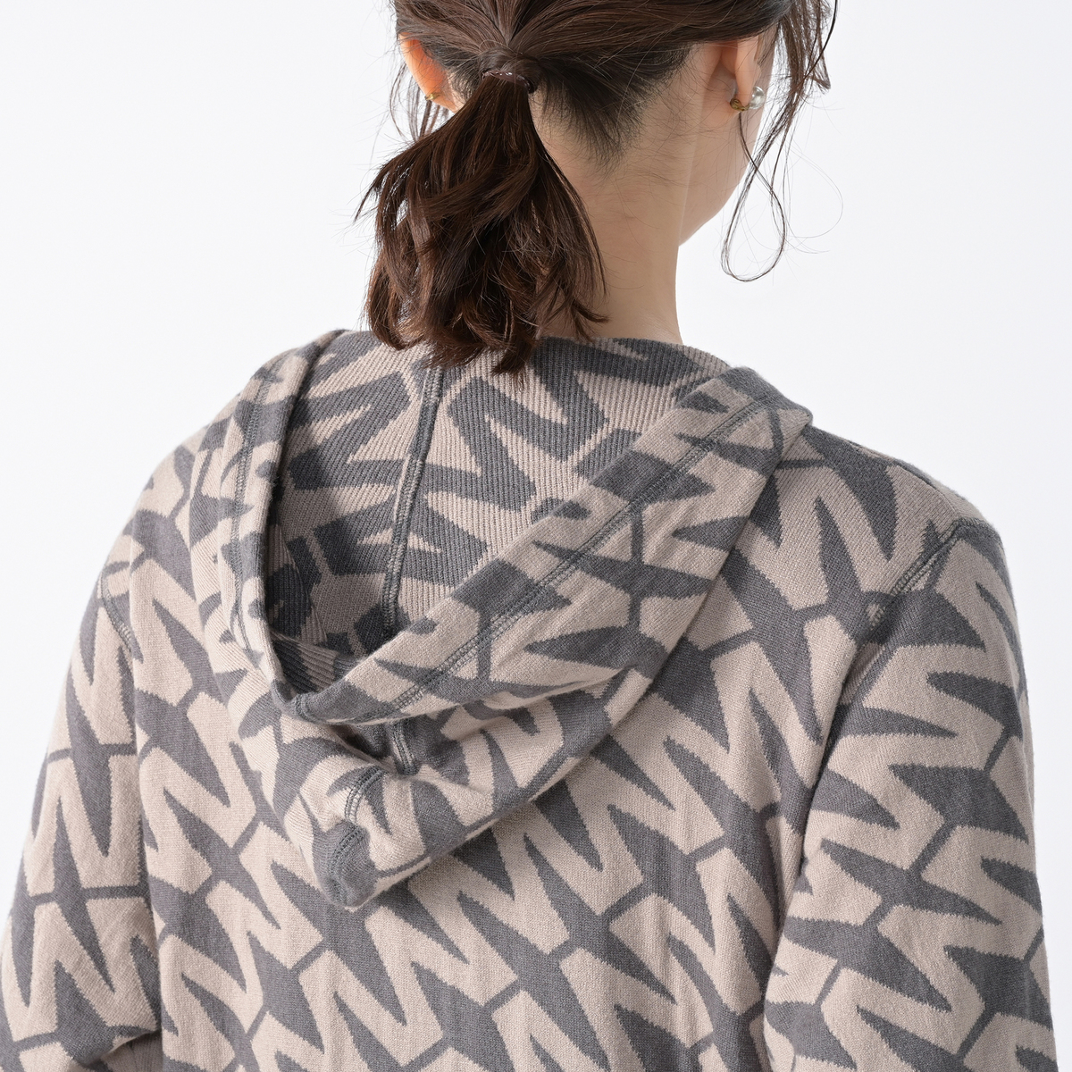 ニットのフクレダブルジャガードコート。12ゲージのコアスパンヤーンで編み上げ、肌触りの良さと弾力性を兼ね備えた着心地を実現しました。身頃にはMASAGOオリジナルの柄をあしらい、シンプルな中に個性をプラス。しっかりとした存在感で、季節の組合せに洗練を添える一着です