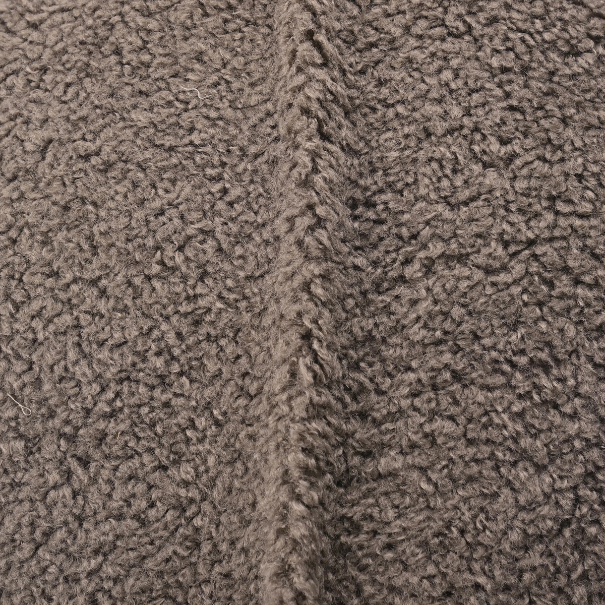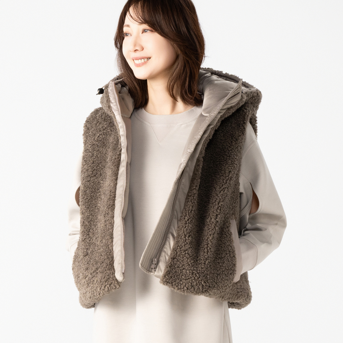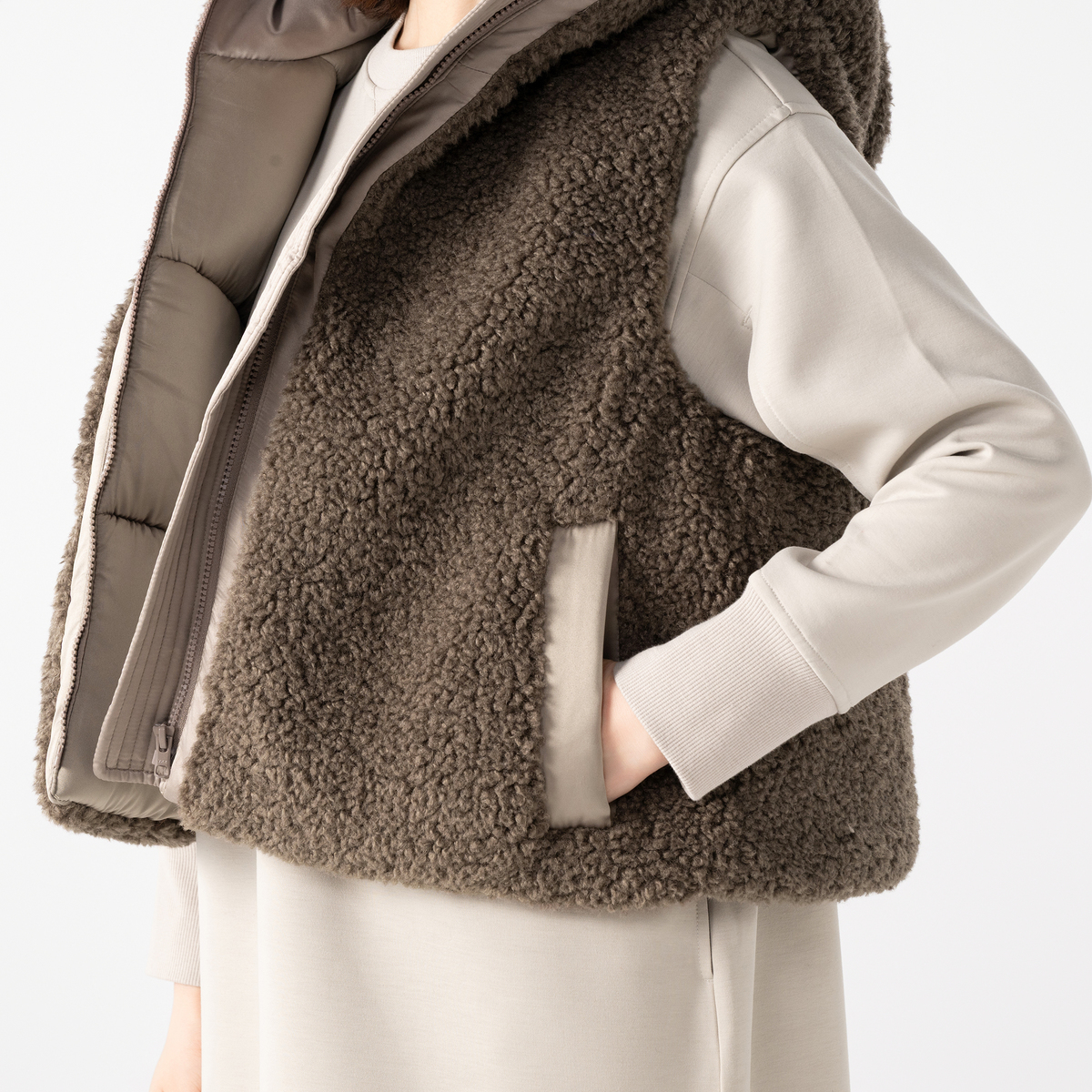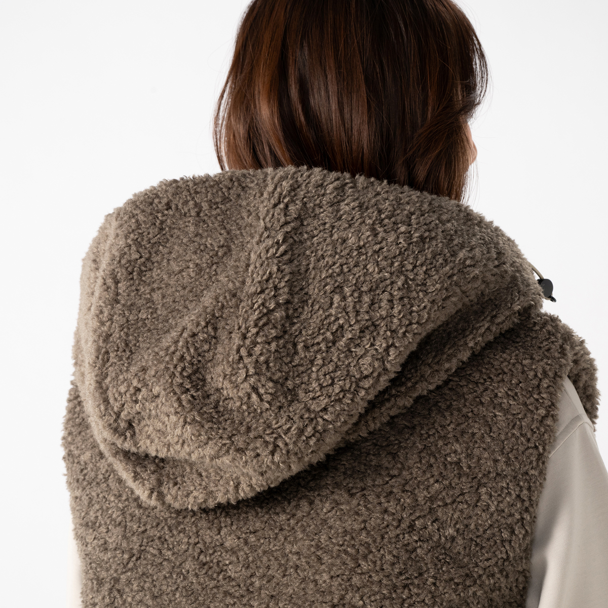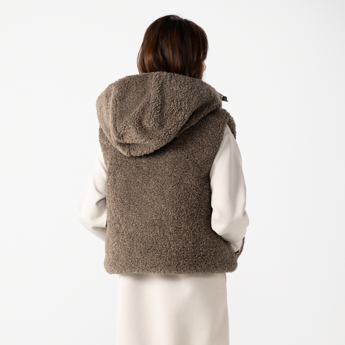 フェイクラムの中綿入りフード付きベスト。ボア素材の柔らかな質感に、裏側はマット調の光沢を持つサテン生地を合わせ、高級感を演出します。裾の内側とフード口にはストレッチコードを備え、シルエットを自在に調整可能。軽やかな着心地ながら、季節の組合せに幅を広げる一枚です