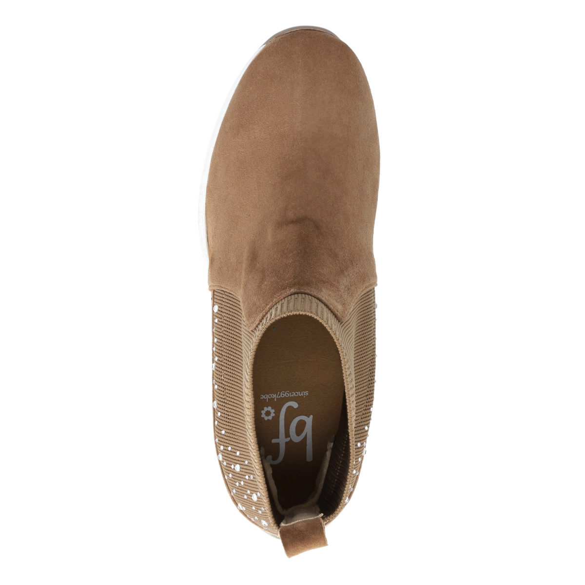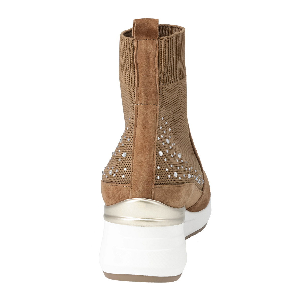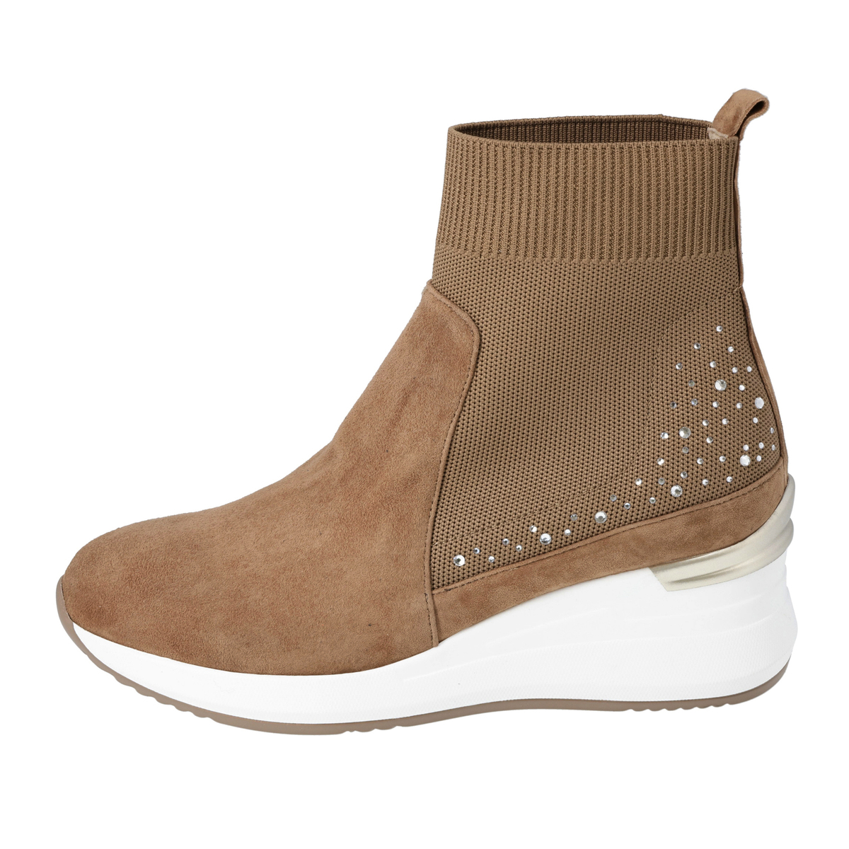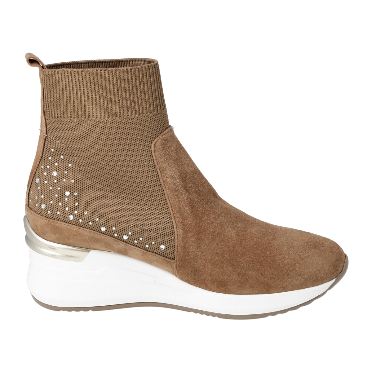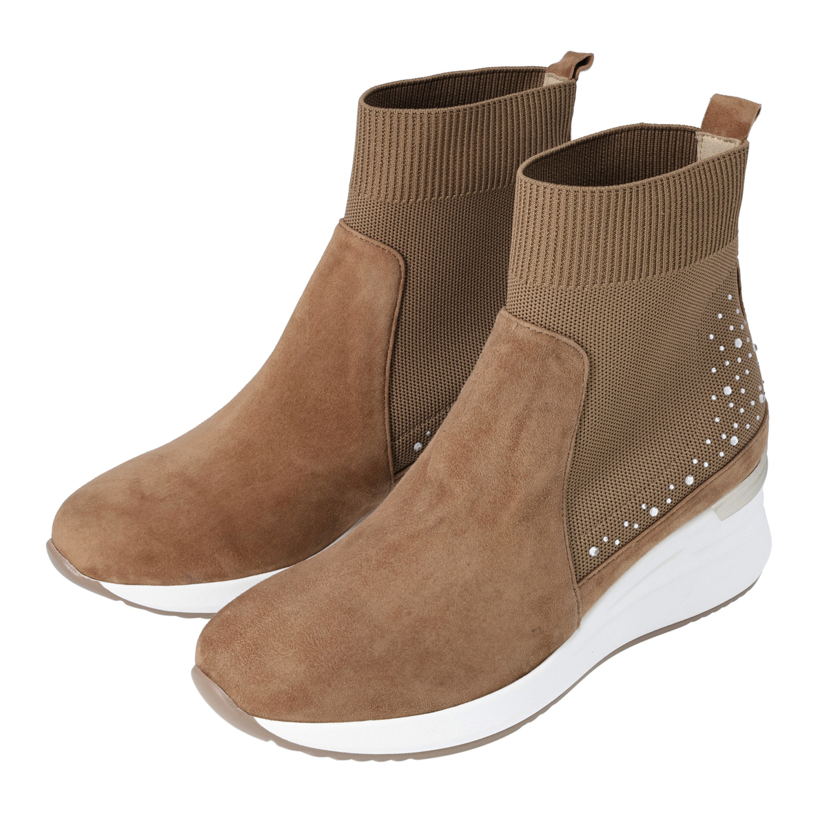レザーとニットを組合せたスニーカーブーツ。アッパーの両サイドにラインストーンをあしらい、ビューフォートらしくエレガントに仕上げました