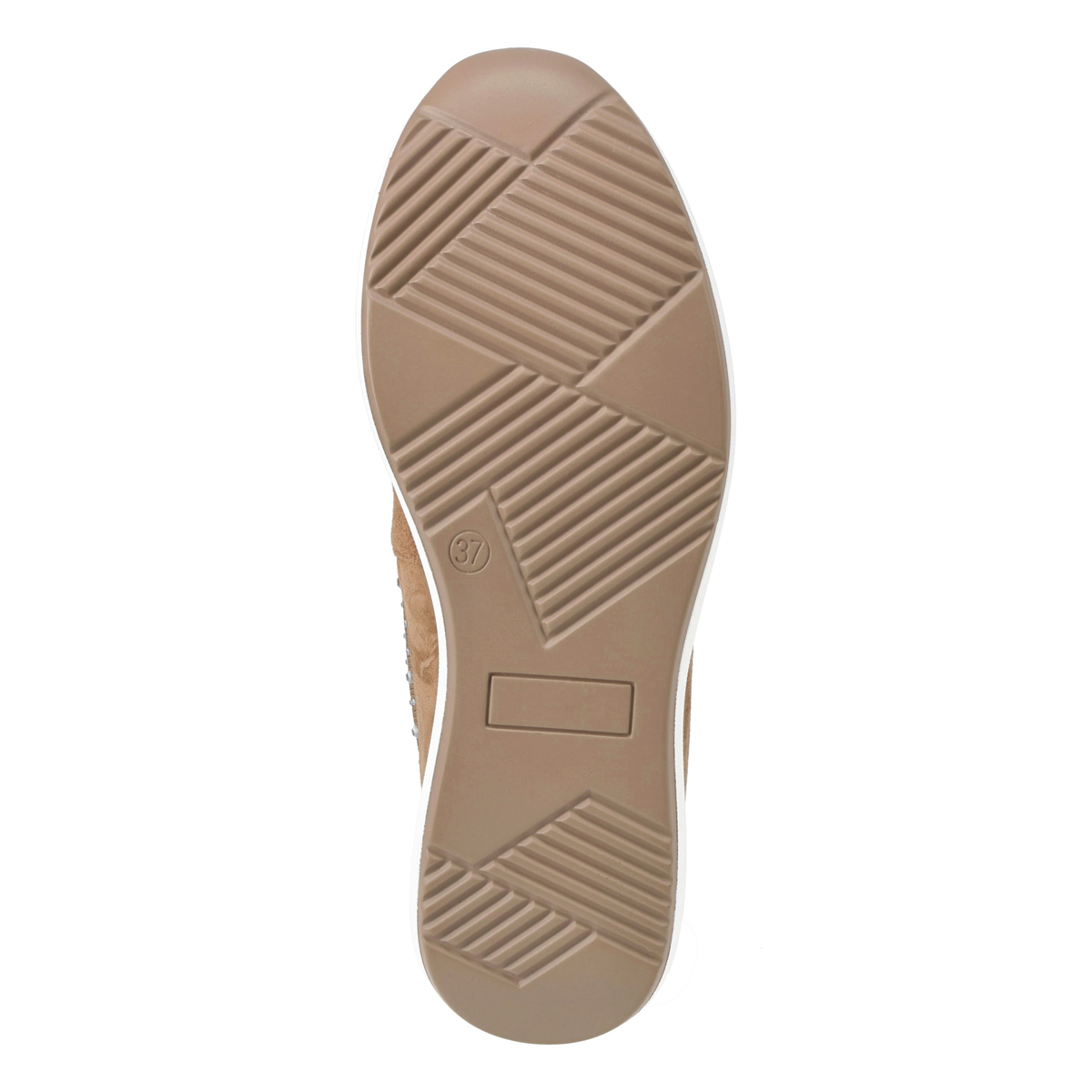 前厚約2cm、ヒール高約6cm、傾斜約4cmのウェッジソール(サイズ23.5cmの計測)。側面の柄やフレア感(末広がり感)のあるフォルムで、スニーカーらしくスポーティな印象に仕上げました