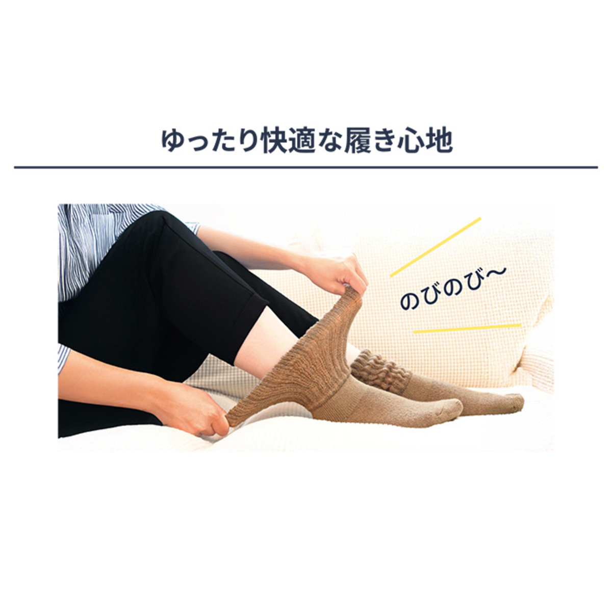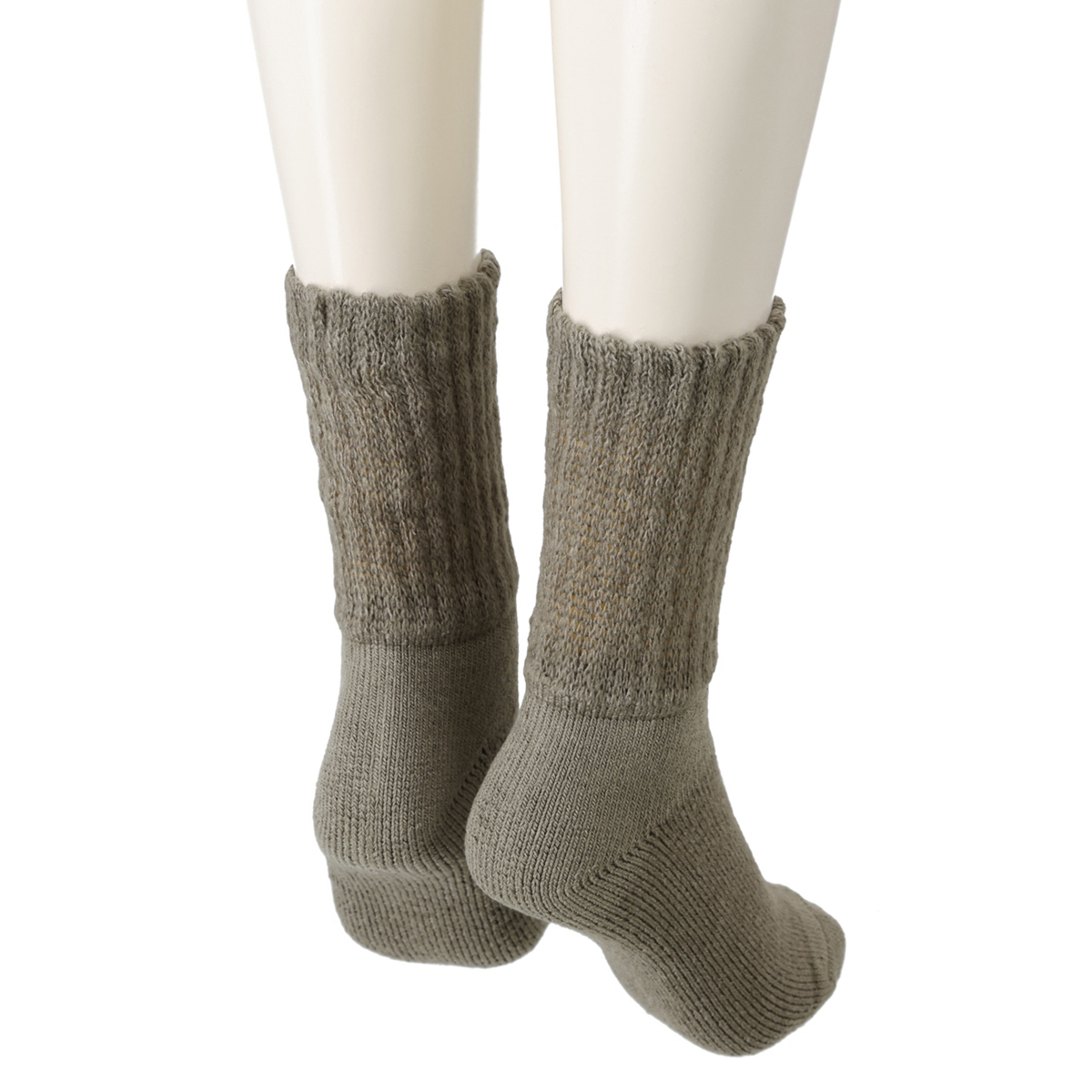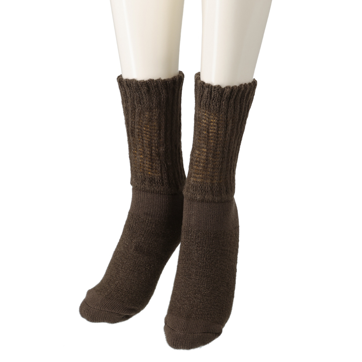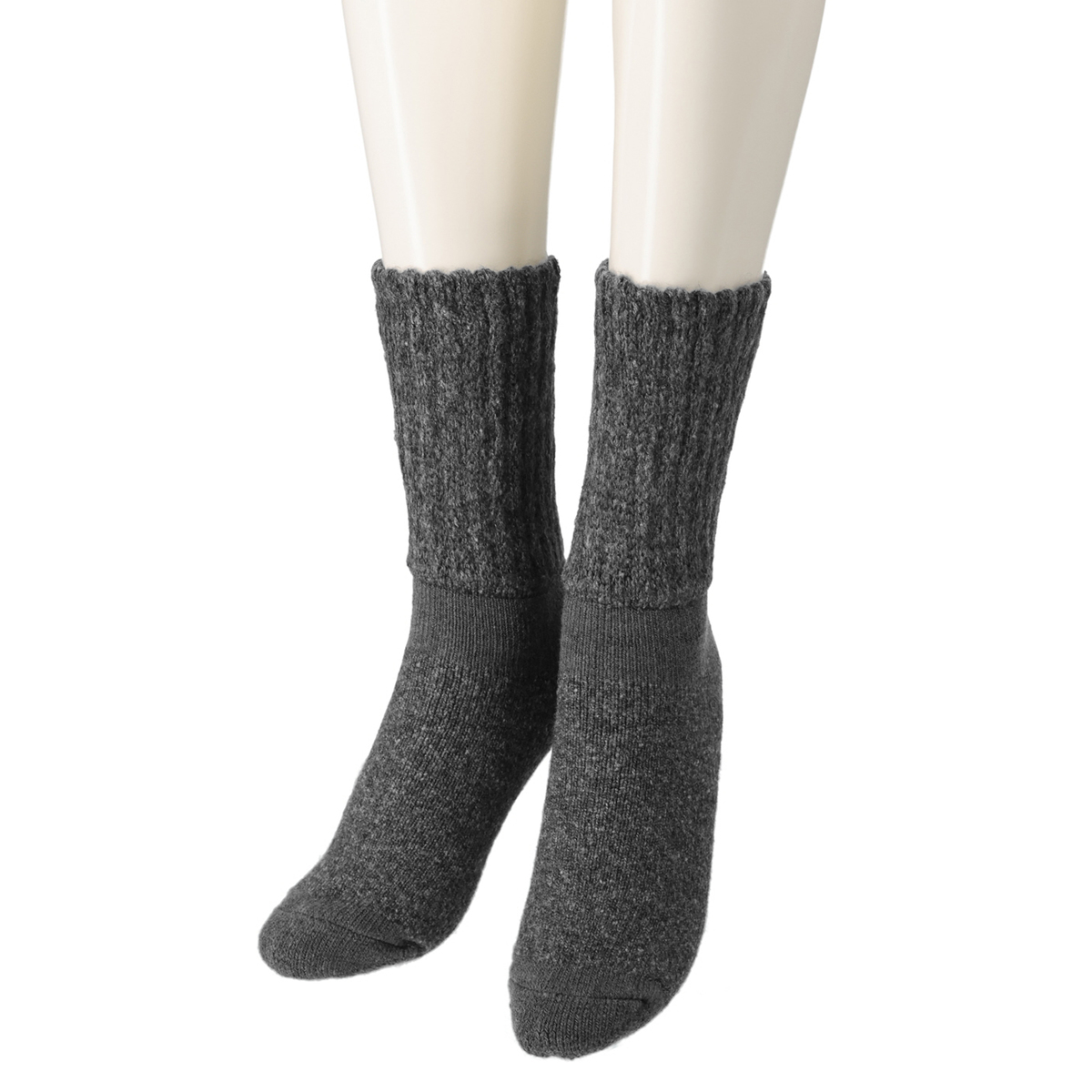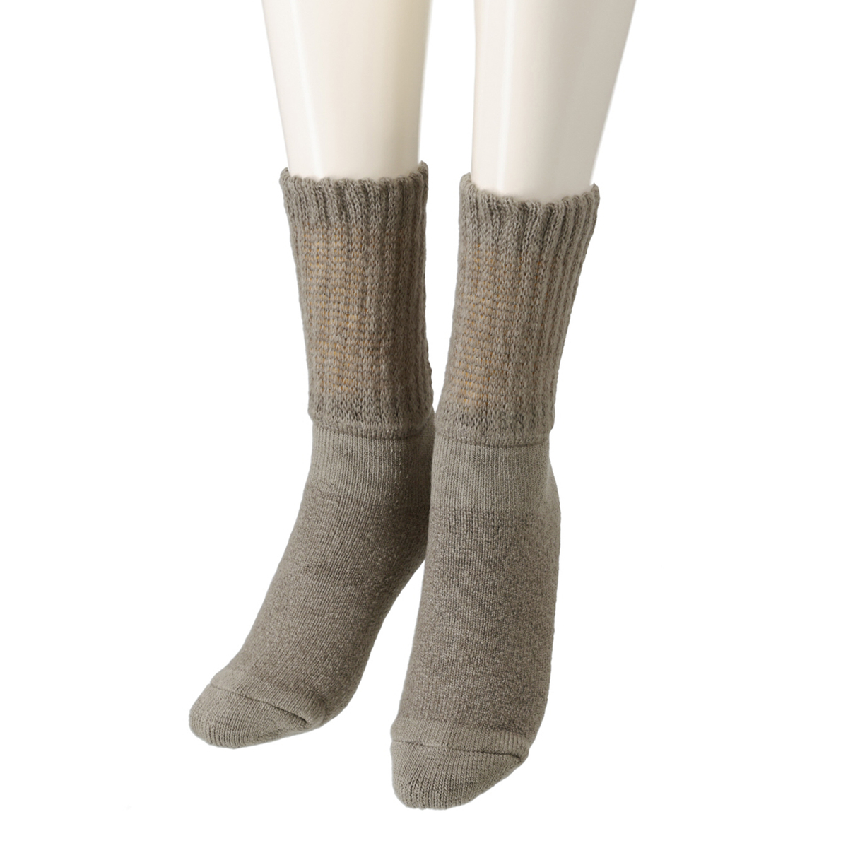 足首からふくらはぎにかけて吸湿発熱素材“ホットハウスW”を採用したソックス。ふんわりとした風合いが特徴のアクリルナイロンレーヨンを全体的に使用しました