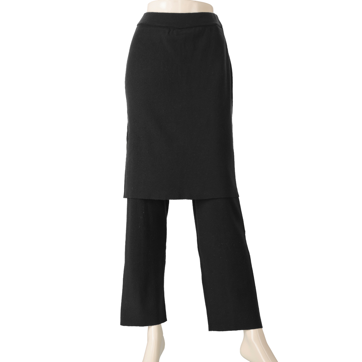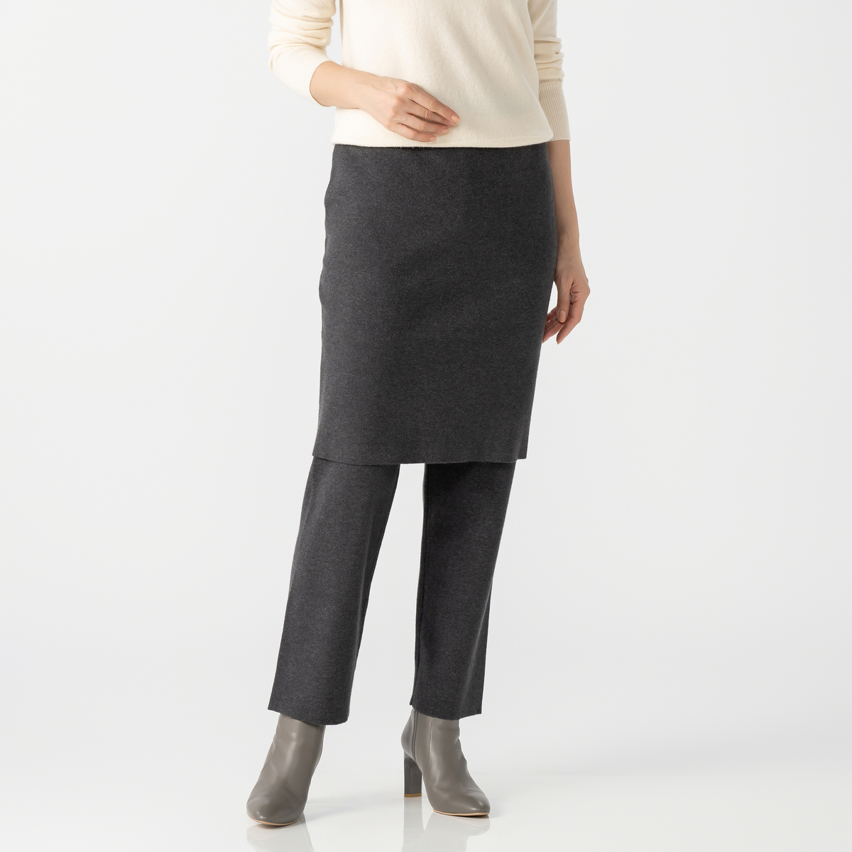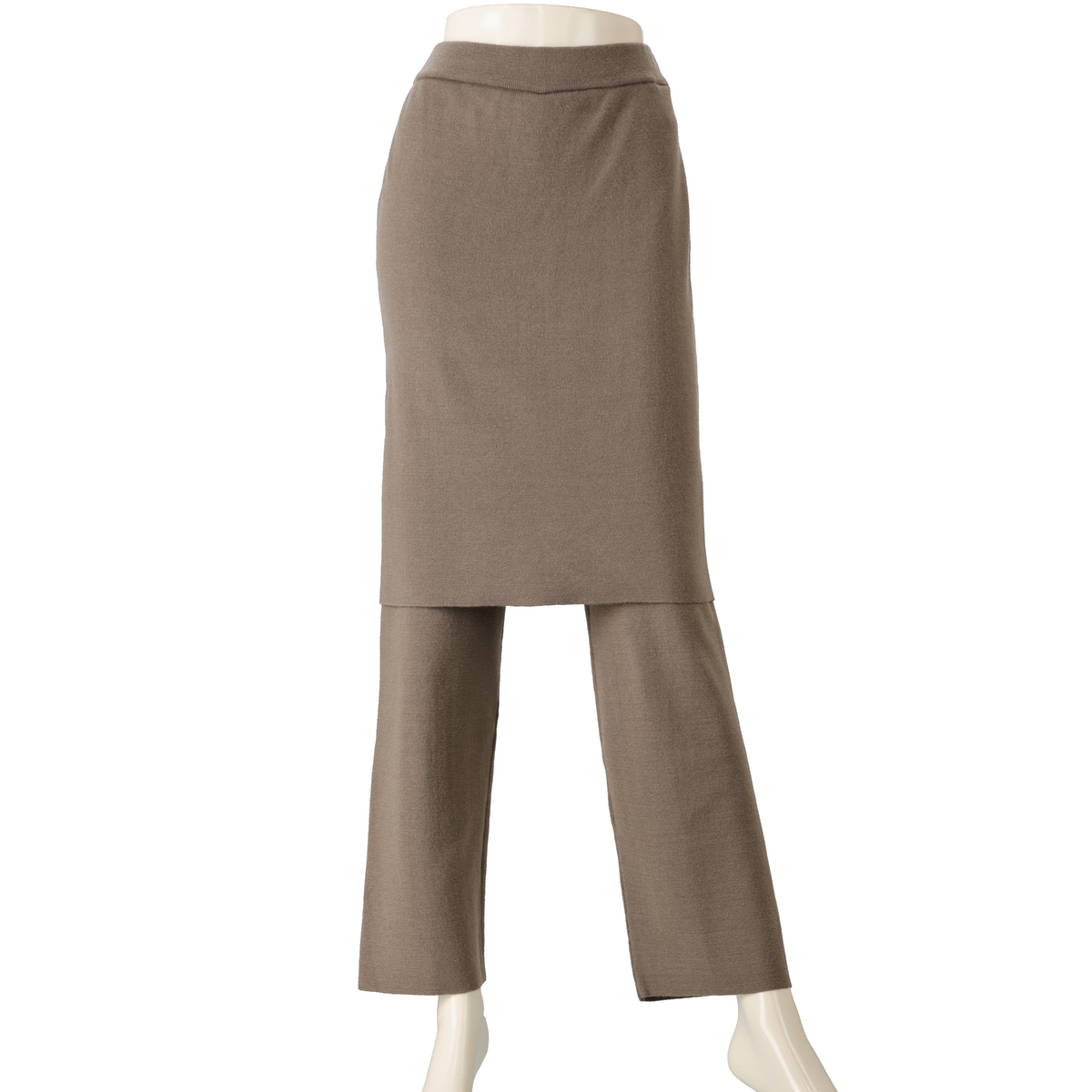 レギンスをドッキングしたニットスカート。1枚でレイヤード風の着こなしが楽しめる便利なアイテムです