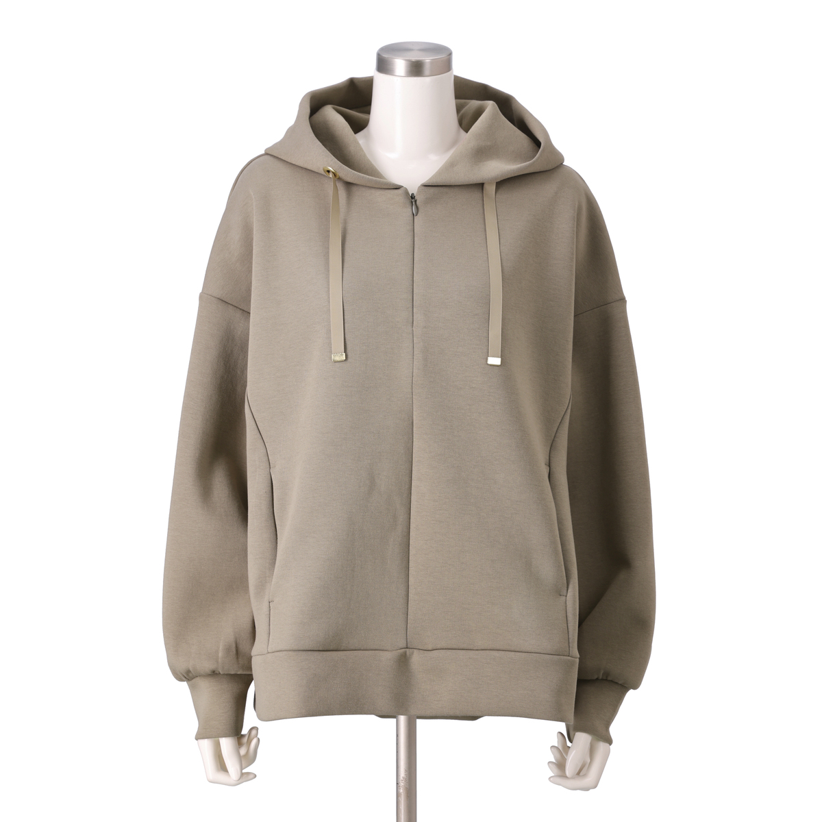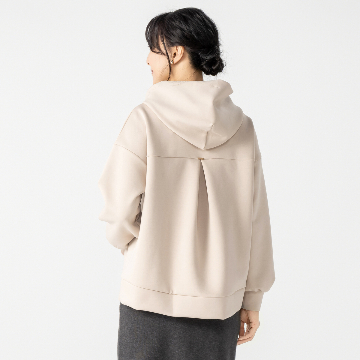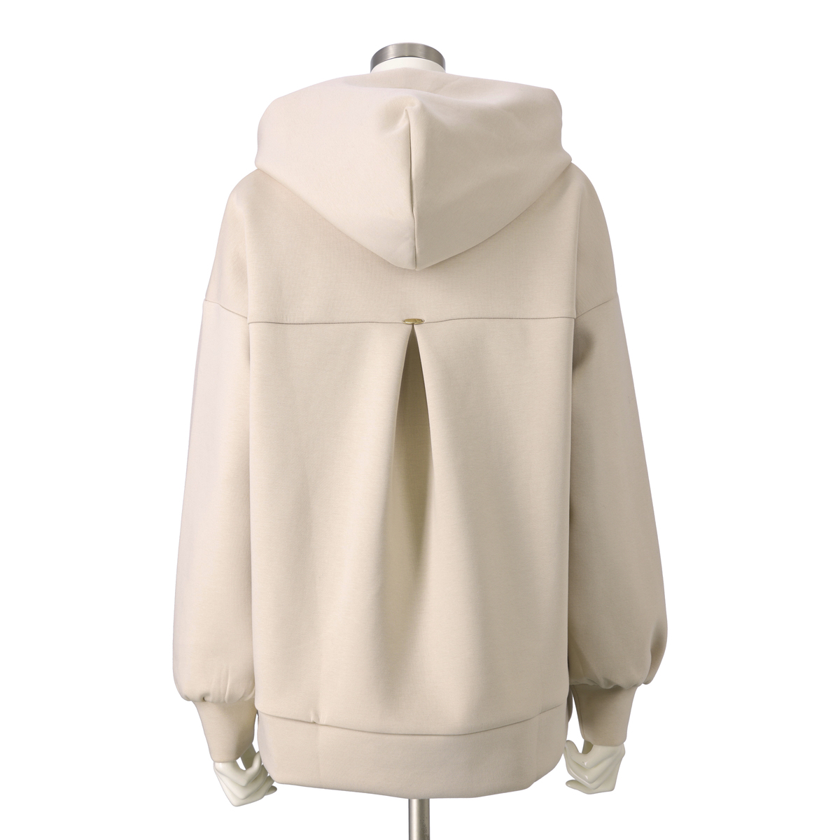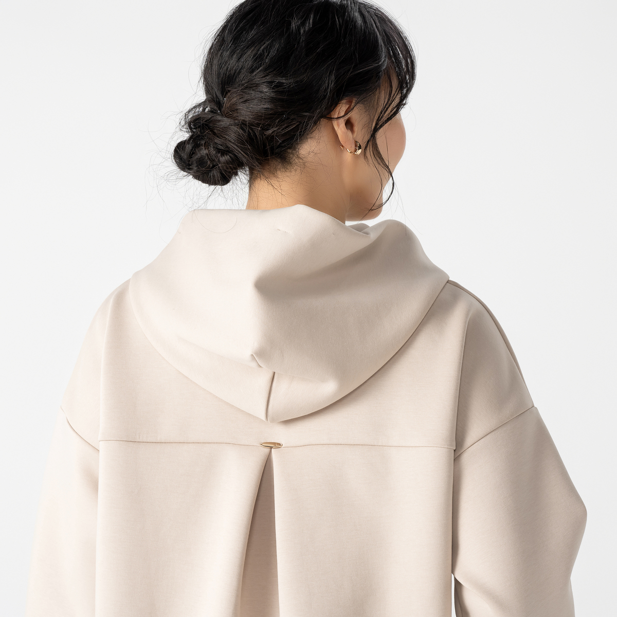 ダンボール素材を使用したフーディー。フロントのファスナーが抜け感を演出します