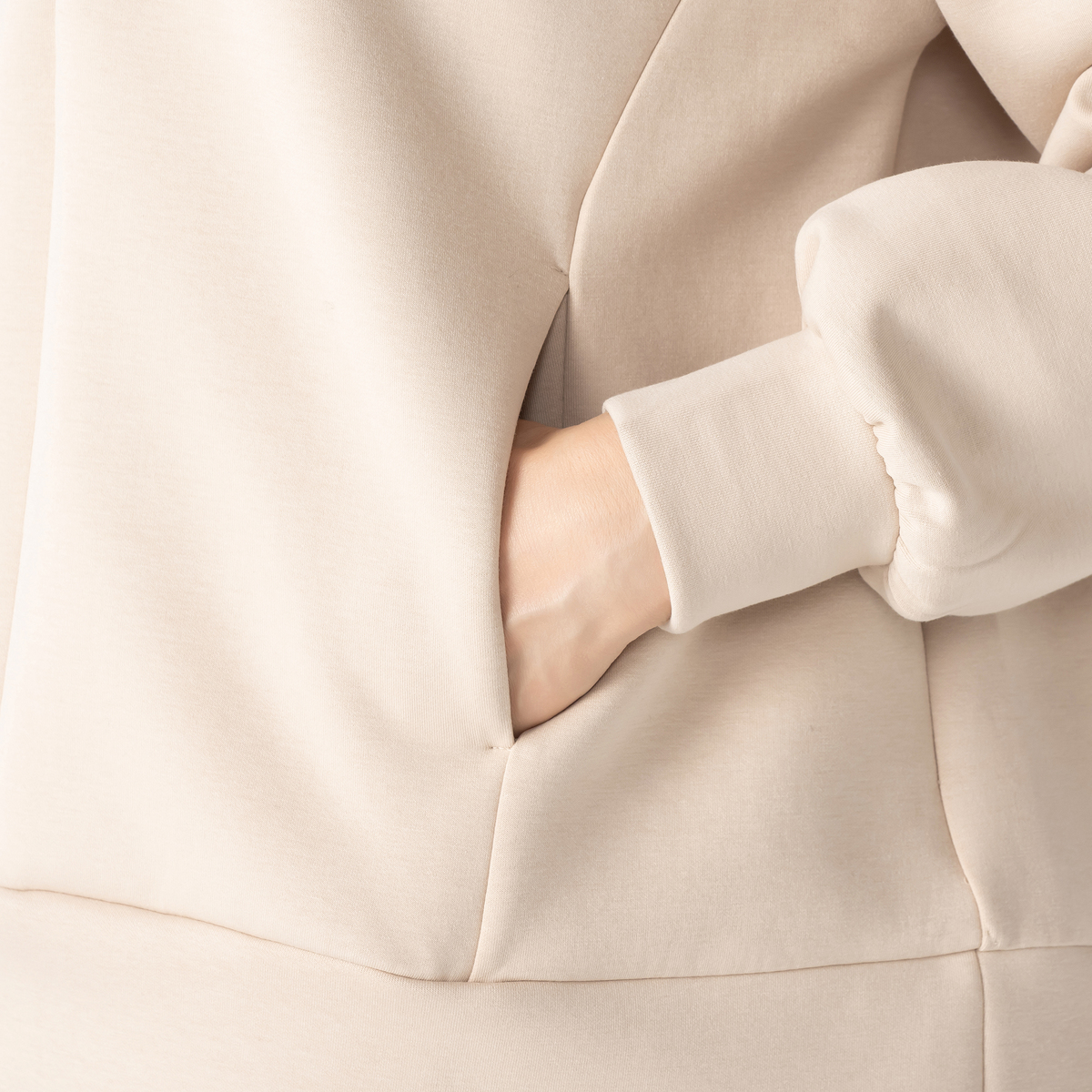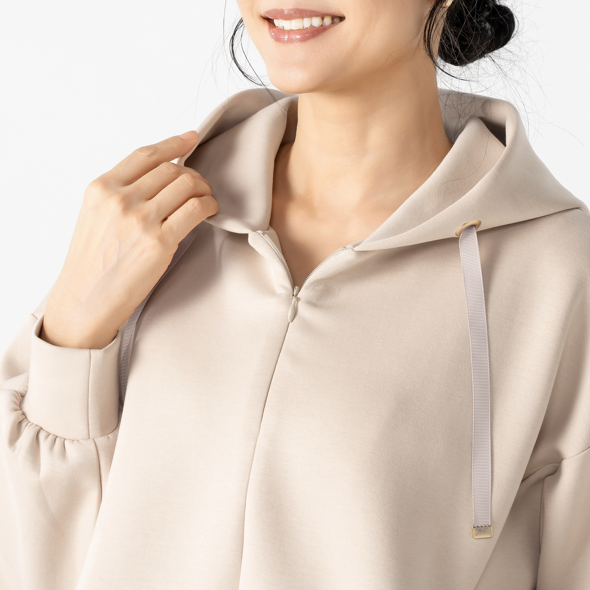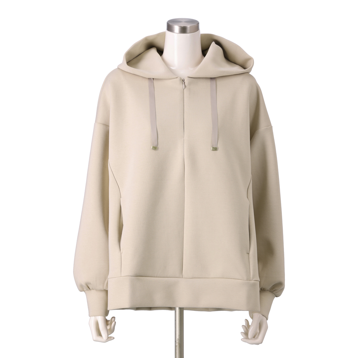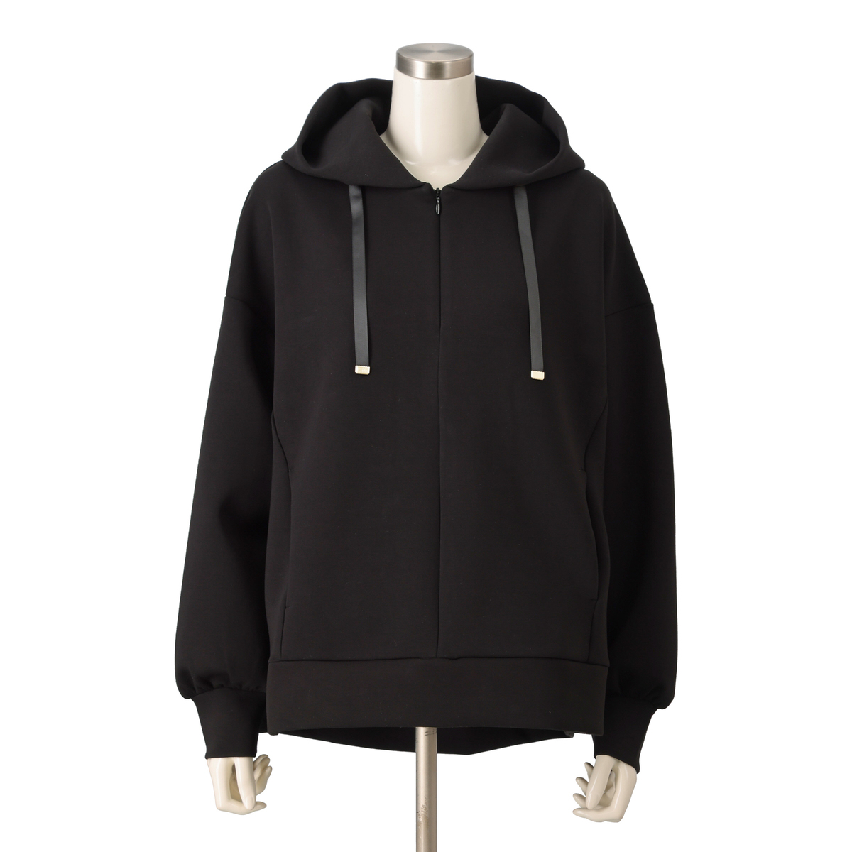 ダンボール素材を使用したフーディー。フロントのファスナーが抜け感を演出します