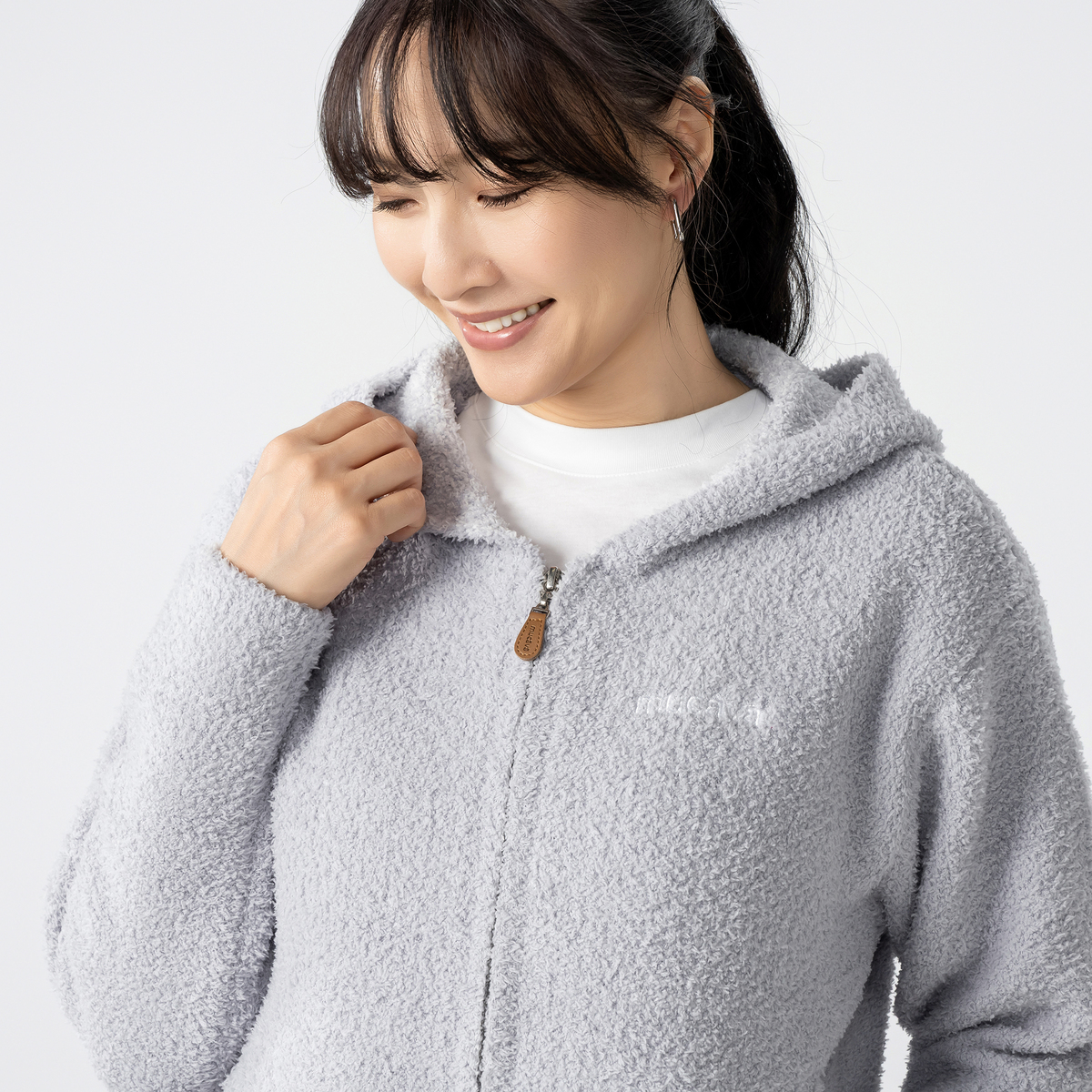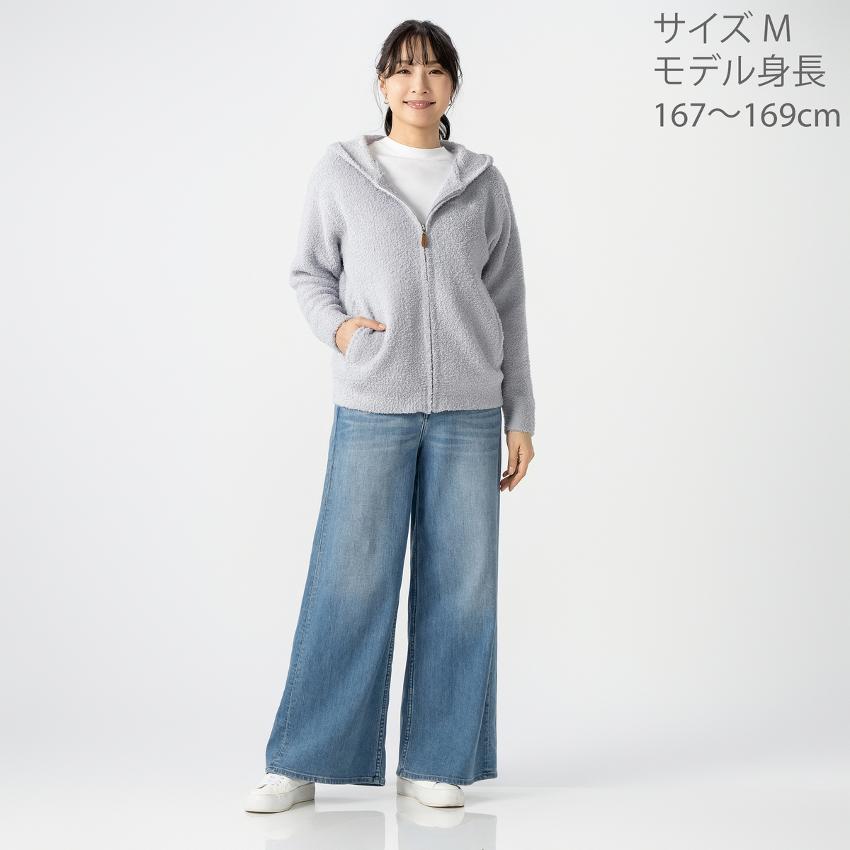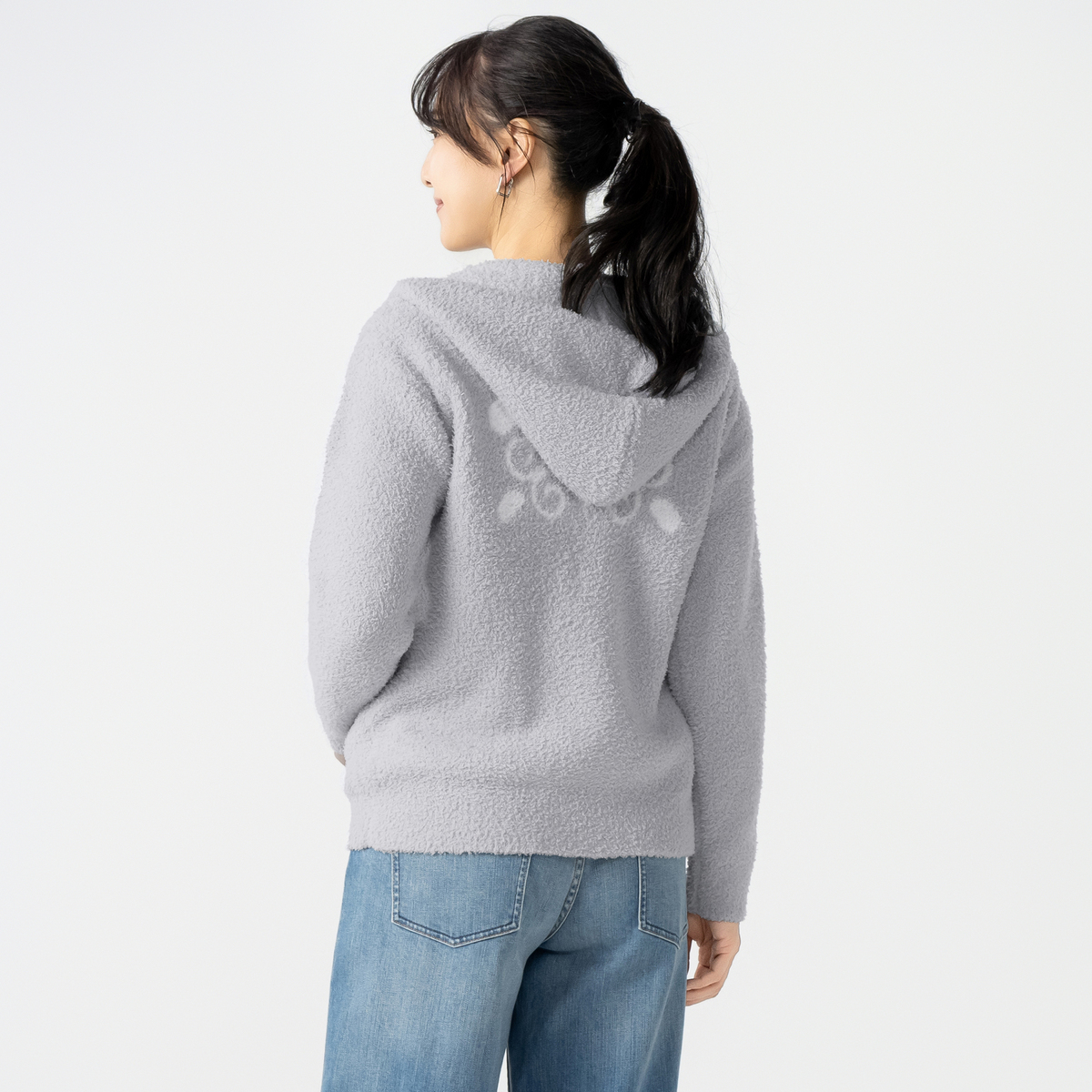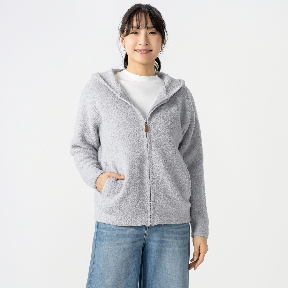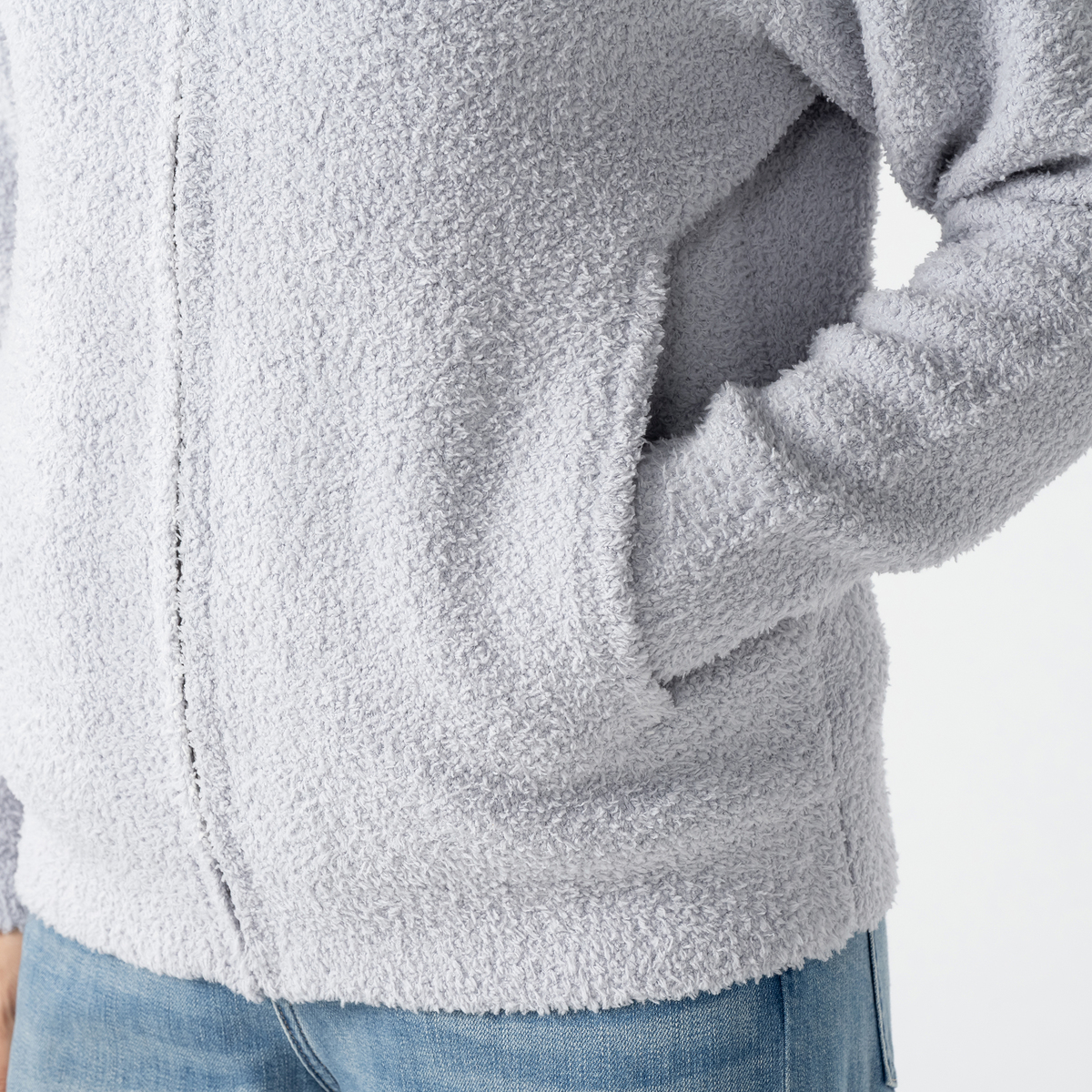 前開き仕様でさっと羽織れる便利なジップアップデザイン。男女問わずユニセックス感覚で着こなせます。ベーシックなデザインなので流行に左右されず長く愛用でき、モール糸ならではの柔らかい着心地も魅力です
