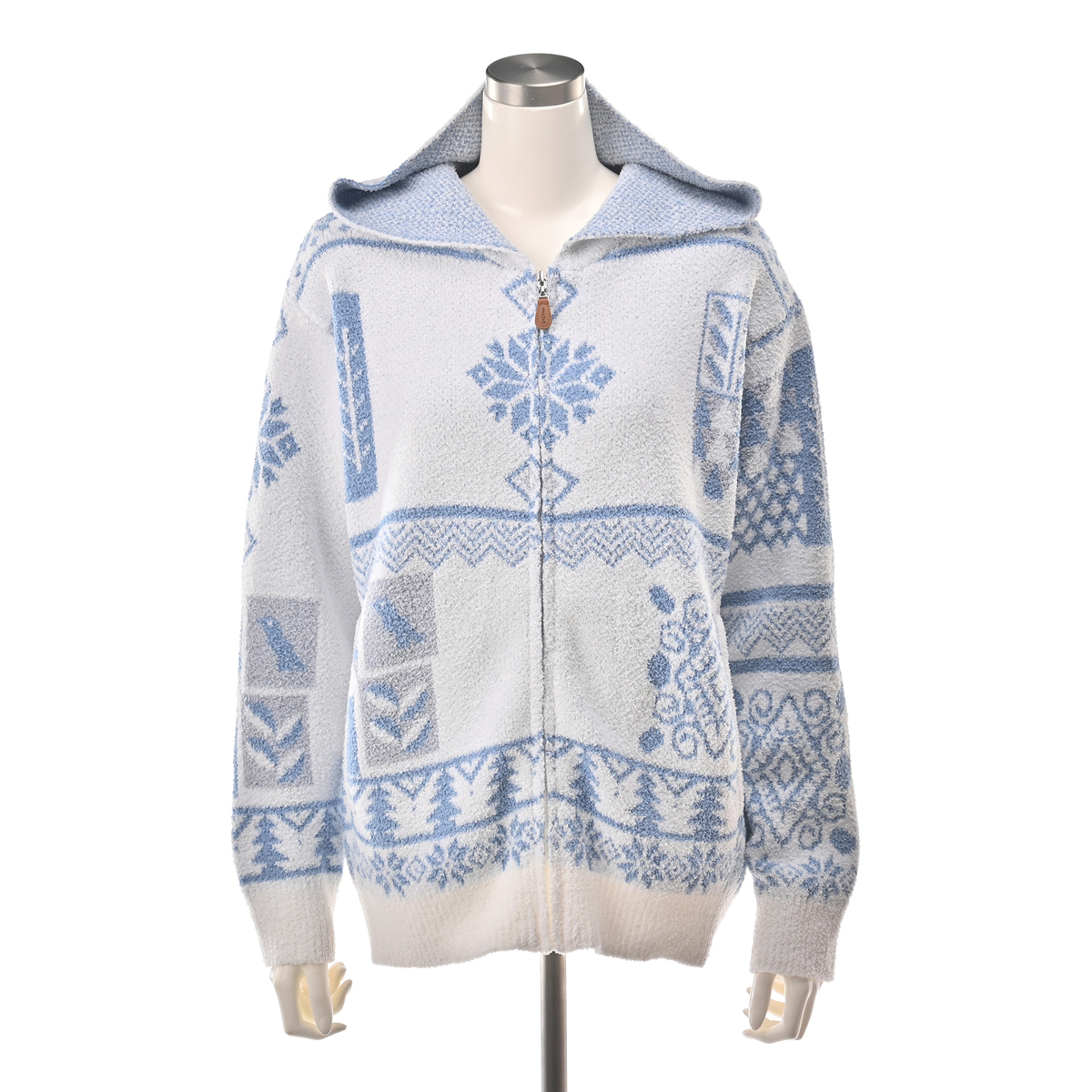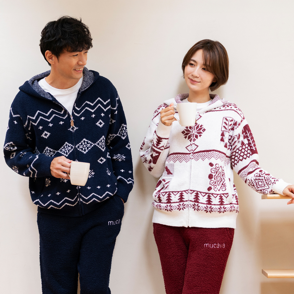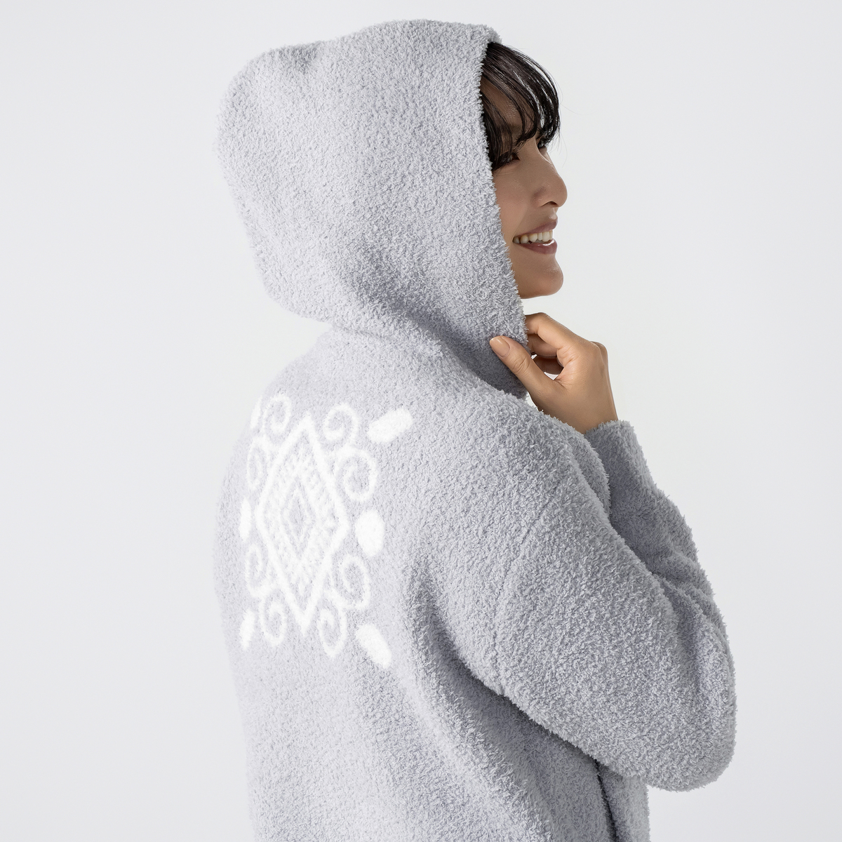 フィンランドの雪の結晶や森をモチーフにした、伝統的なノルディック柄を全面にデザイン。北欧らしい温かみと華やかさを纏い、お部屋着でありながら大人の洗練を感じられるアイテムです