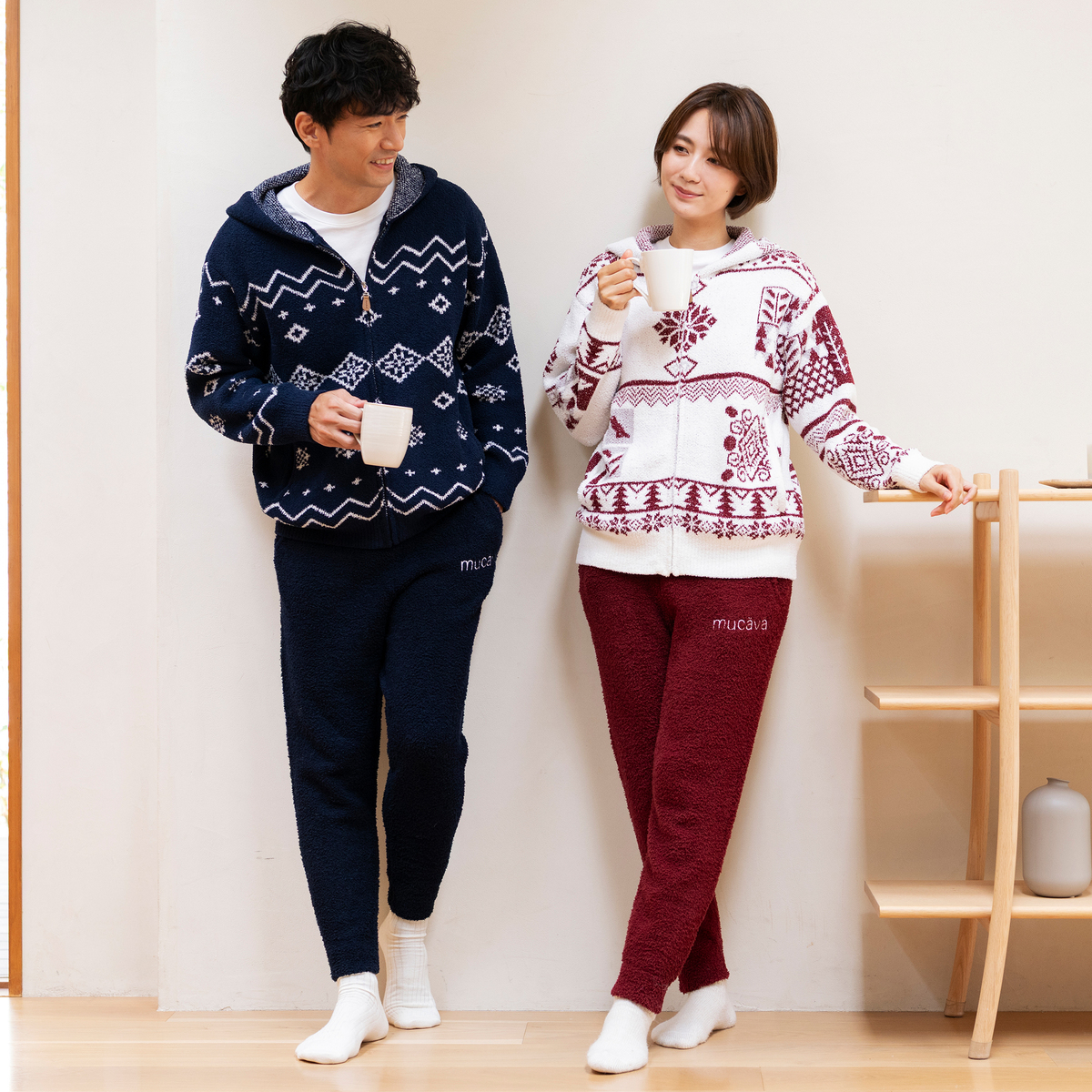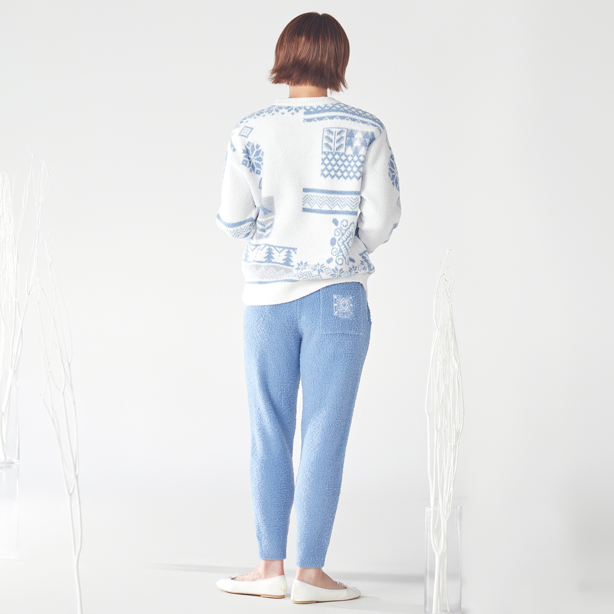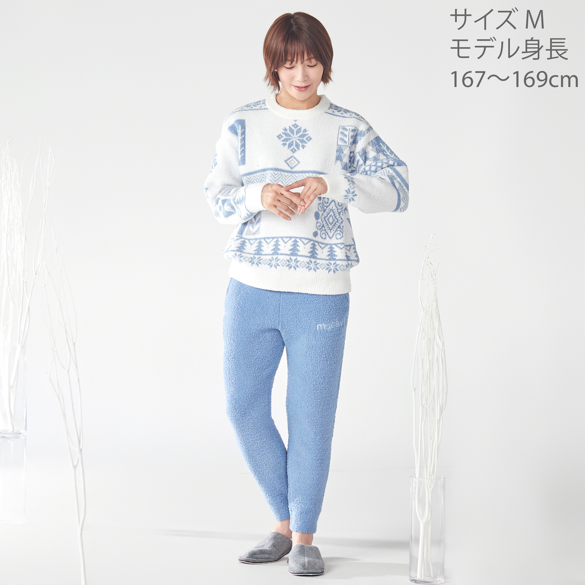 ふんわりモール糸を使った優しい肌触り。ウエストは同糸で編んだ紐で調整でき、両サイドと後ろにポケットを備えています。お部屋でのリラックス時間から外出まで快適に過ごせます
