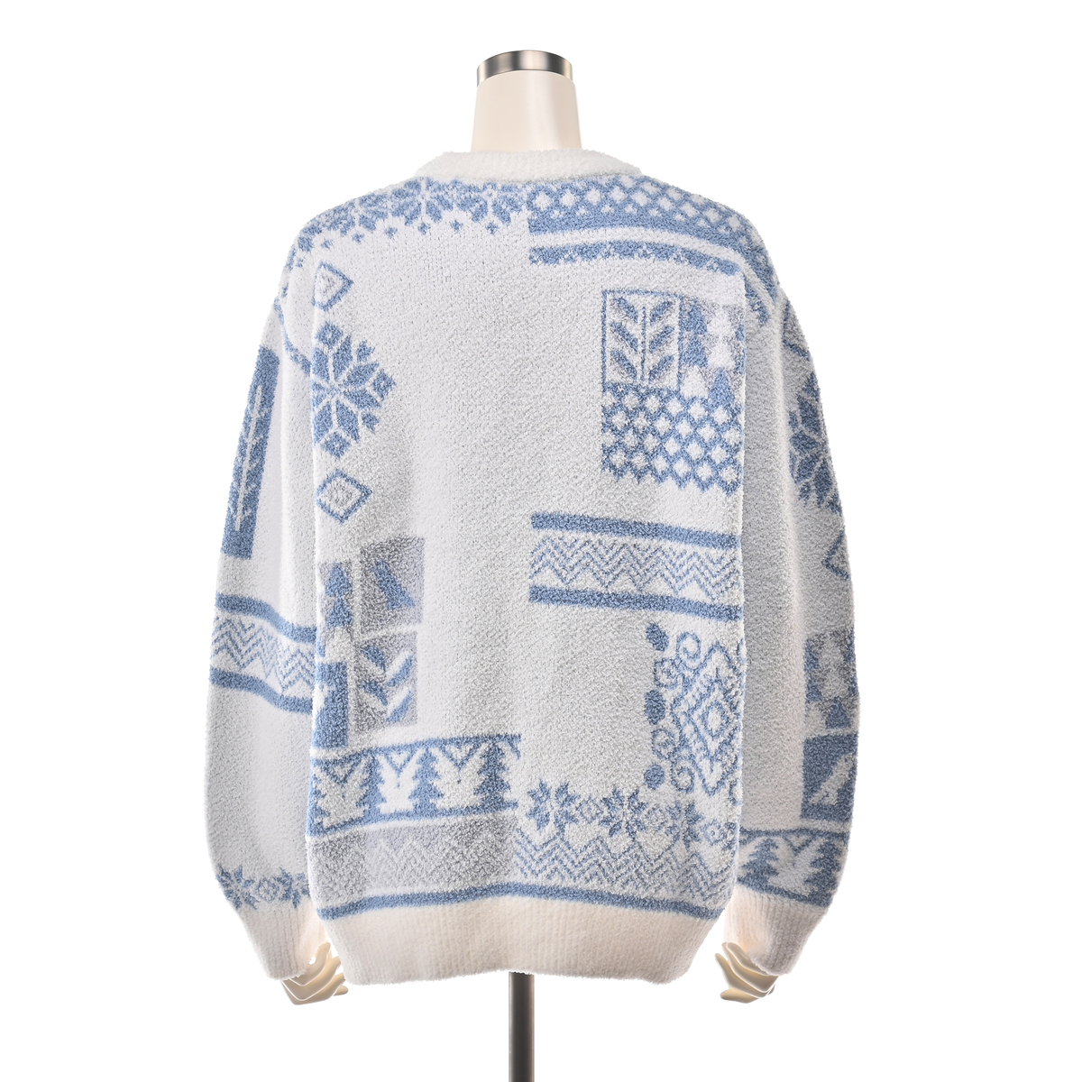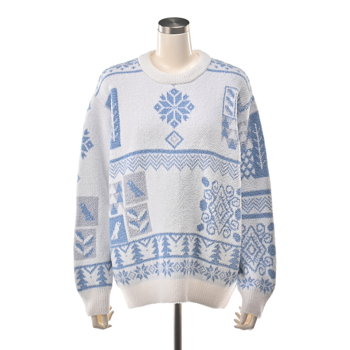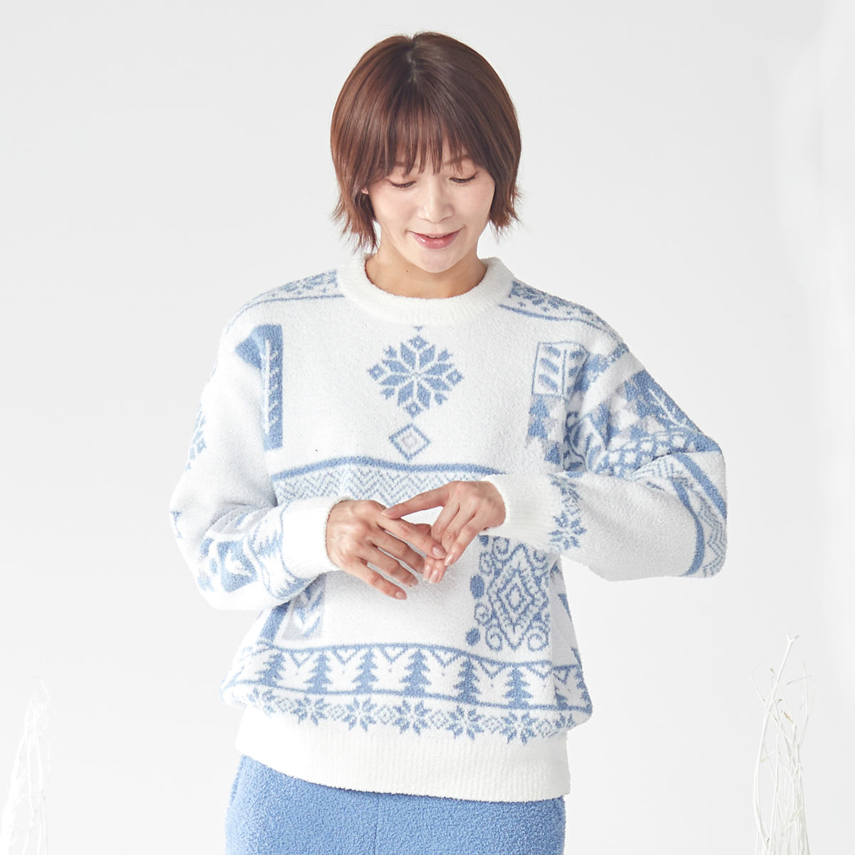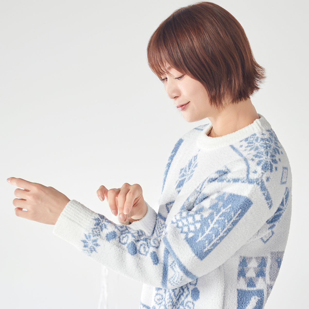 フィンランドの雪の結晶や森をモチーフにした伝統的なノルディック柄を全面にデザインしたプルオーバー。北欧らしい温かみと華やかさを纏い、部屋着でありながら大人の洗練さを感じられます。日常に彩りを添え、冬の季節感を楽しめます