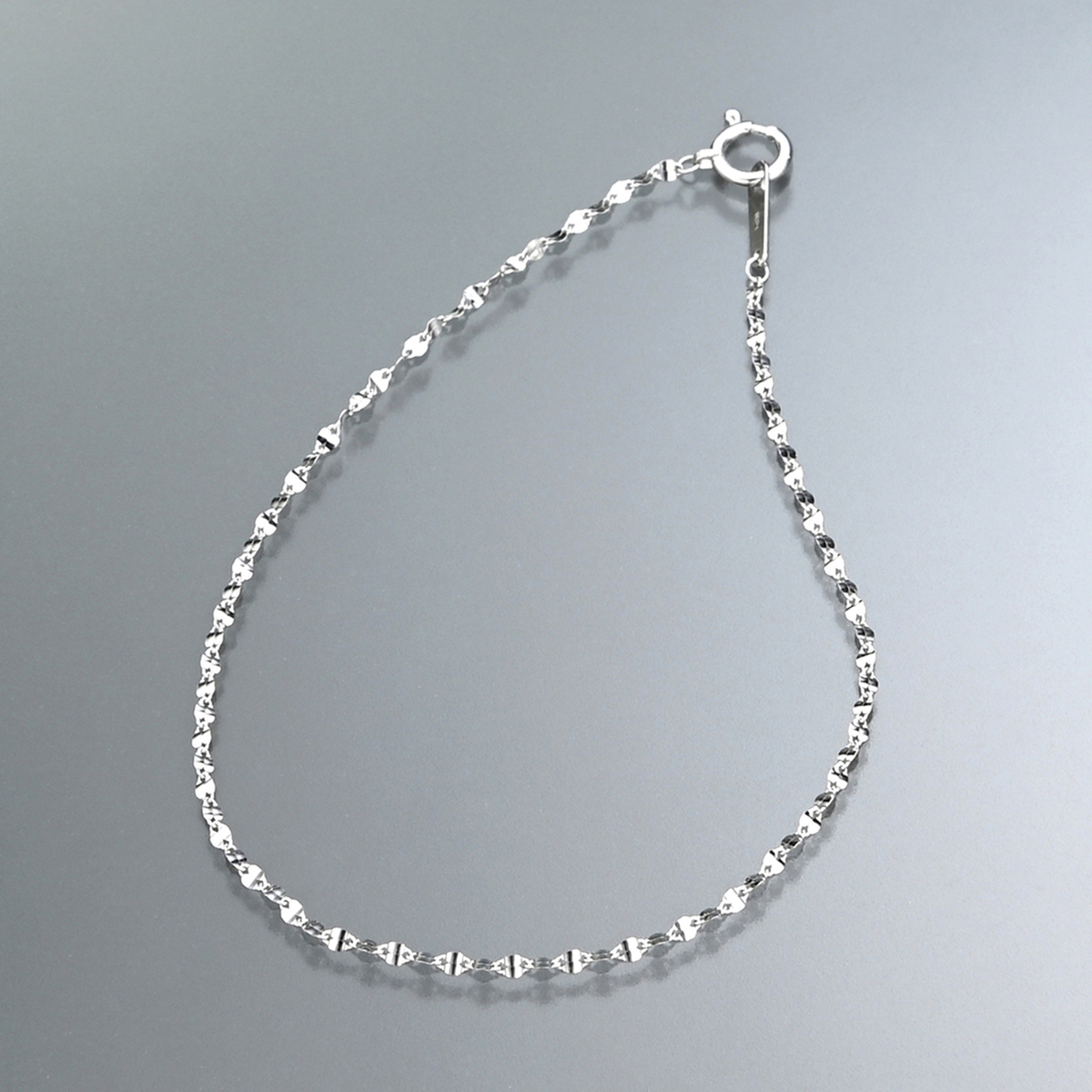 アズキチェーンをベースに湾曲させたプレッシングをかけて場面を広く取り、より華やかな輝きを放つジュエリーに仕上げました。動くたびにキラキラとした美しい輝きをお楽しみいただけます