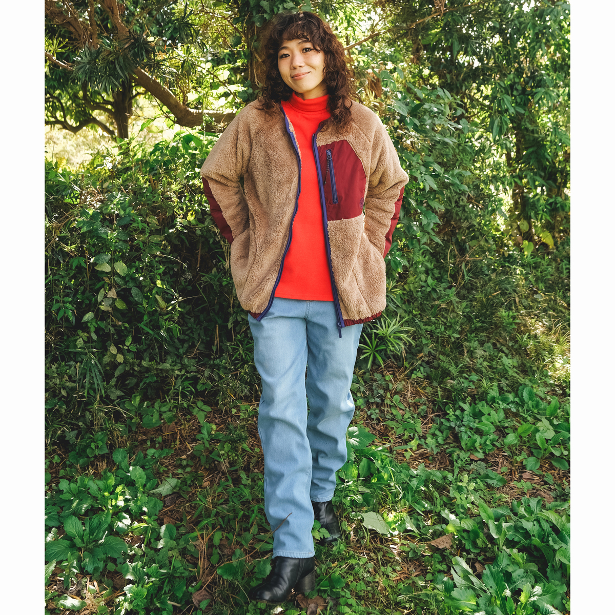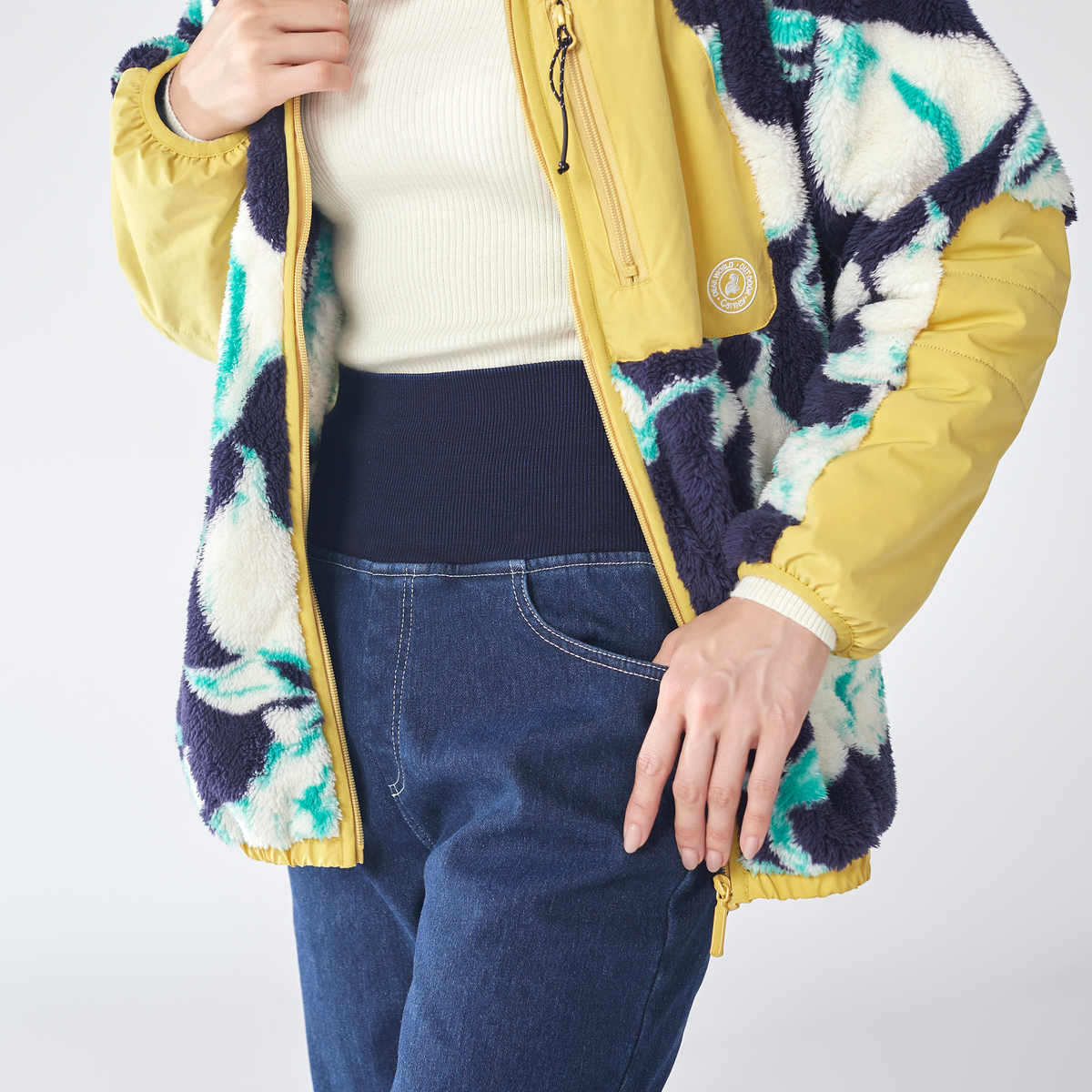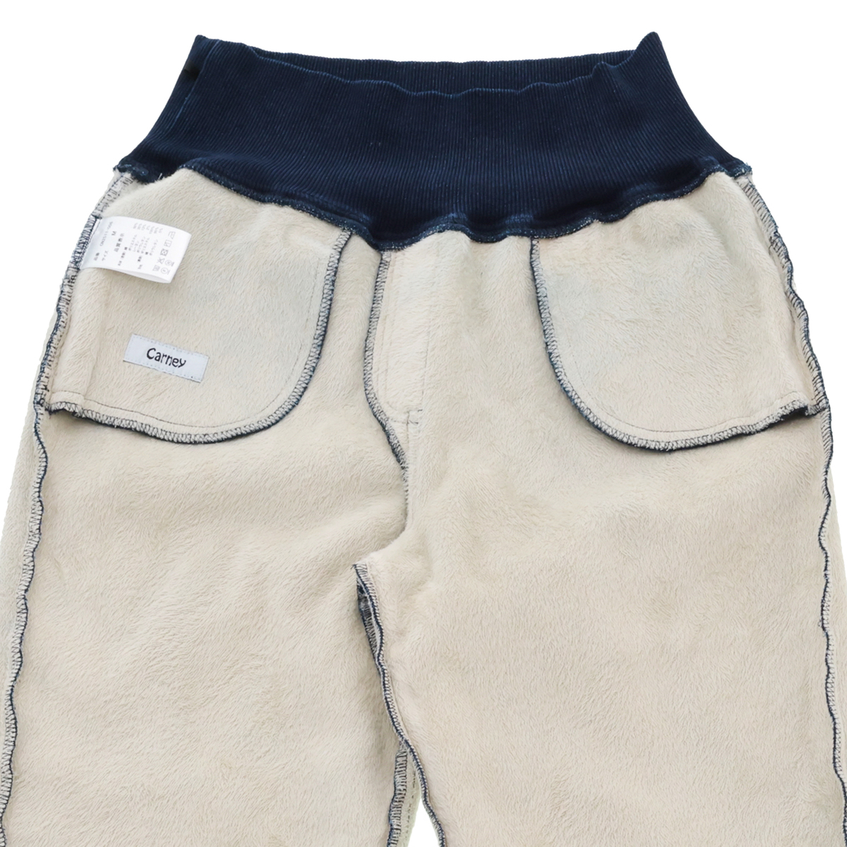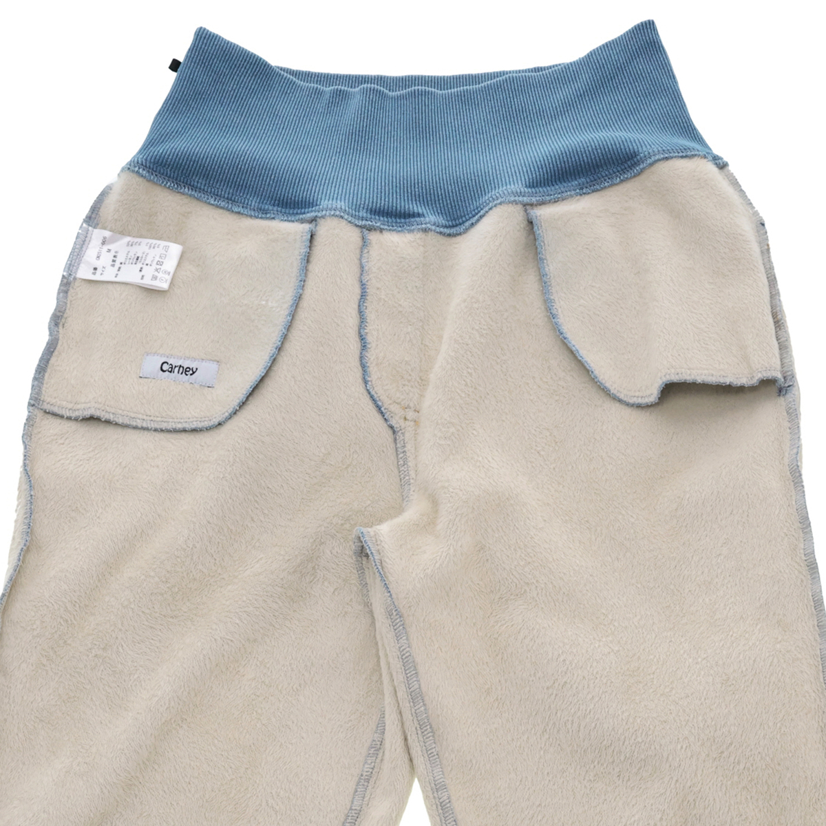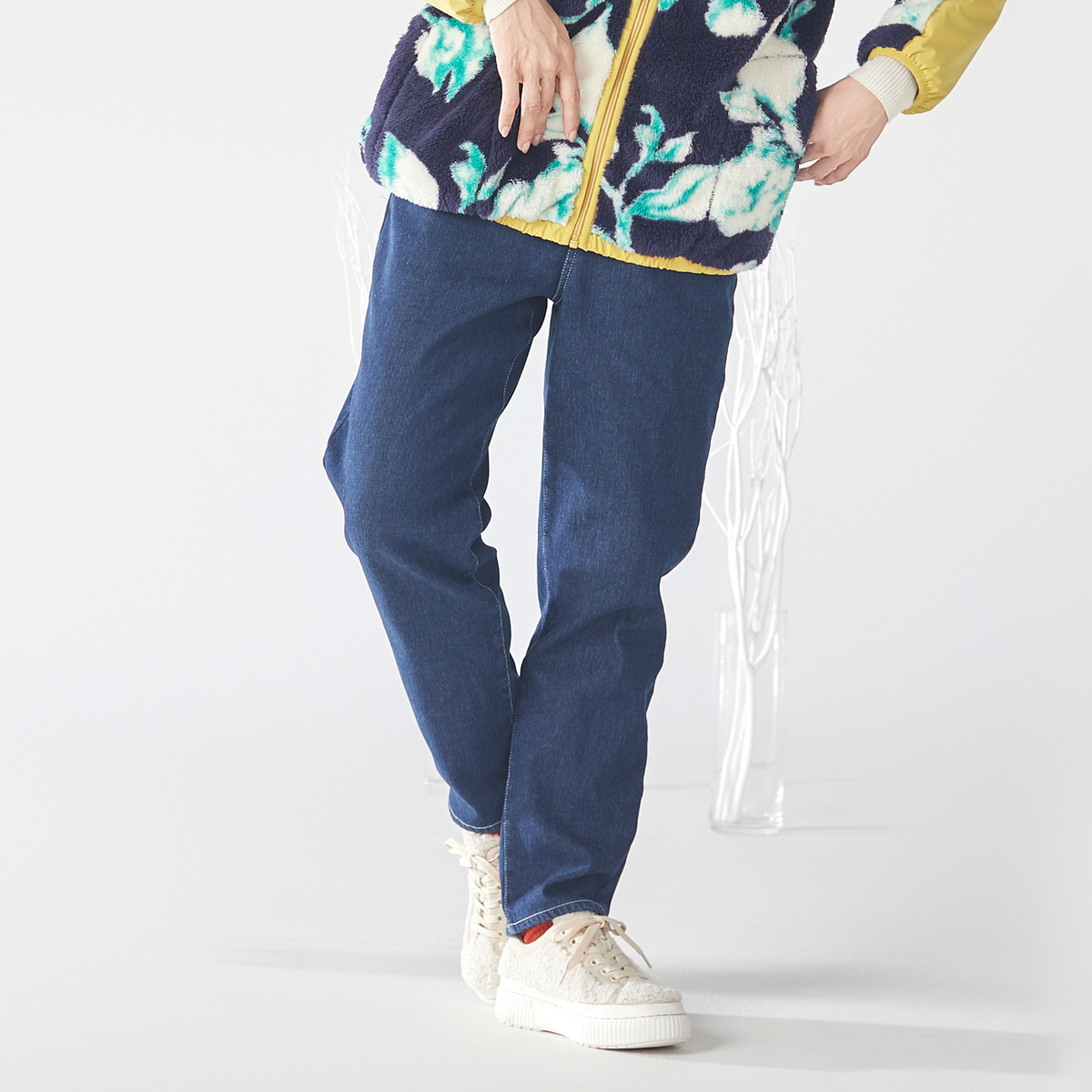 裏面にボアをボンディングした、あたたかなテーパードパンツ。ストレッチ性のあるデニム素材を使用しています。ウエストはスパンテレコを使用し、ストレスを感じにくいハラマキ仕様にしました