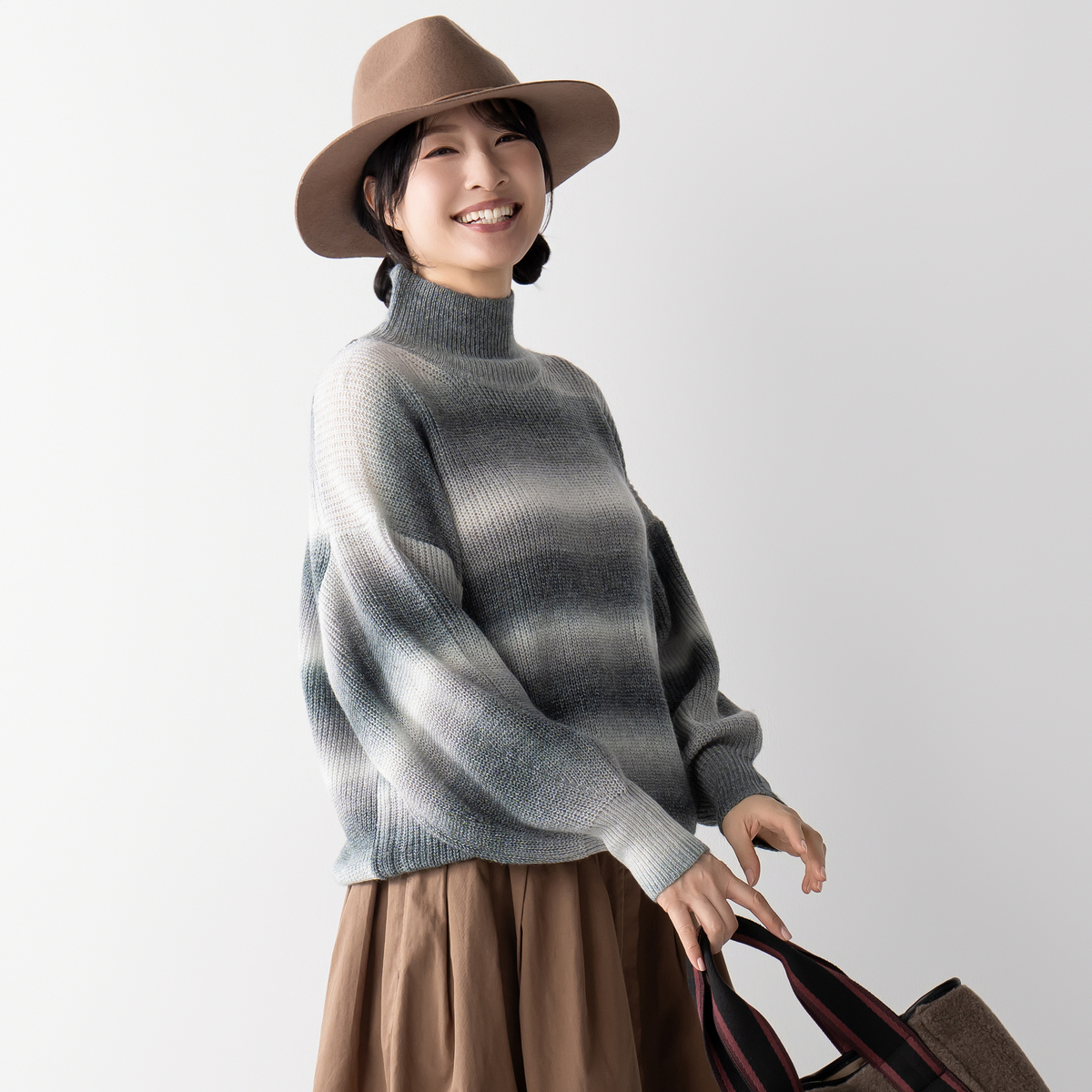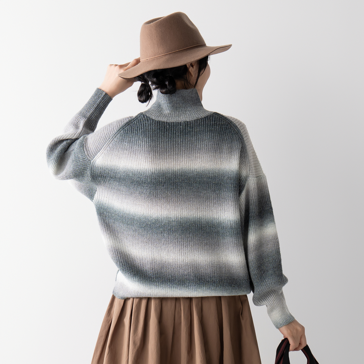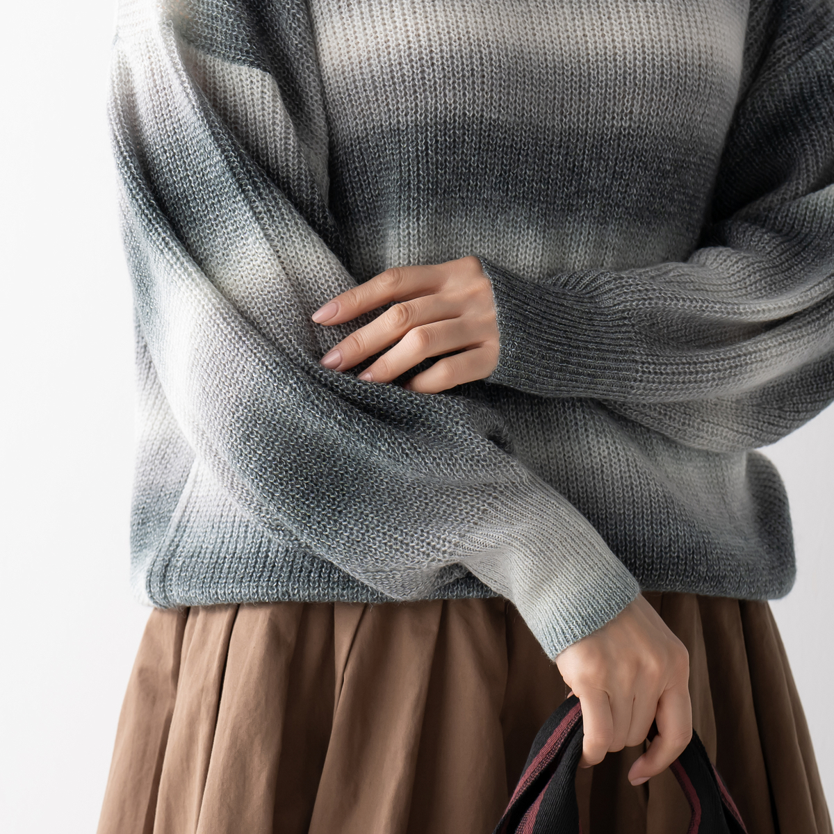 ウール混モヘヤタッチの糸を使用し、グラデーションに編み上がるよう染めたプリントヤーンで仕上げたニットプルオーバー。ざっくりとした畦編みが、素材の風合いと色使いを引き立てます