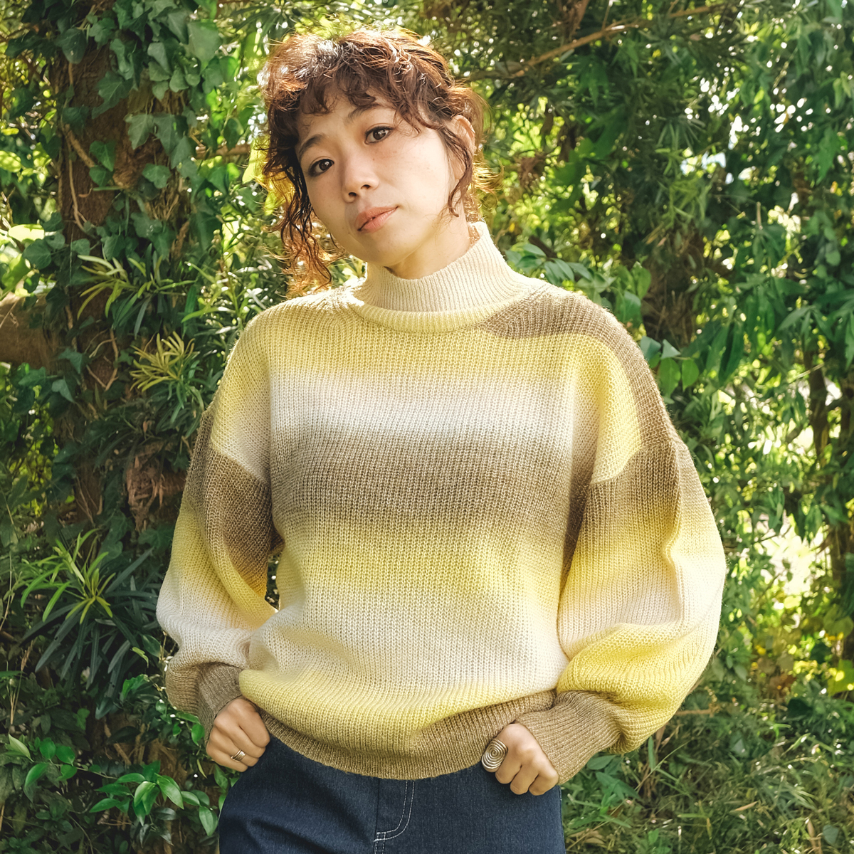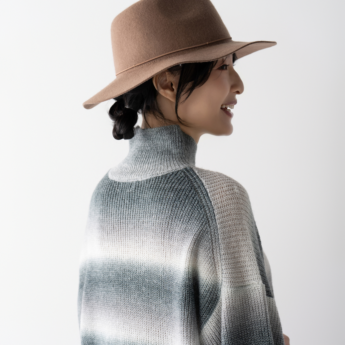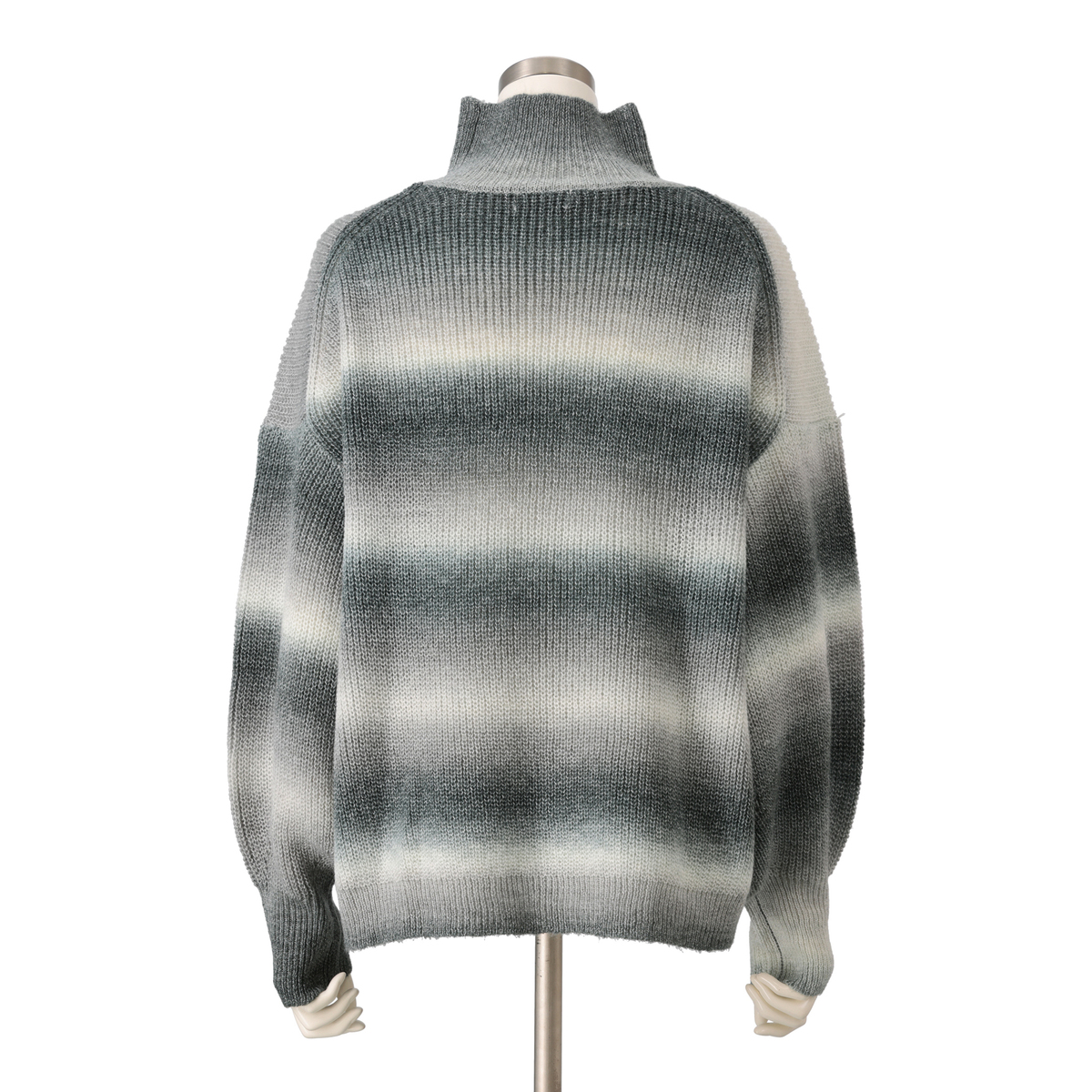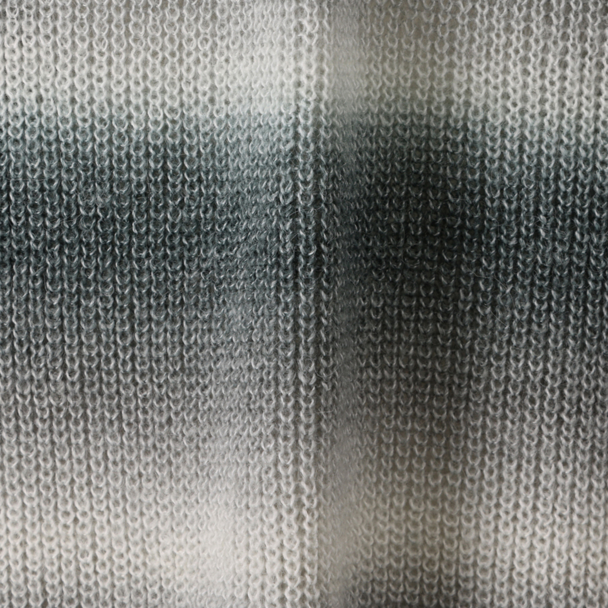 ウール混モヘヤタッチの糸を使用し、グラデーションに編み上がるよう染めたプリントヤーンで仕上げたニットプルオーバー。ざっくりとした畦編みが、素材の風合いと色使いを引き立てます
