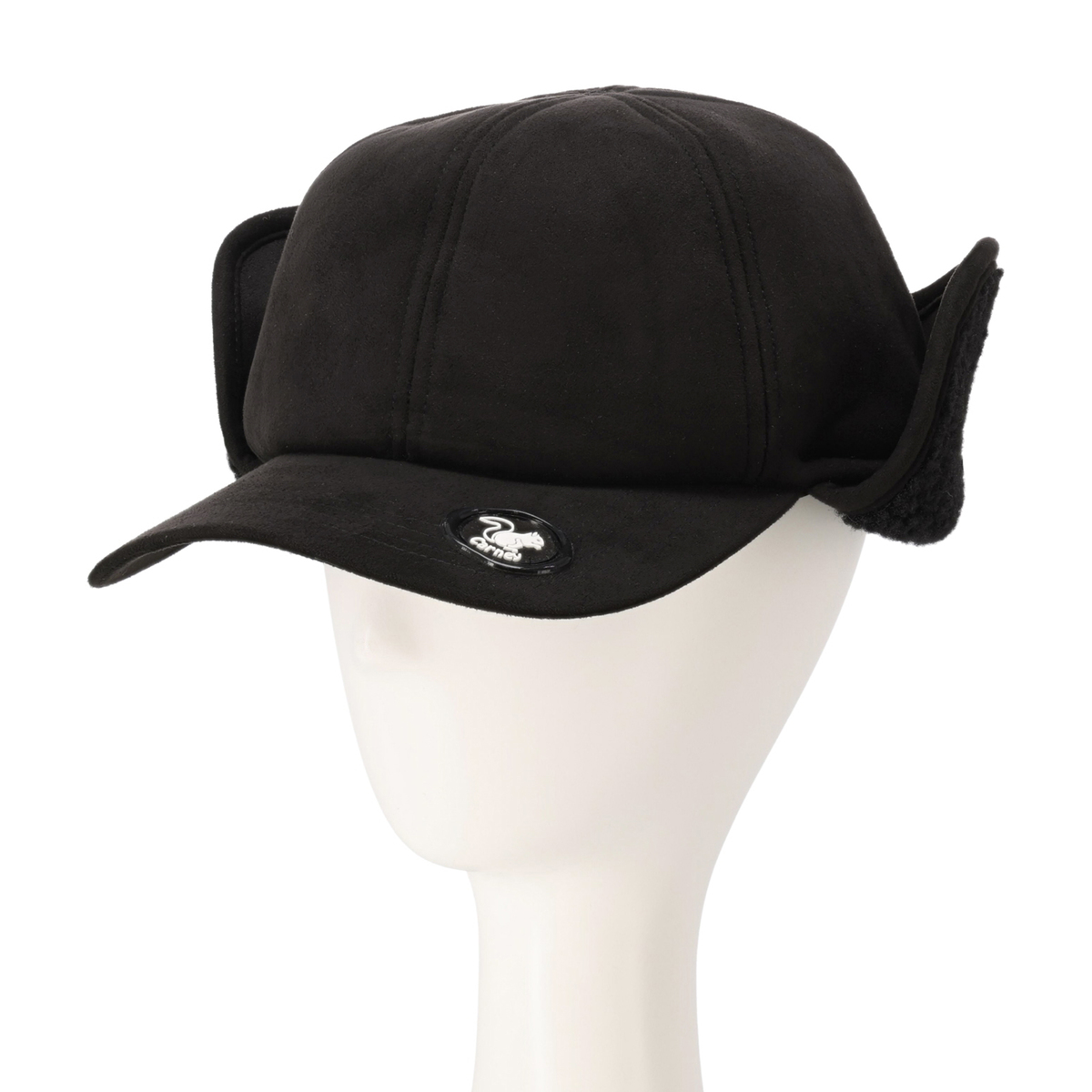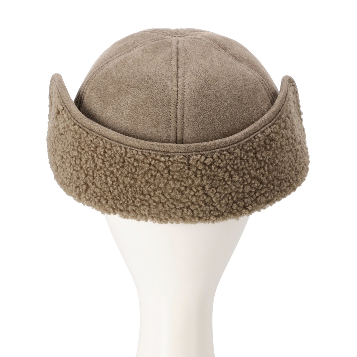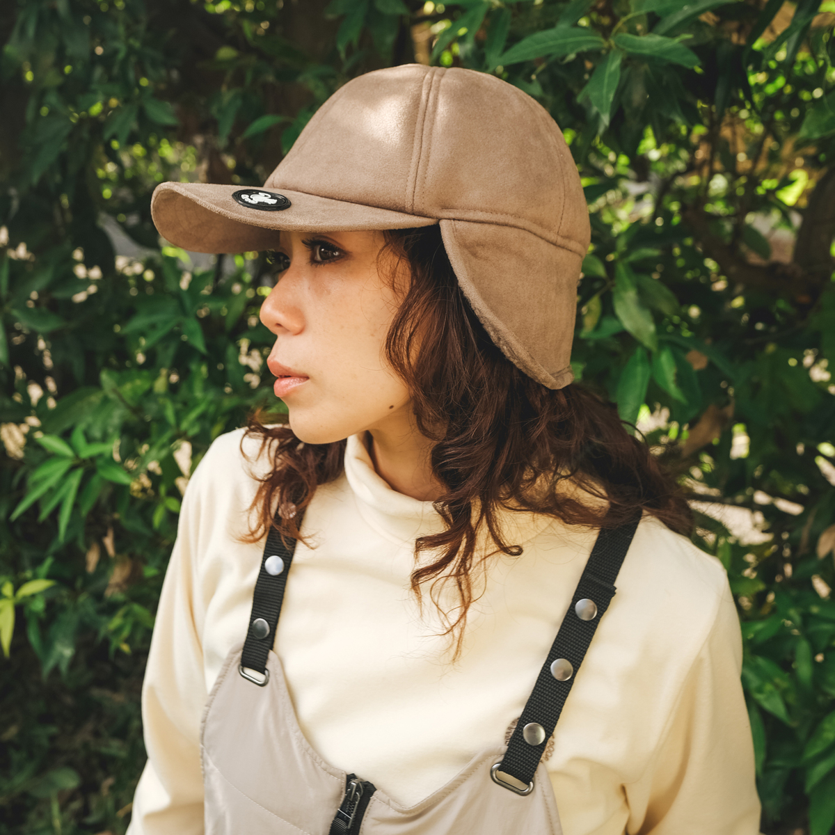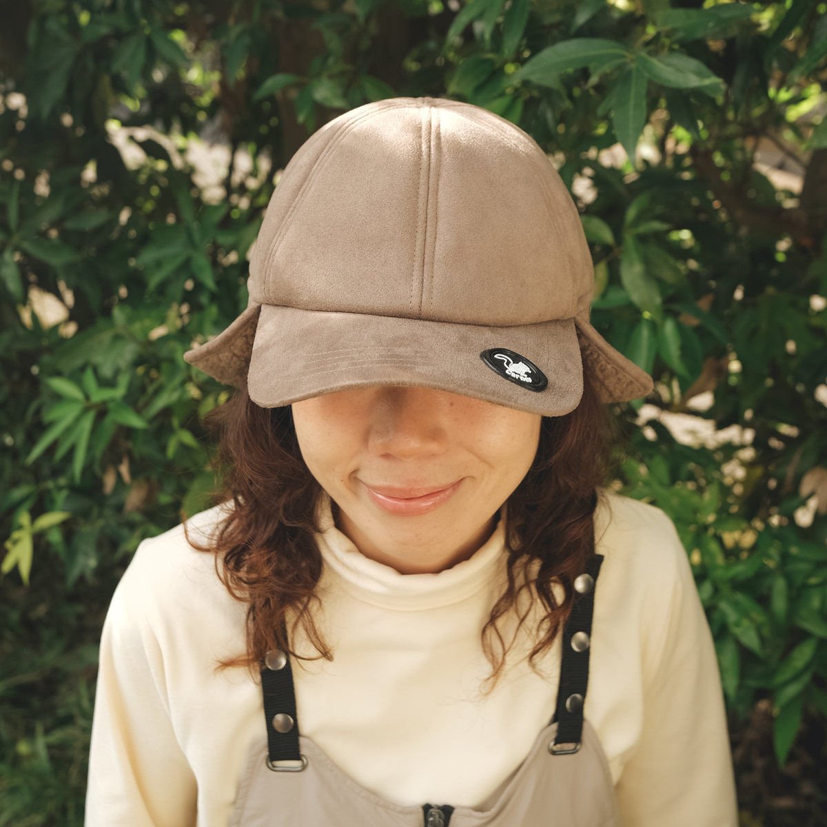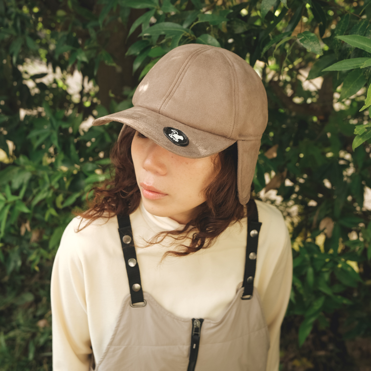 フェイクスエードに、耳当て部分はボアをボンディングしたフェイクムートンを使用したアビエイターキャップ。防寒性とデザイン性を兼ね備え、ブリム左先にはCarney定番のシリコンワッペンを配置。手洗い可能でデイリー使いに便利です
